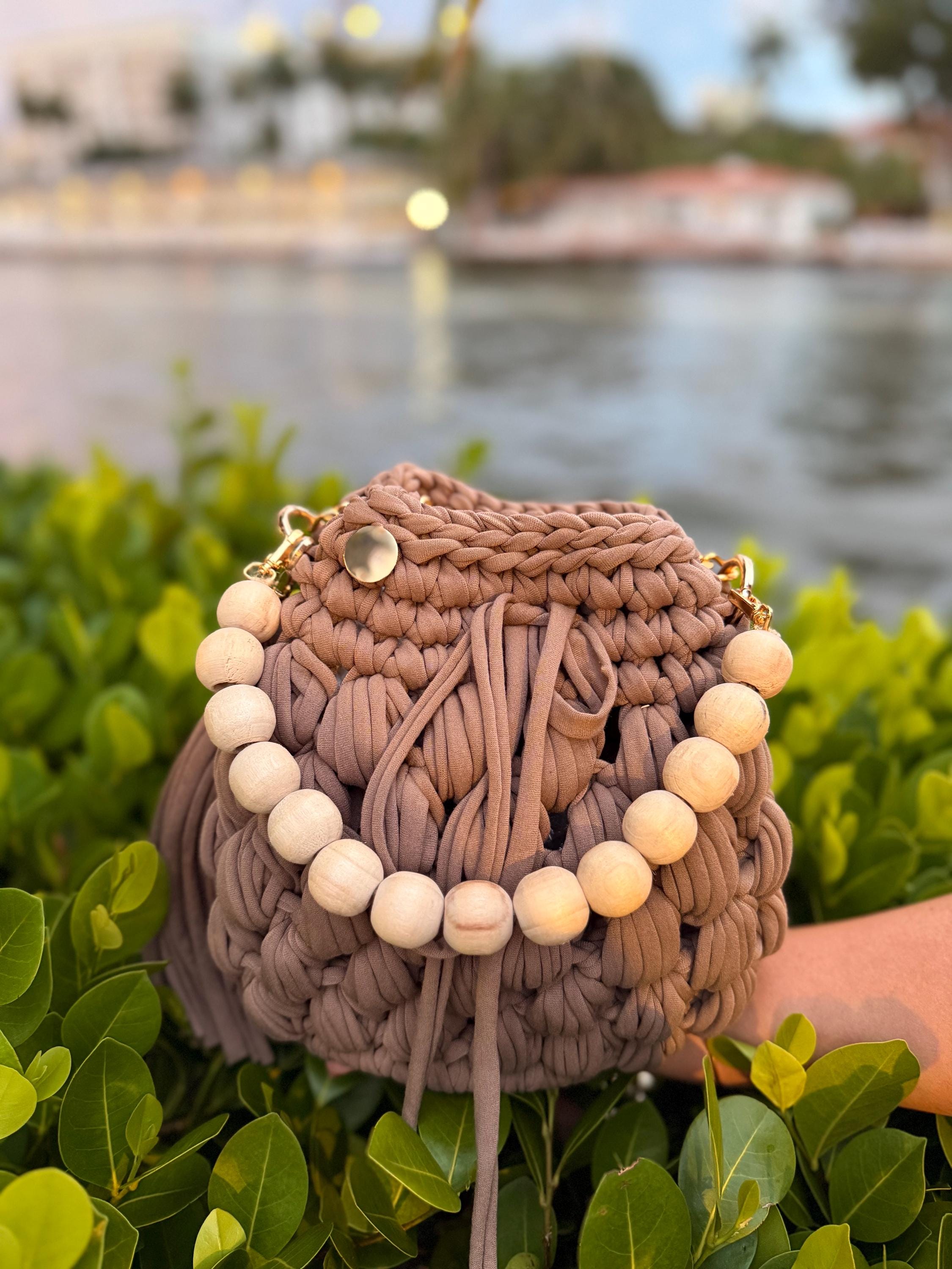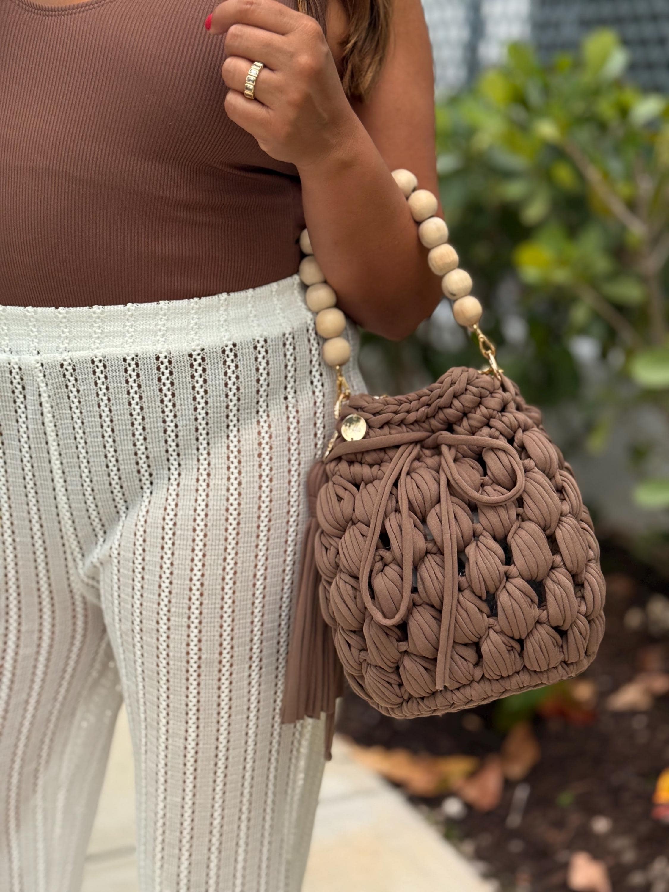 "Espresso Me Later" Handcrafted Crochet Bucket Bag - Organic Cotton Boho Crossbody with Wooden Bead Handle