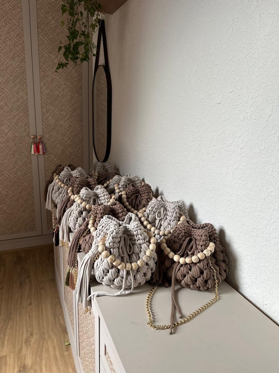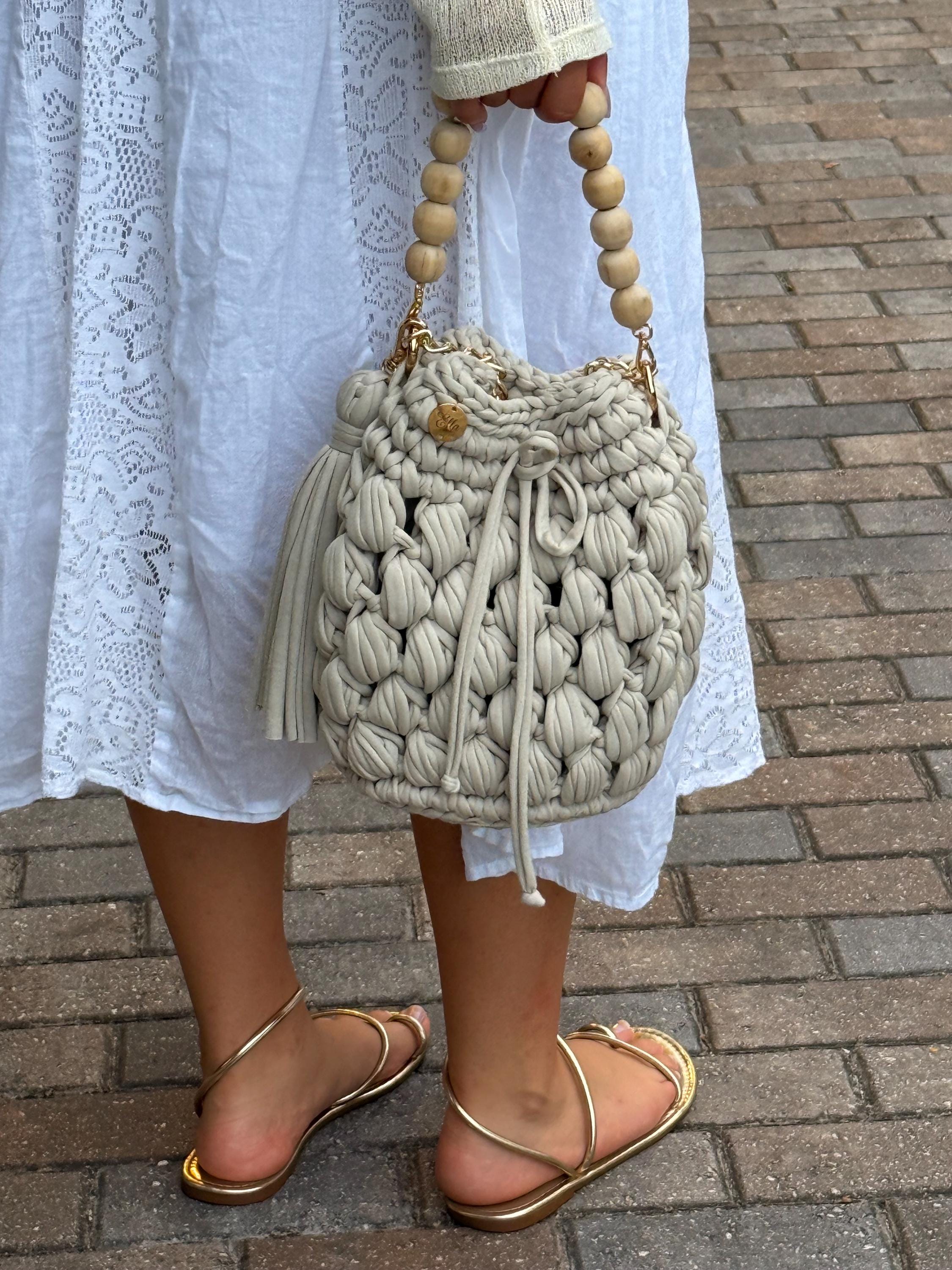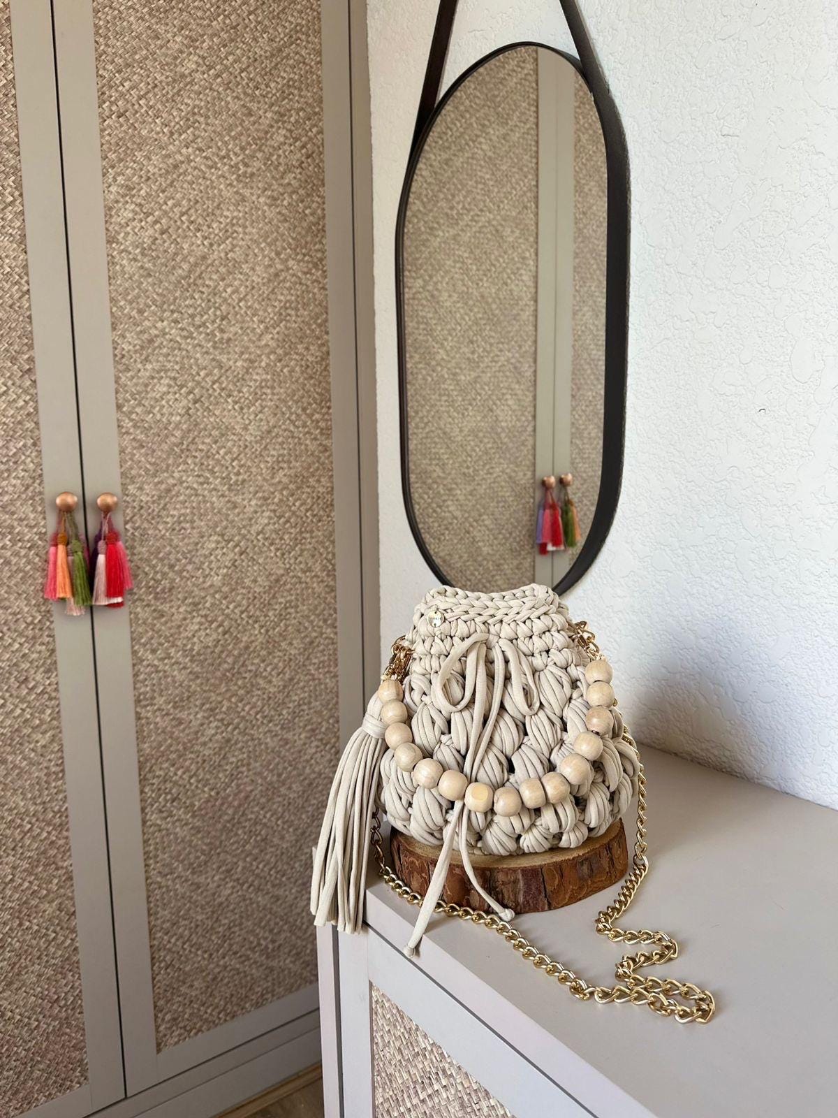 - Handcrafted organic cotton crochet bag - Sustainable boho bucket bag with wooden beads - Eco-friendly artisan made crossbody purse - Natural dye crochet handbag with tassel - Organic cotton bohemian festival bag