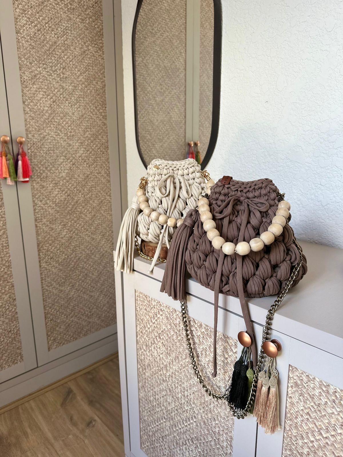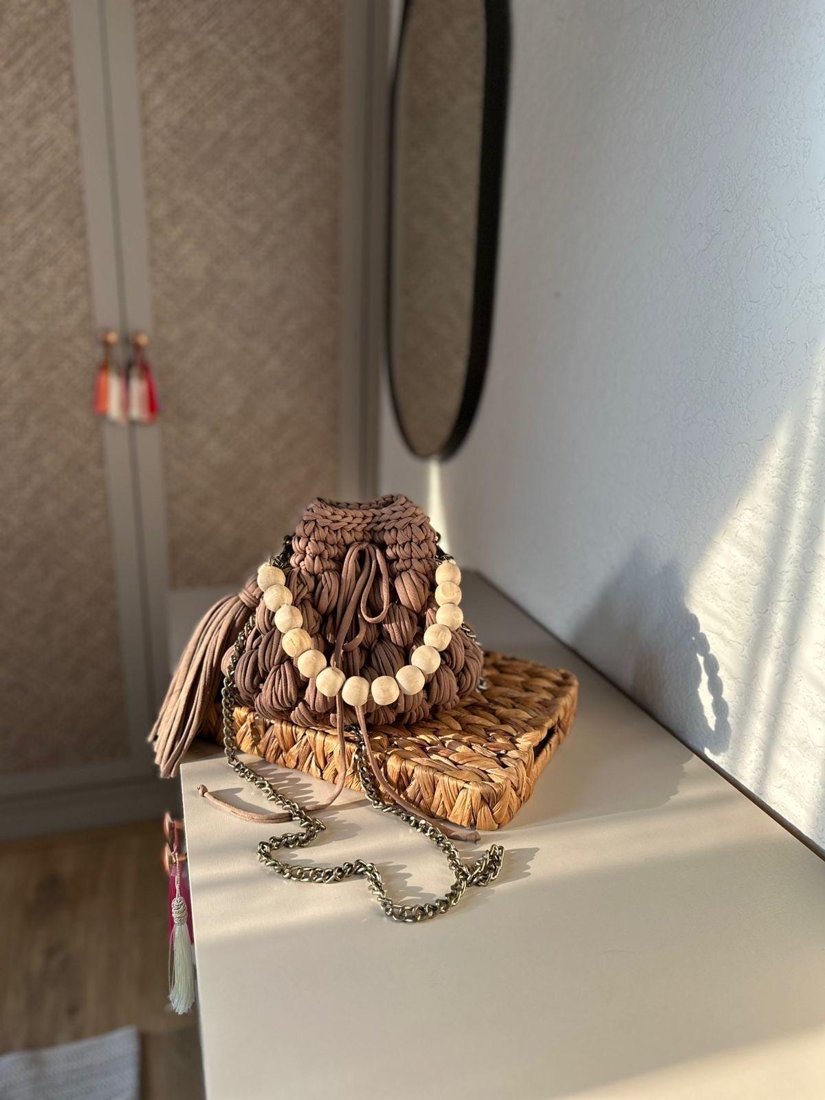 - "Espresso Me Later" Handmade Crochet Bucket Bag | Organic Cotton Boho Crossbody | Sustainable Handbag - Artisan Crochet Bag "Espresso Me Later" | Wooden Bead Handle | Eco-Friendly Cotton Purse - Handcrafted Boho Bag | Organic Cotton Crochet | Removable Tassel | Sustainable Fashion