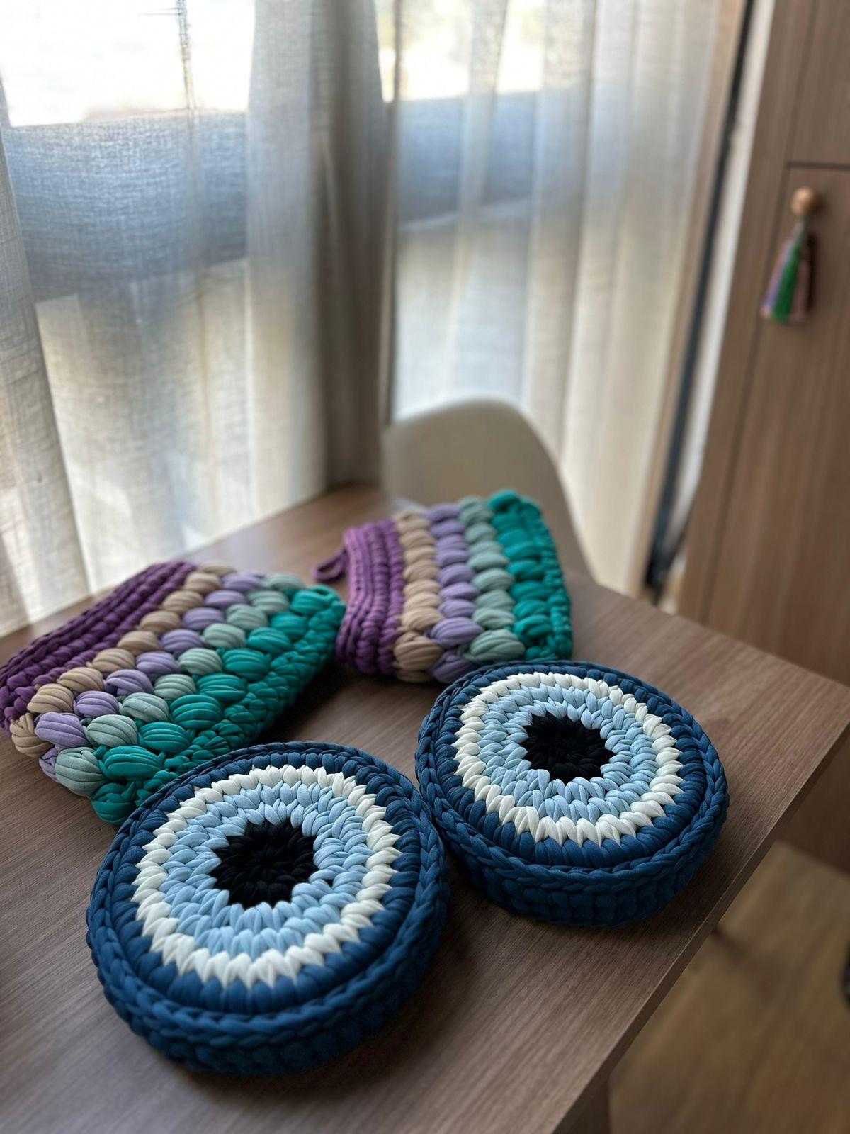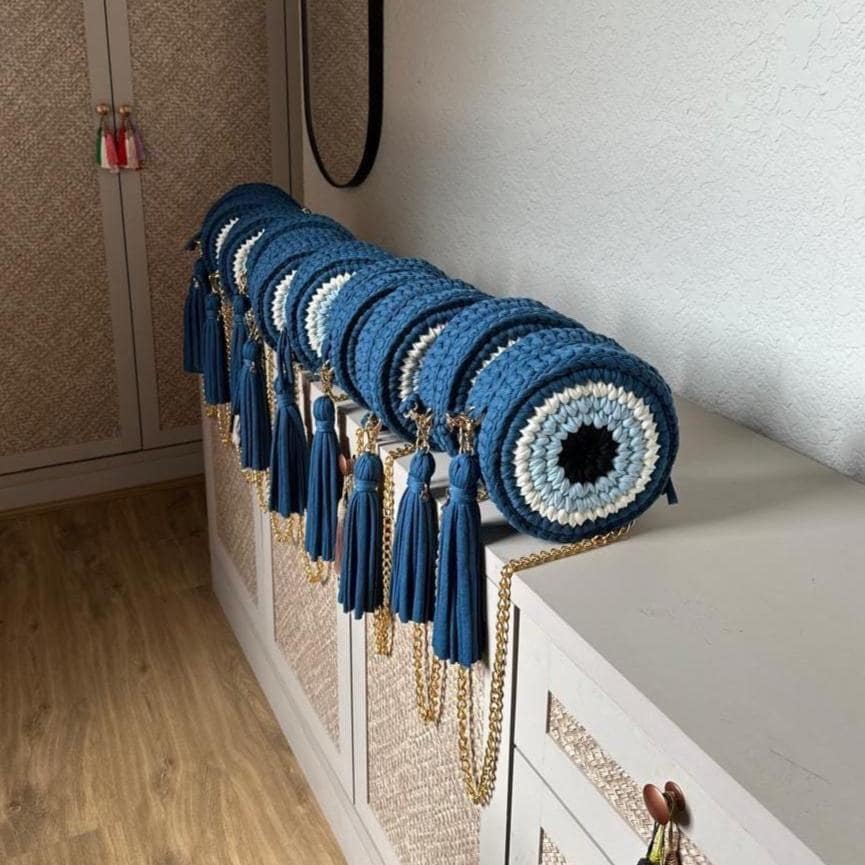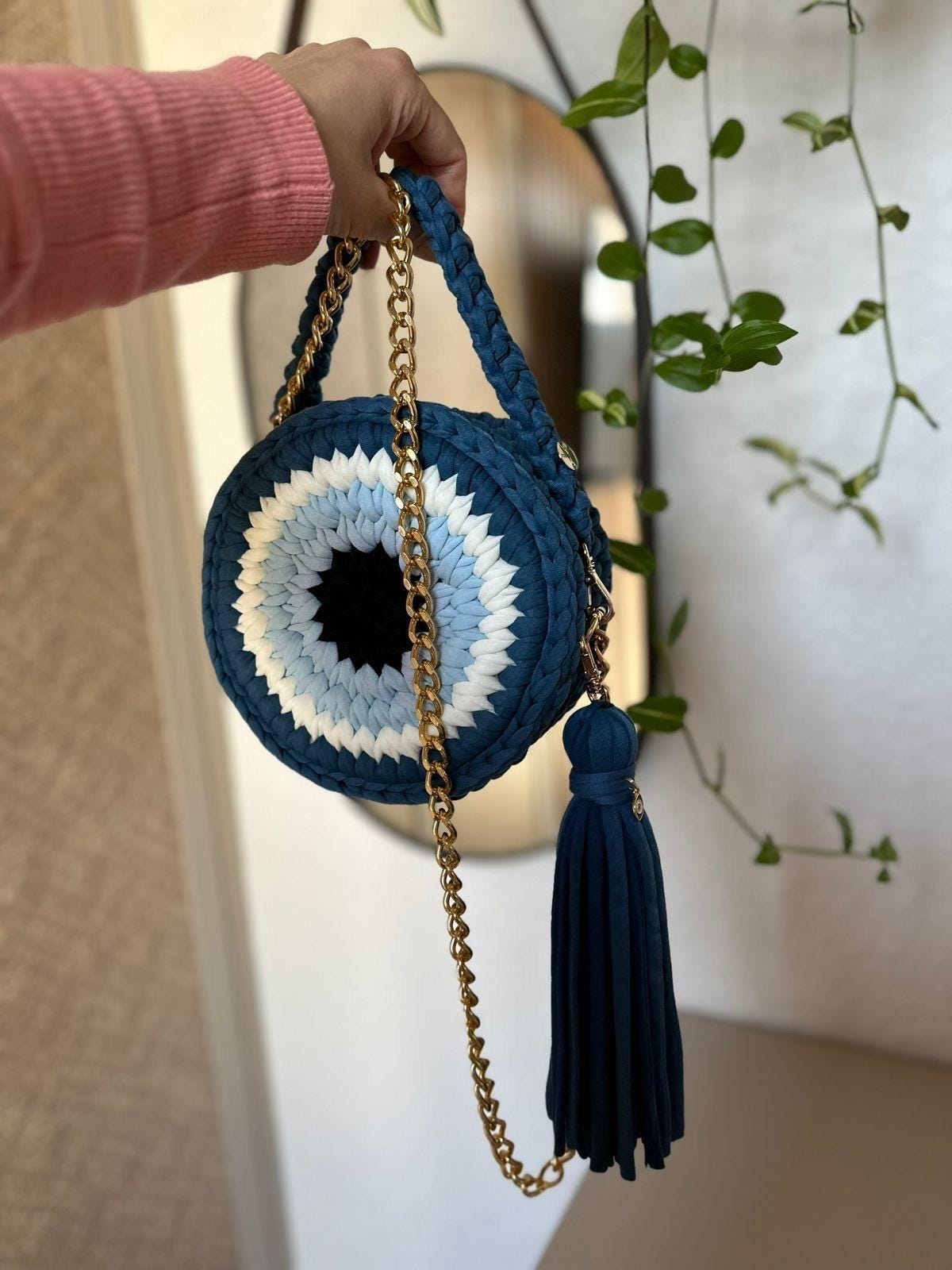1. "My Eye Sees You - Handmade Crochet Evil Eye Handbag with Removable Tassel | Sustainable Cotton Bohemian Purse" 2. "Handcrafted Evil Eye Crochet Bag - Eco-Friendly Cotton Handbag with Brass Chain | Bohemian Artisan Purse" 3. "Sustainable Crochet Handbag - Evil Eye Design | Handmade Cotton Purse with Tassel | Boho Crossbody Bag"