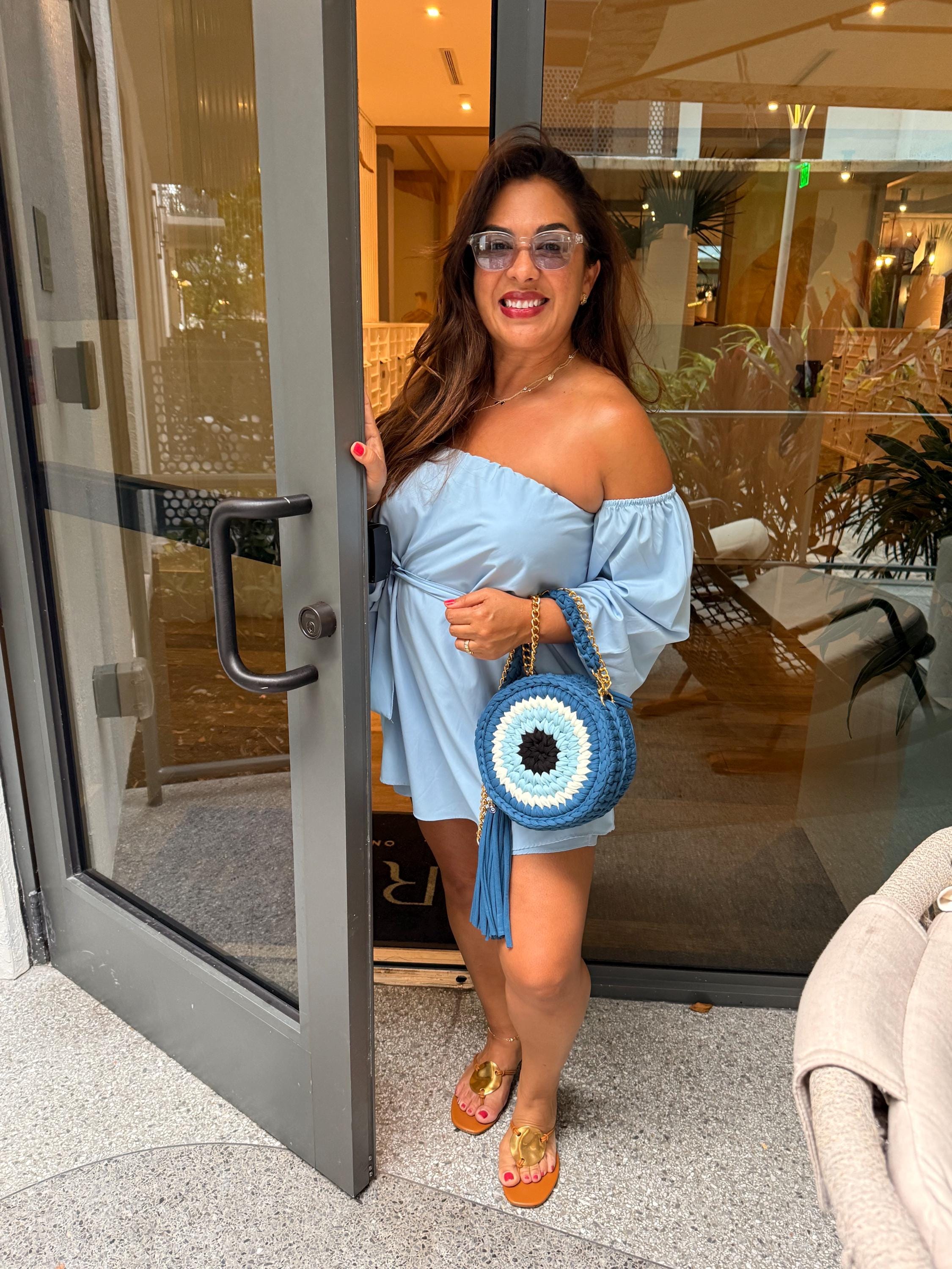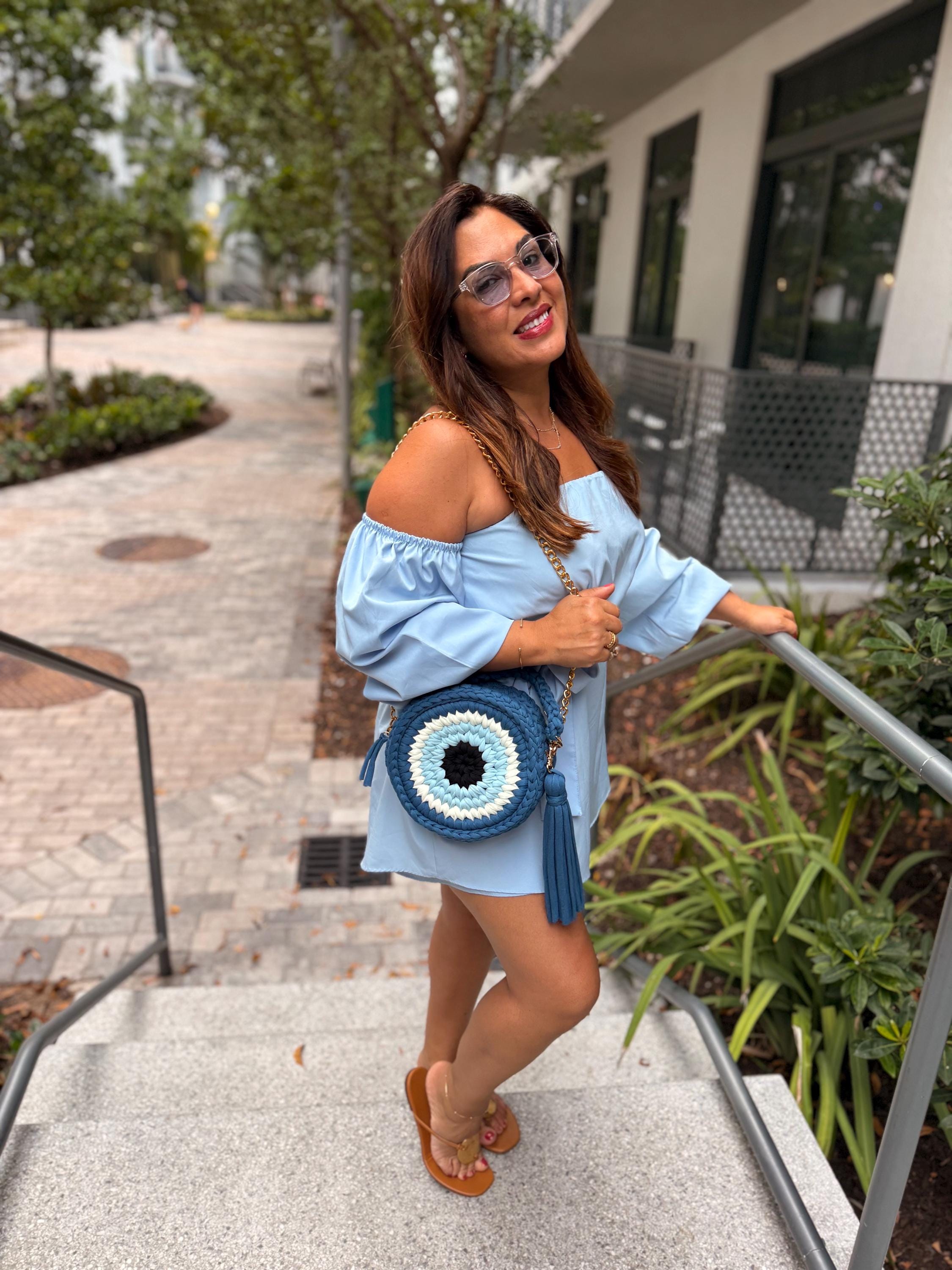 Step into a world where ancient craftsmanship meets modern bohemian style with our stunning "My Eye Sees You" crochet handbag. This captivating piece transforms the mystical evil eye symbol into wearable art that protects and empowers.