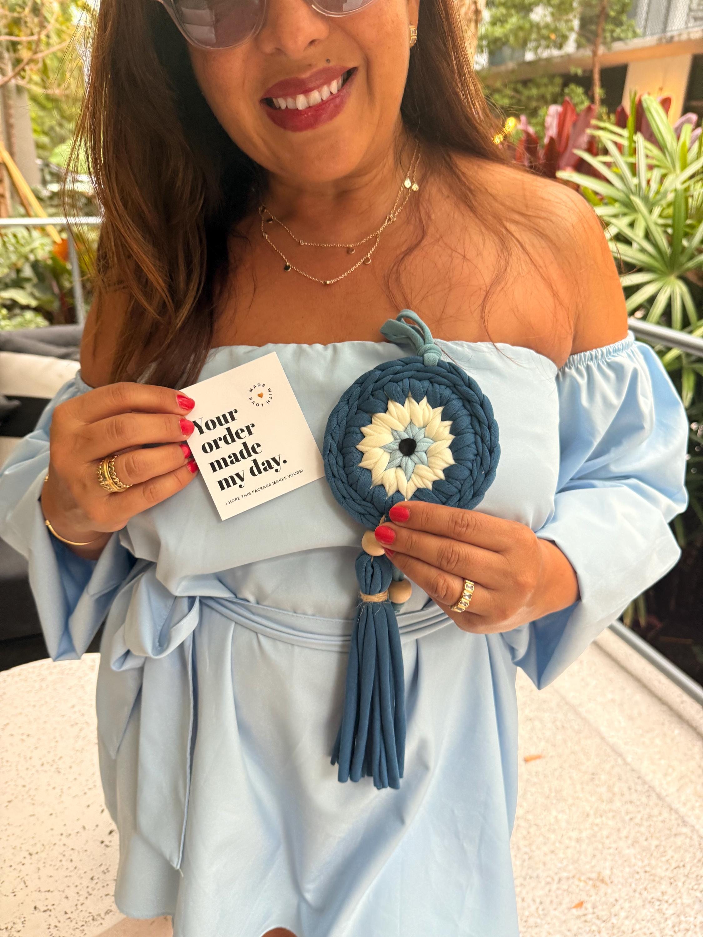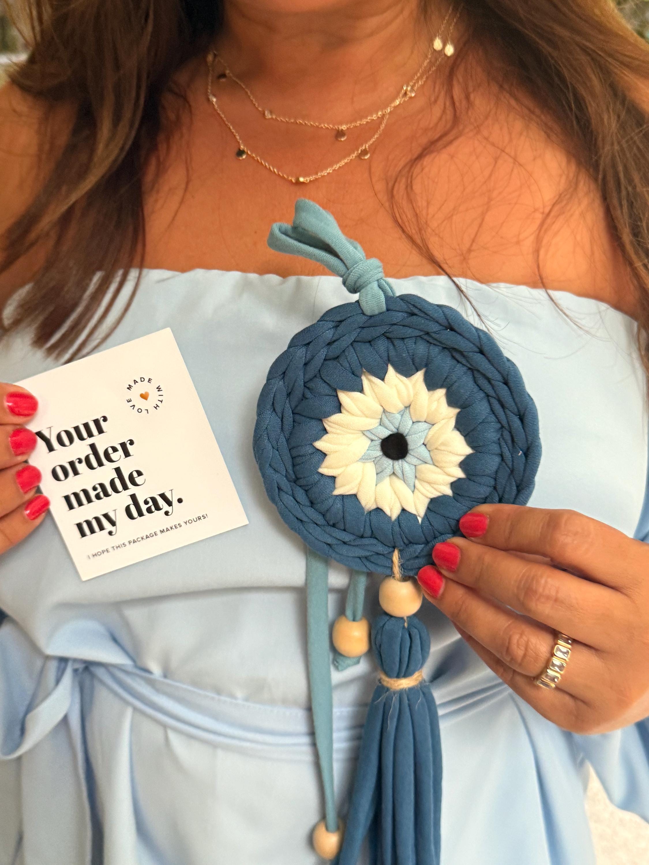 **✨ Artisan Excellence** Every delicate stitch is a labor of love, meticulously crafted entirely by hand using time-honored crochet techniques. The captivating evil eye design features stunning concentric circles in deep ocean navy, soft powder blue, and pristine white, creating a mesmerizing focal point that draws admiring glances.
