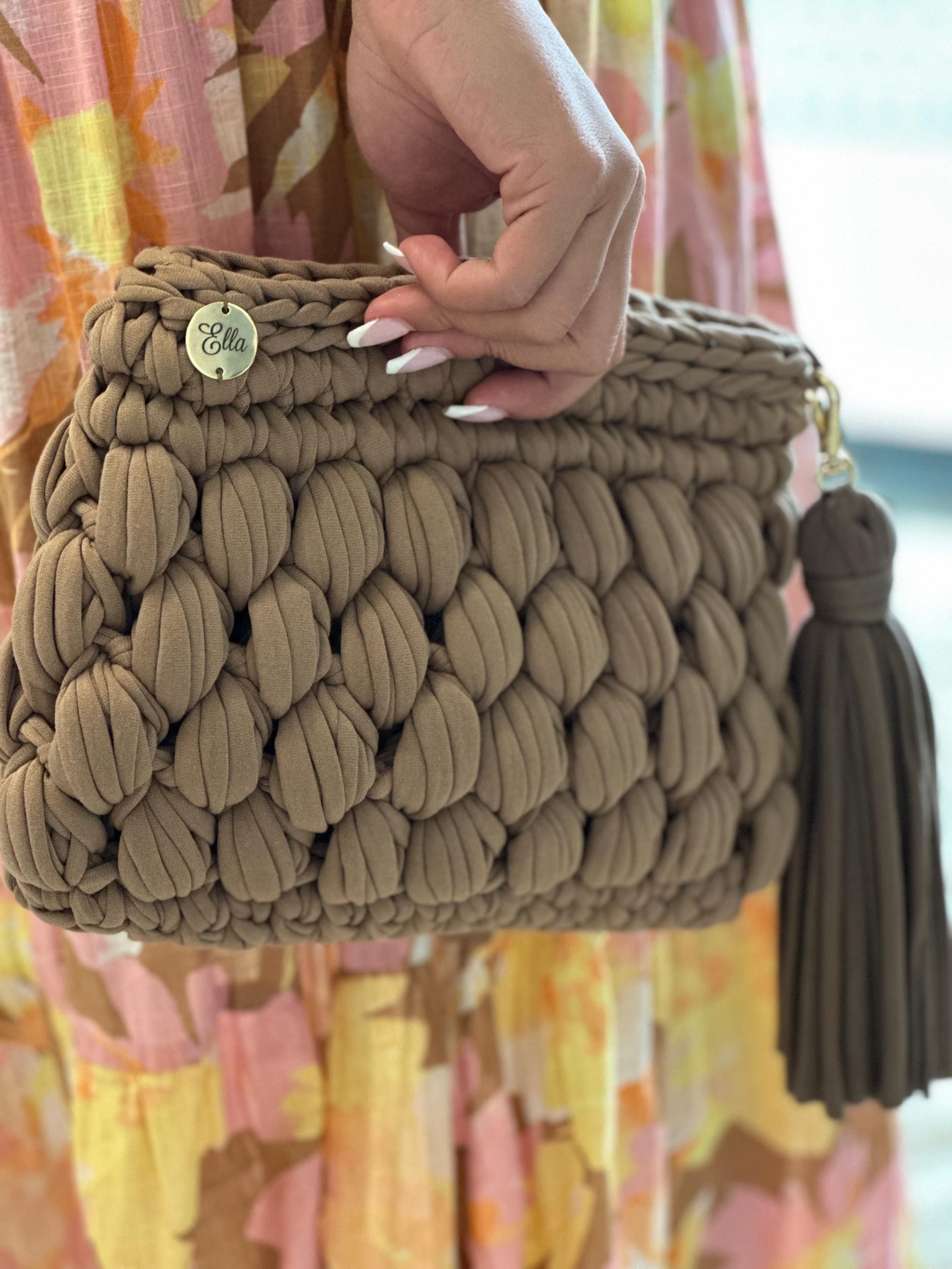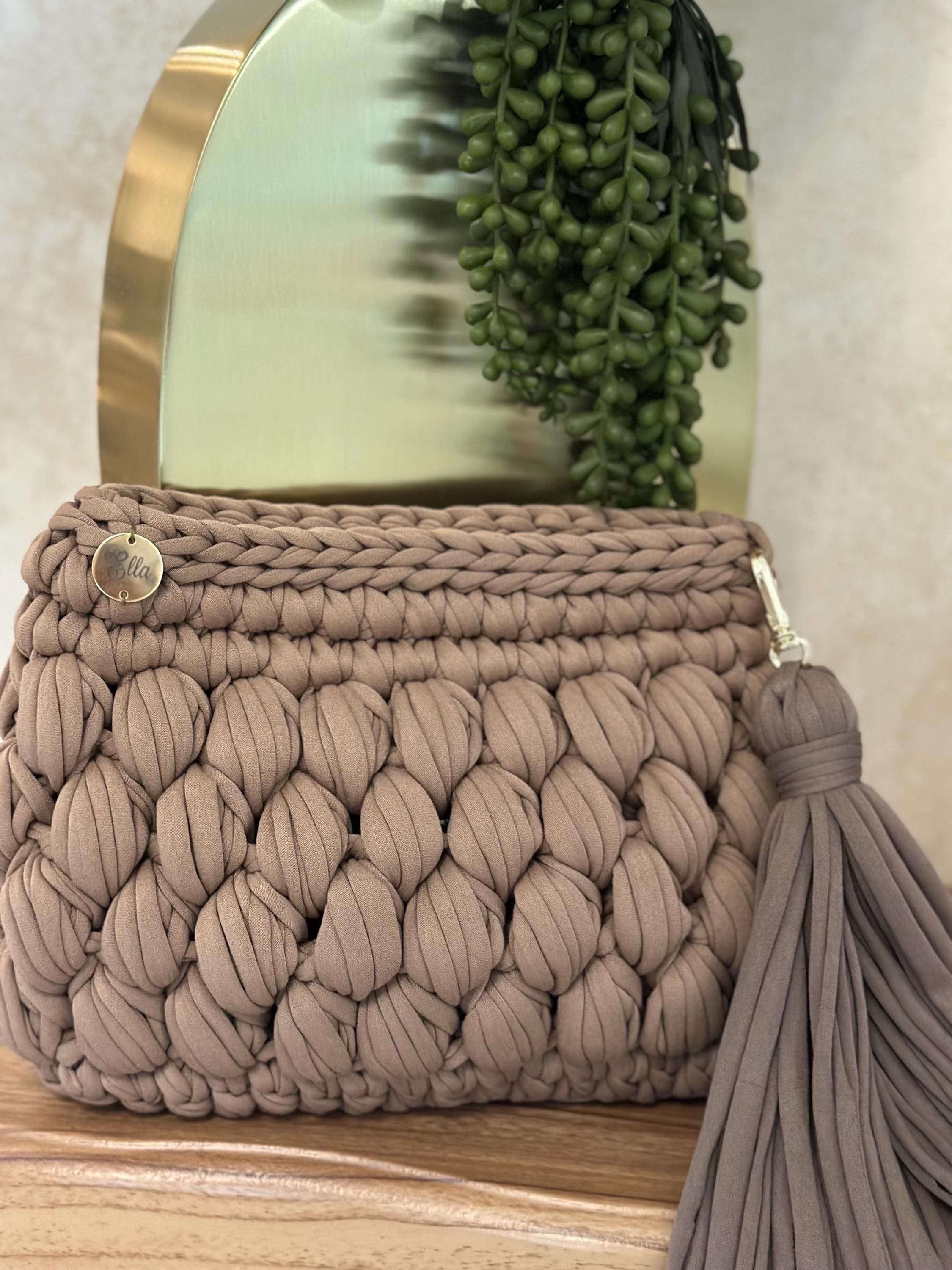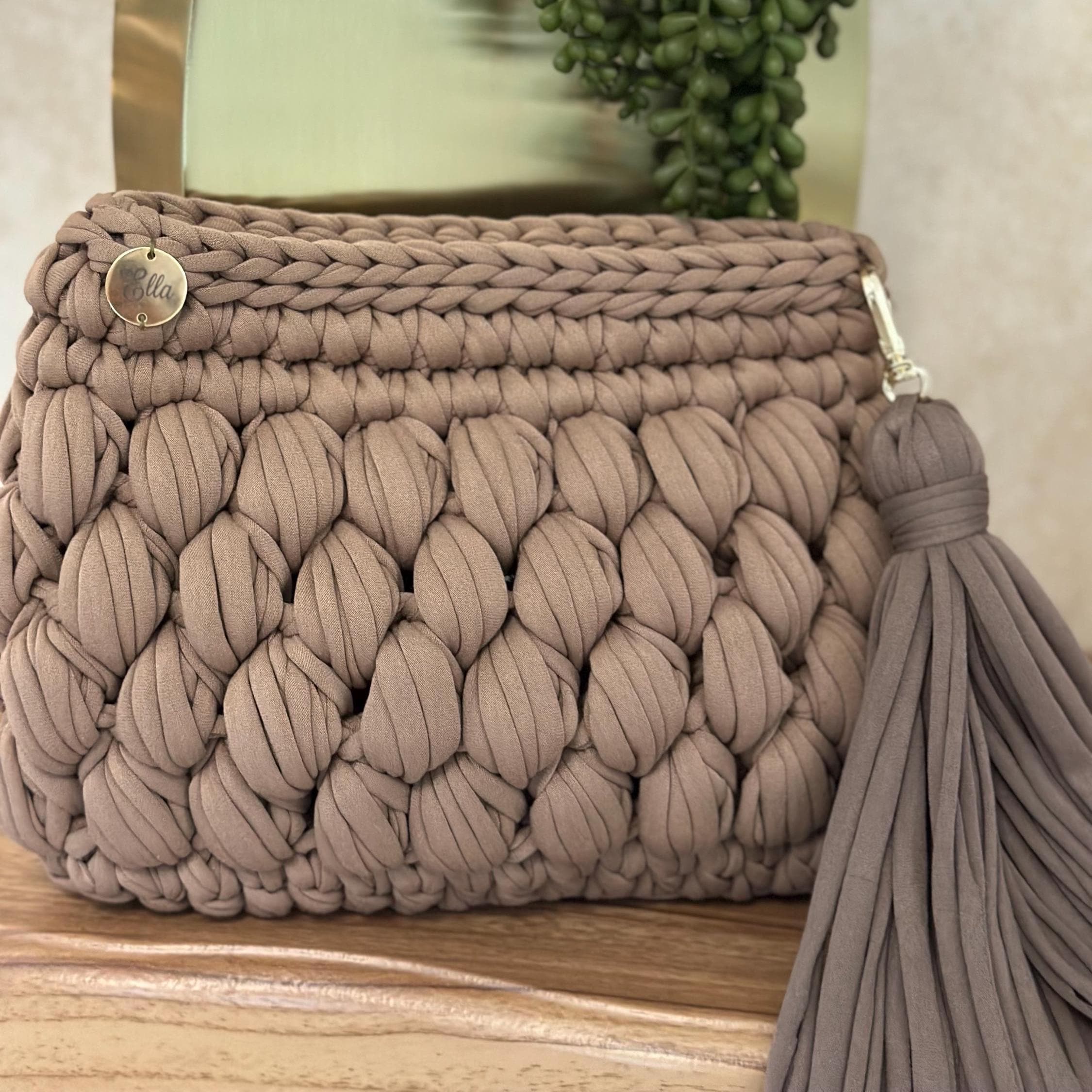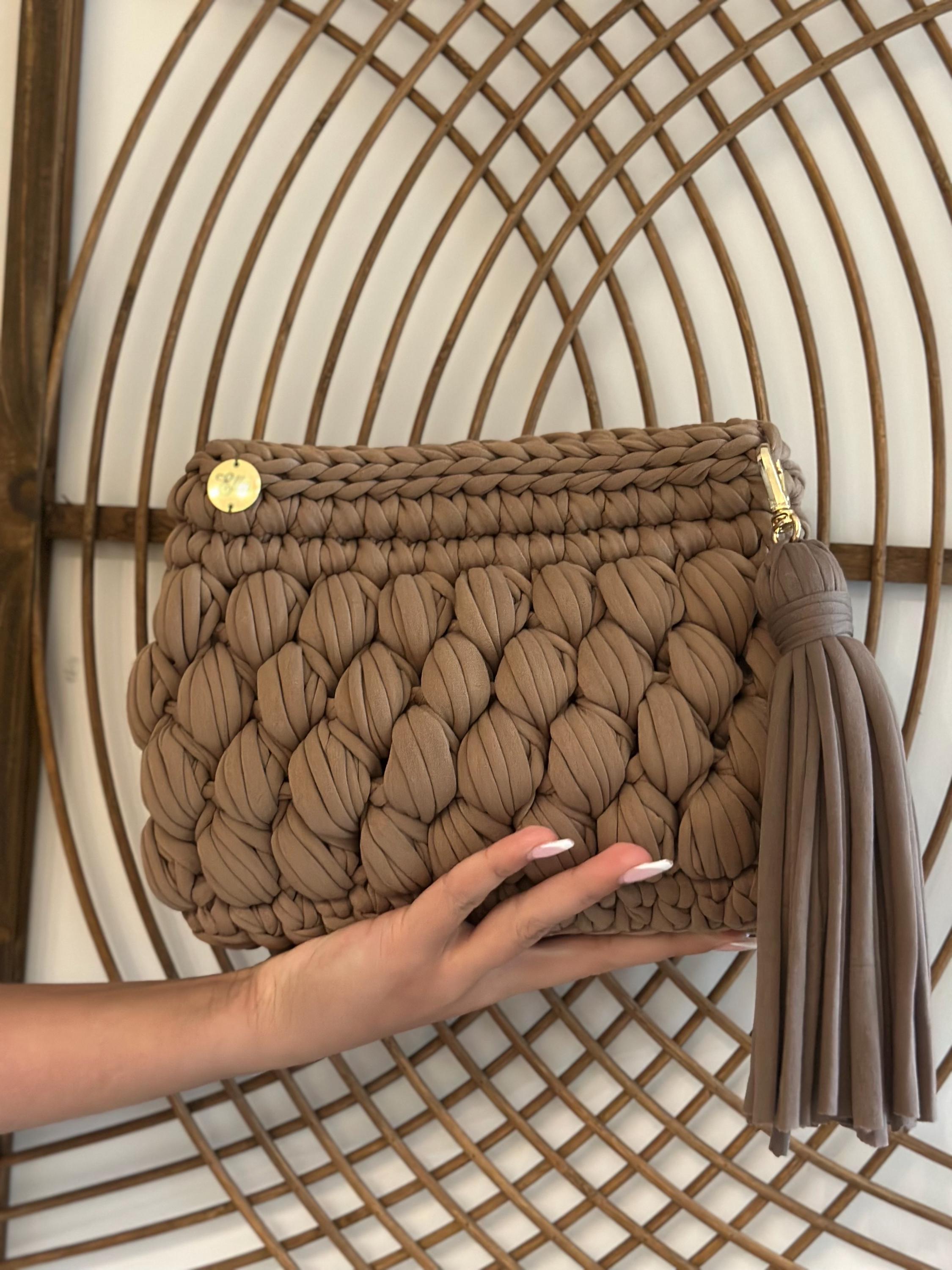 ### Long-tail Keywords: - Handmade chocolate brown crochet clutch tassel - Sustainable cotton yarn neutral clutch bag - Bohemian handcrafted brown purse textured - Organic dyed crochet clutch brown women - Unique neutral clutch handmade gift elegant - Eco conscious artisan brown accessory luxury