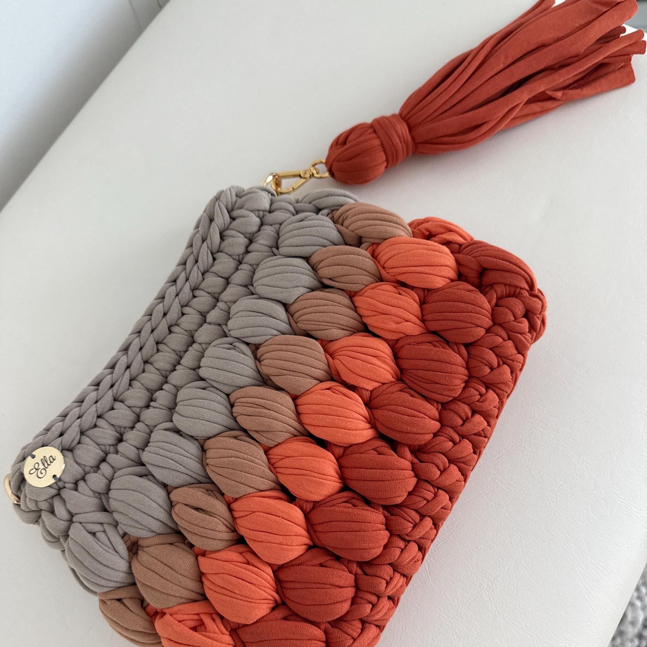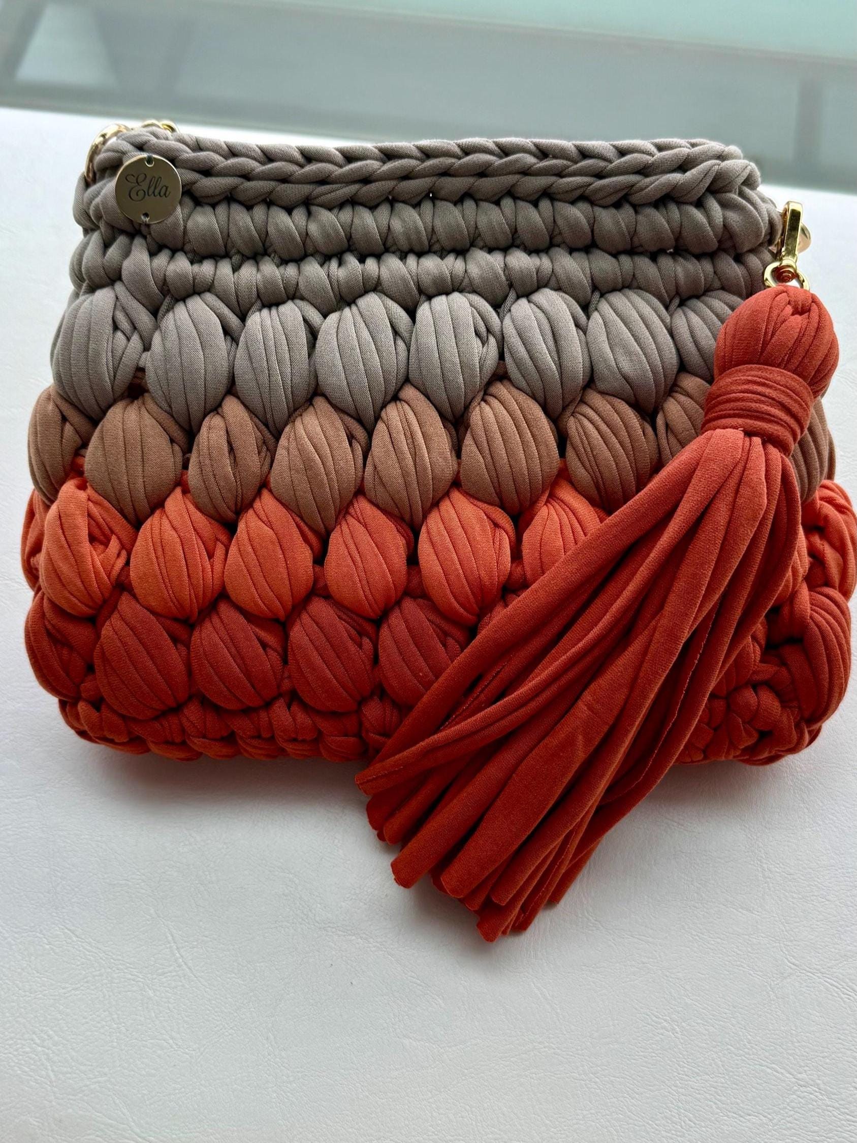Transform your everyday style with this stunning handcrafted chunky knit handbag! This eye-catching purse features a gorgeous gradient design that flows from soft grey to warm terracotta, creating a beautiful sunset-inspired ombré effect. ✨ What makes this bag special: