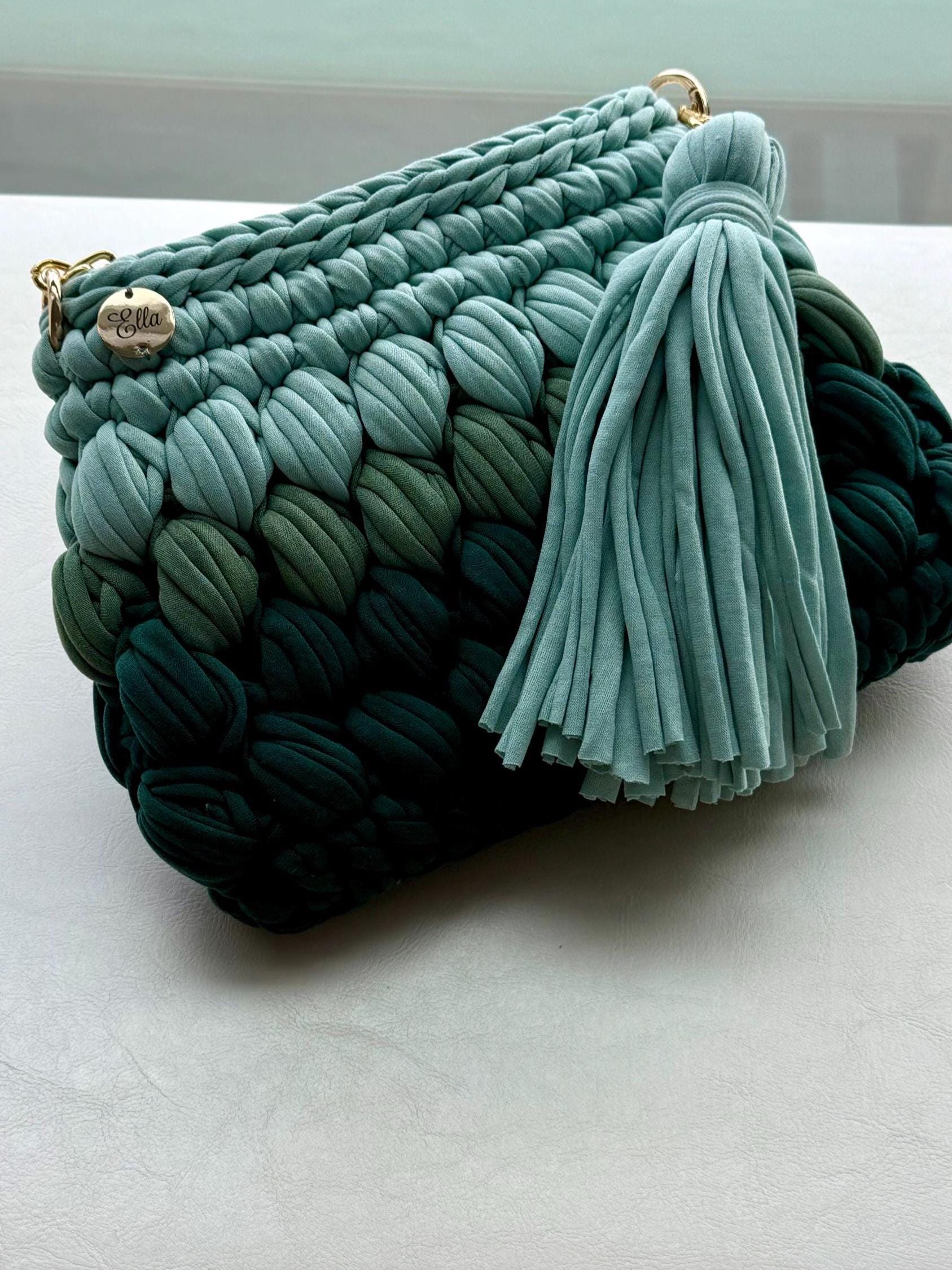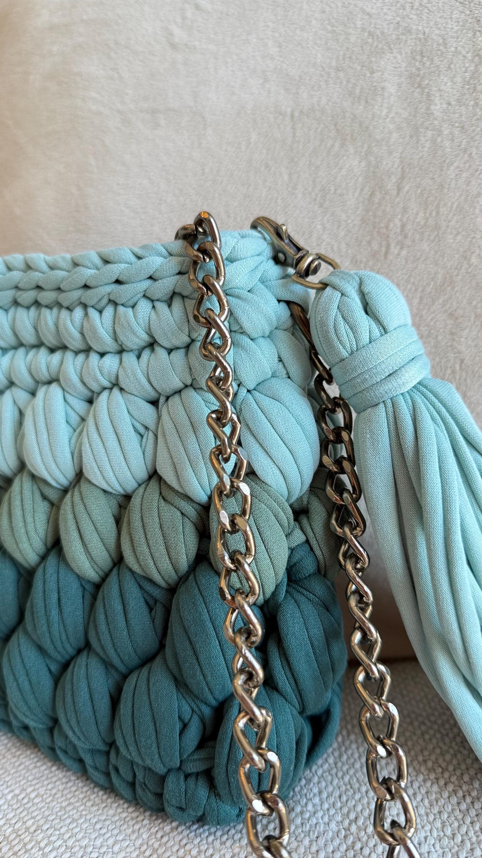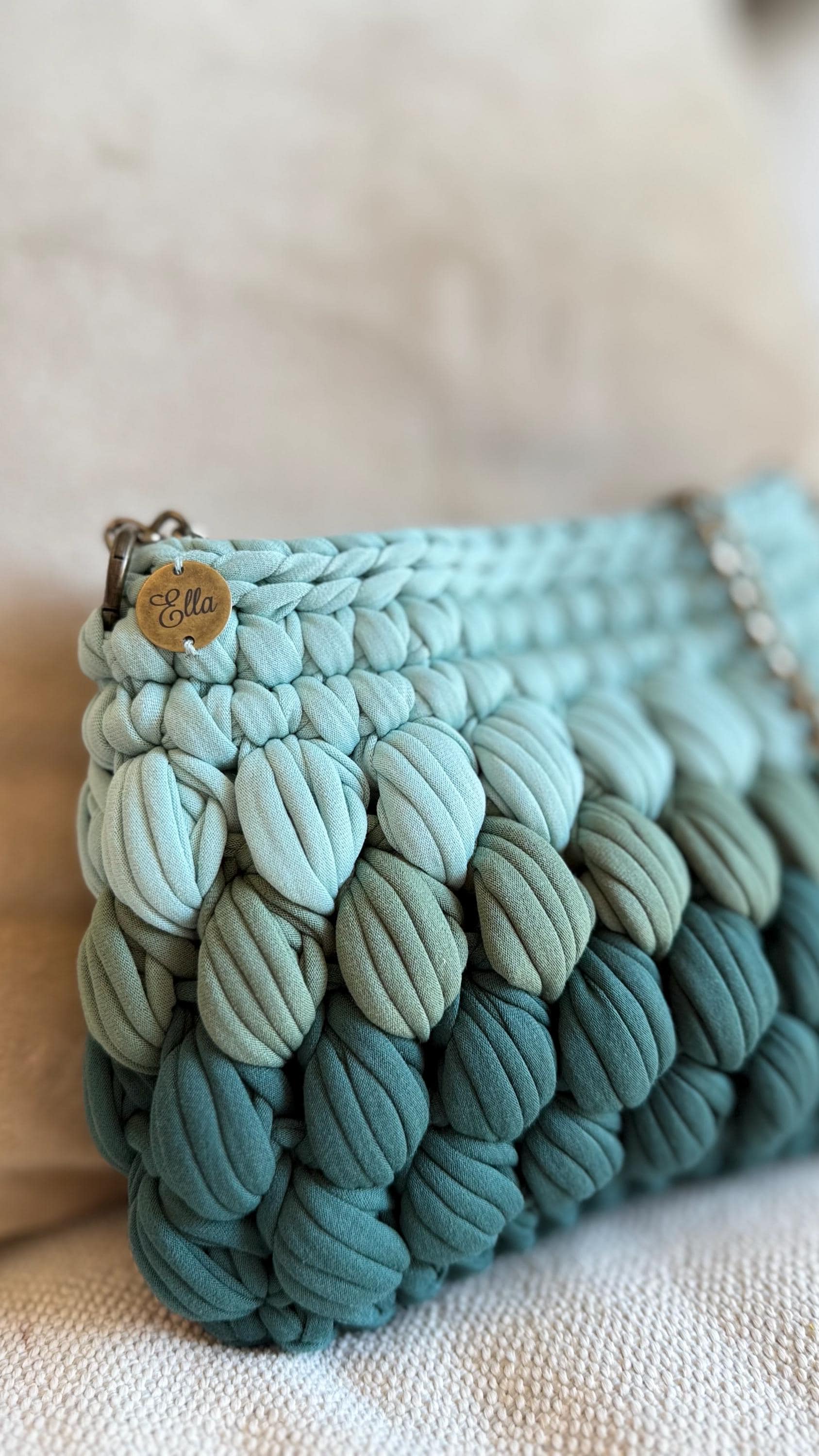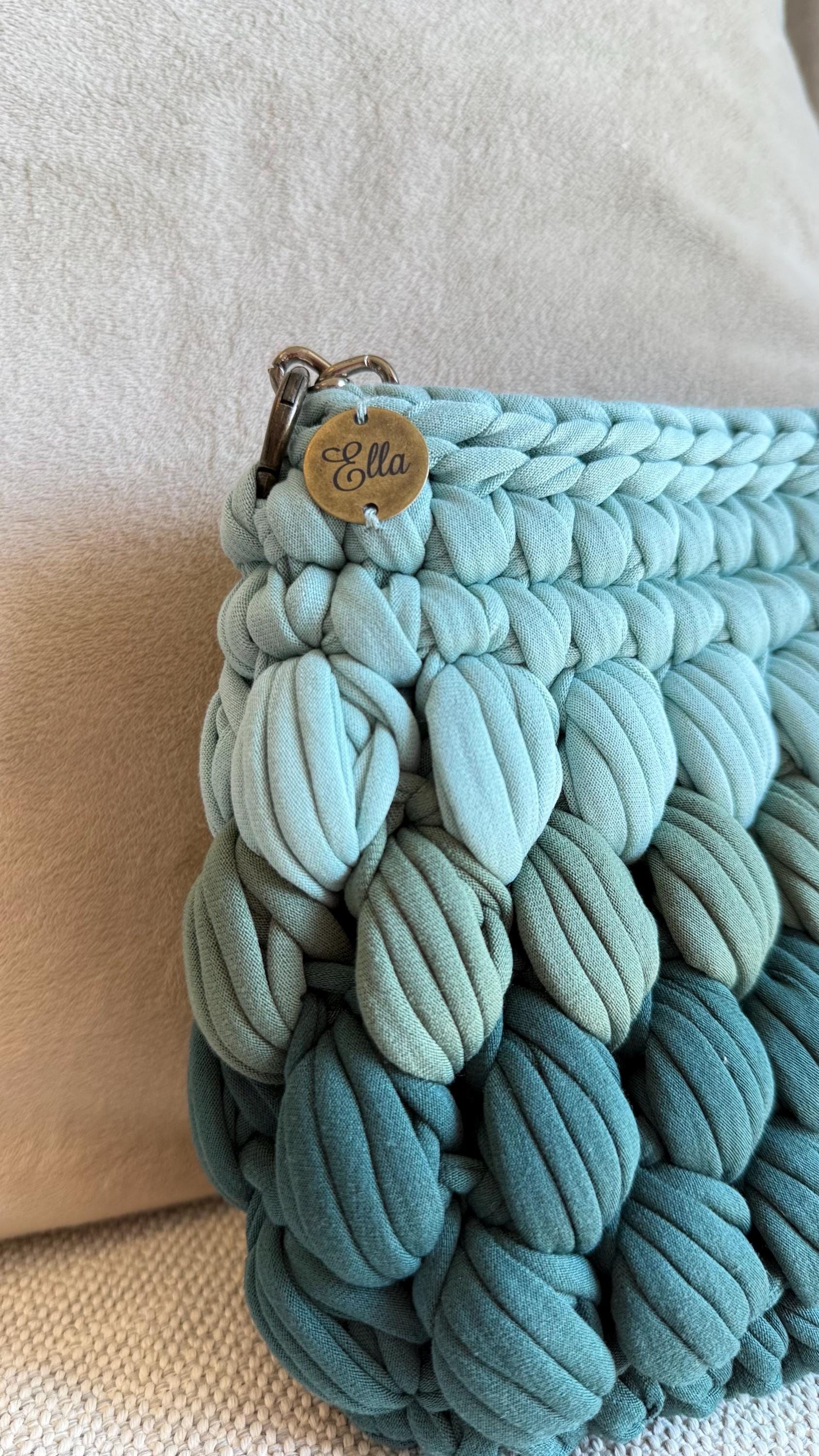 Dive into coastal chic with this breathtaking handcrafted chunky knit clutch! This mesmerizing purse features a stunning ocean-inspired gradient that flows from soft mint to deep teal, capturing the essence of sea glass and ocean waves.