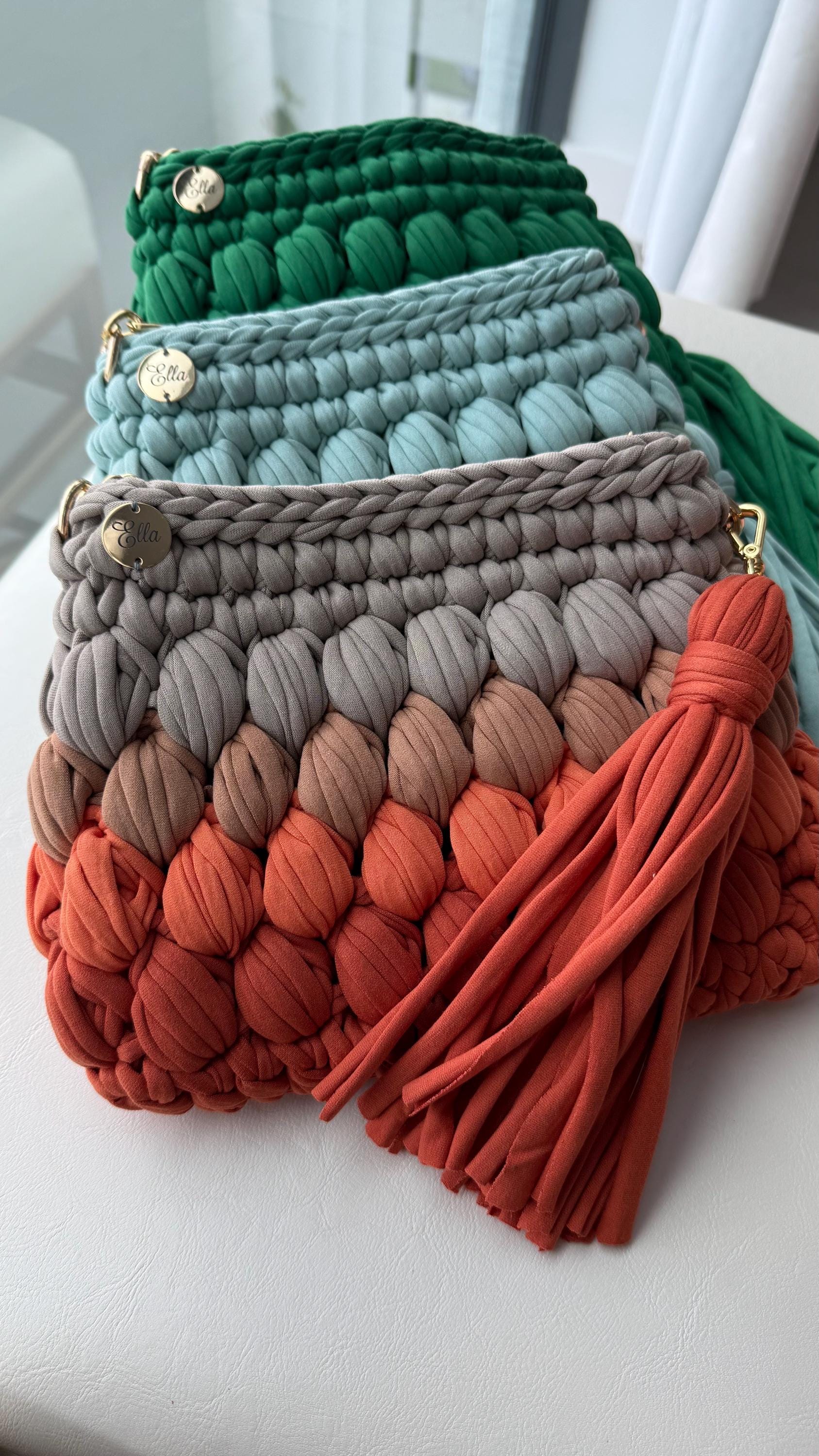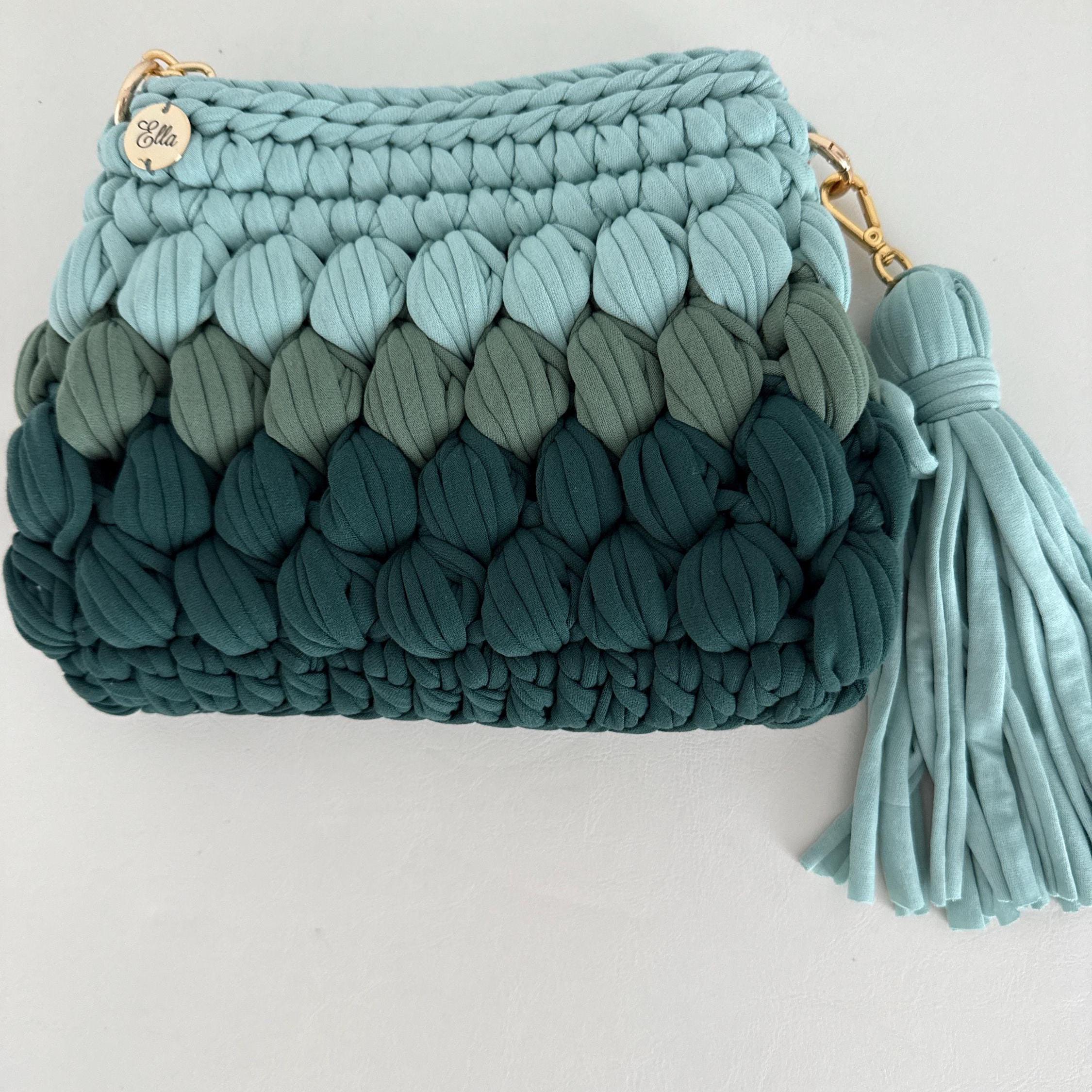 Tags: ocean gradient clutch, sea glass purse, teal ombré bag, chunky knit clutch, handmade crochet bag, mint green purse, bubble stitch bag, tassel clutch, coastal accessories, beach clutch, mermaid purse, handcrafted bag