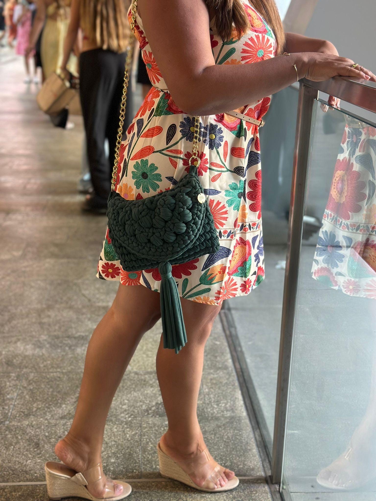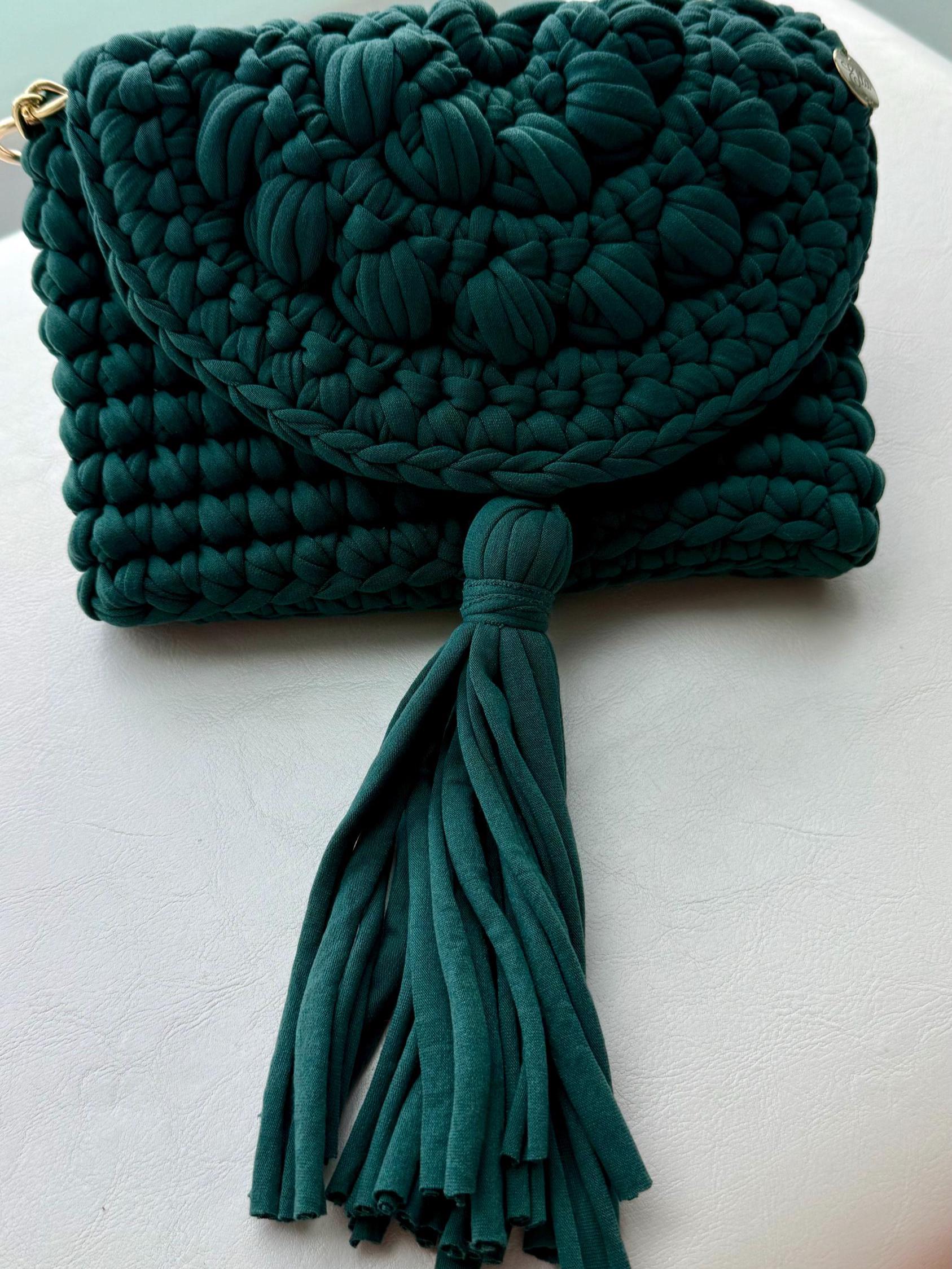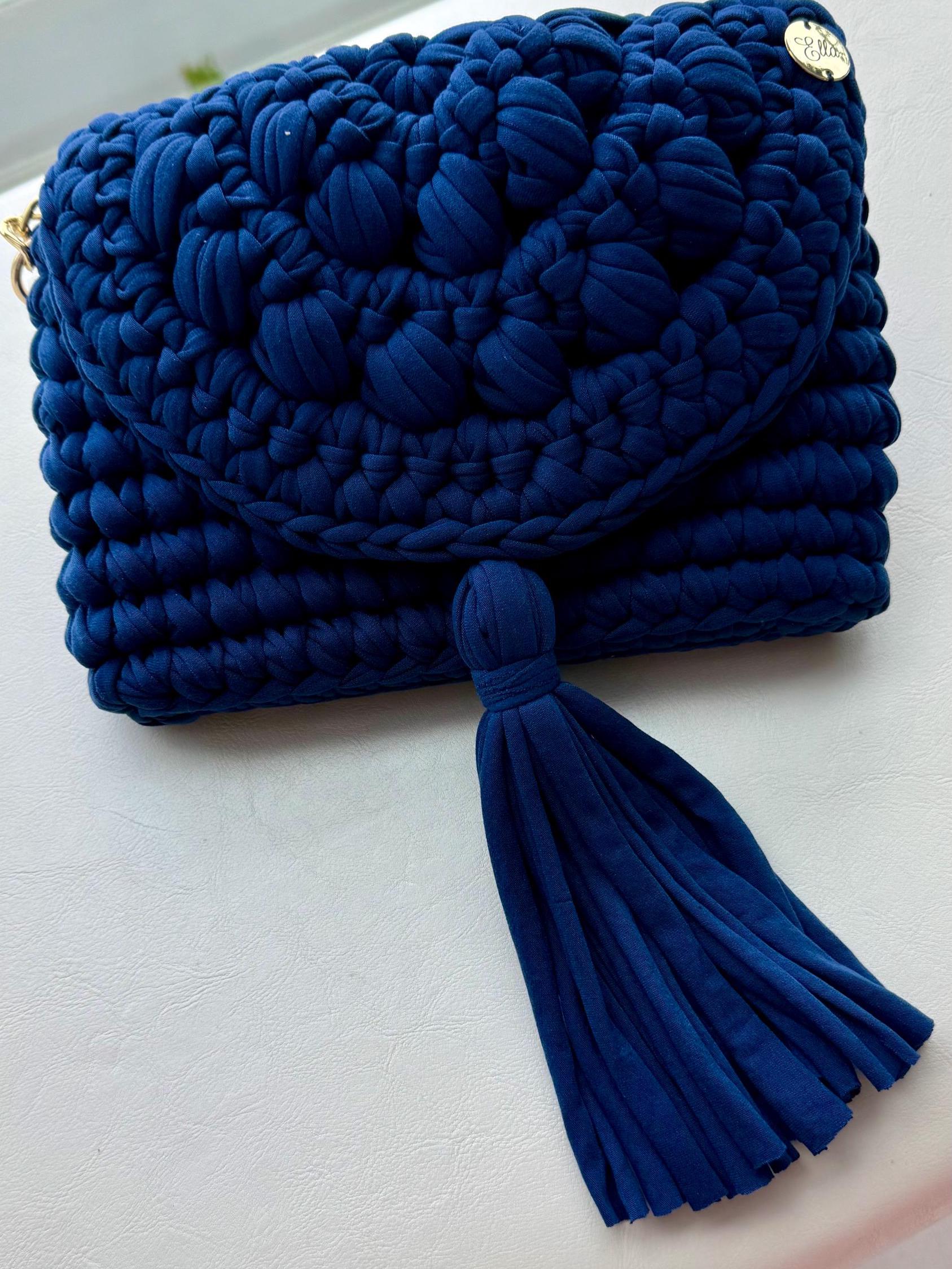 Handcrafted using premium chunky yarn with expert precision Structured design that maintains its elegant shape Luxurious bubble stitch texture for rich visual appeal Statement oversized tassel detail for added glamour Secure flap closure with gold-tone hardware Spacious interior perfect for daily essentials Lightweight yet durable construction that lasts