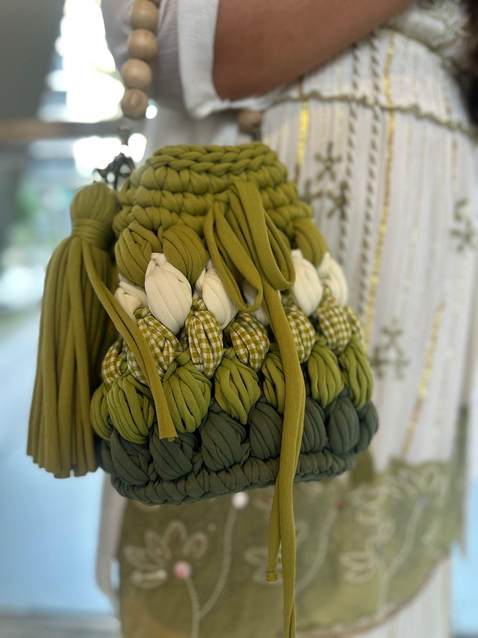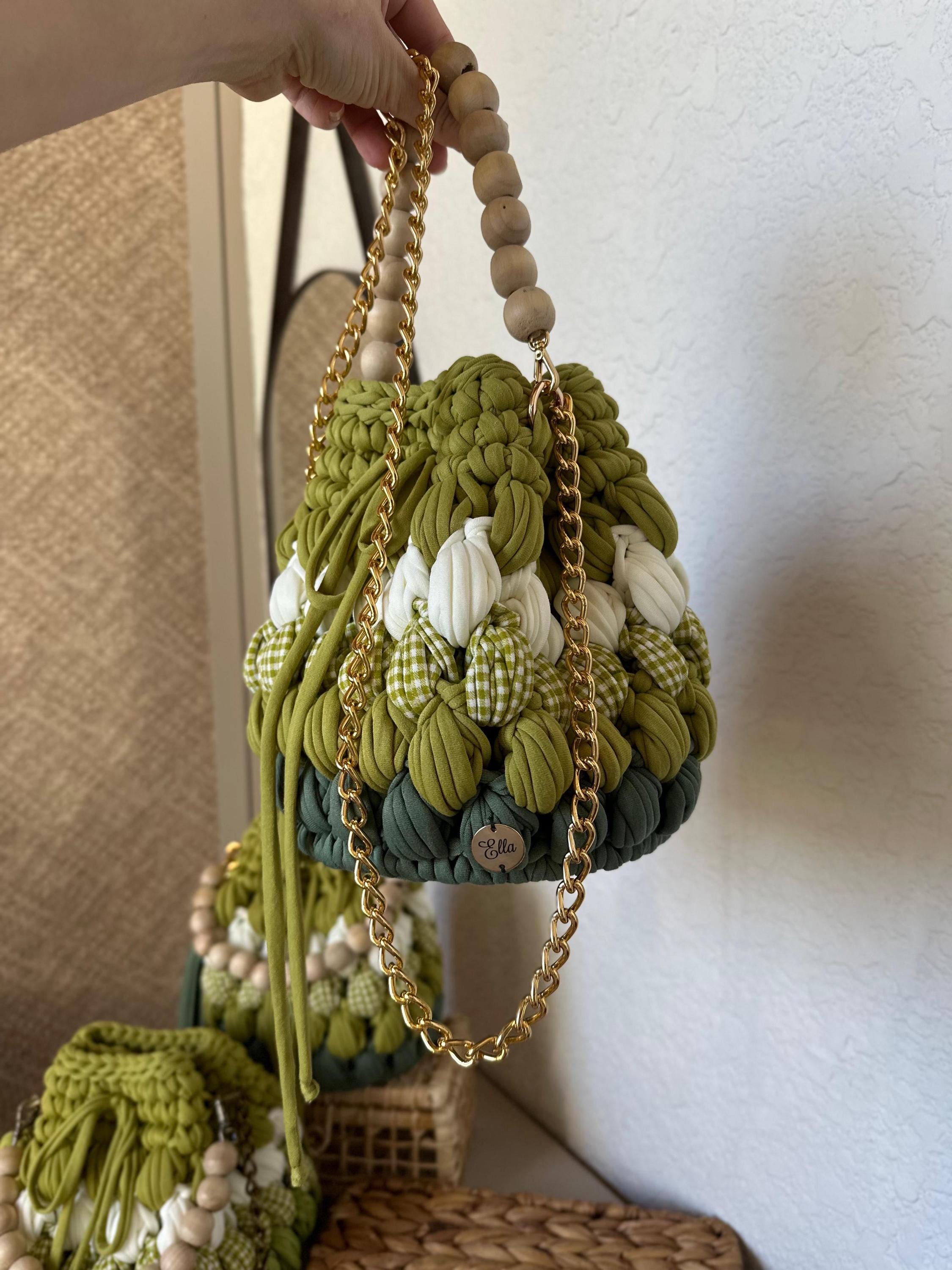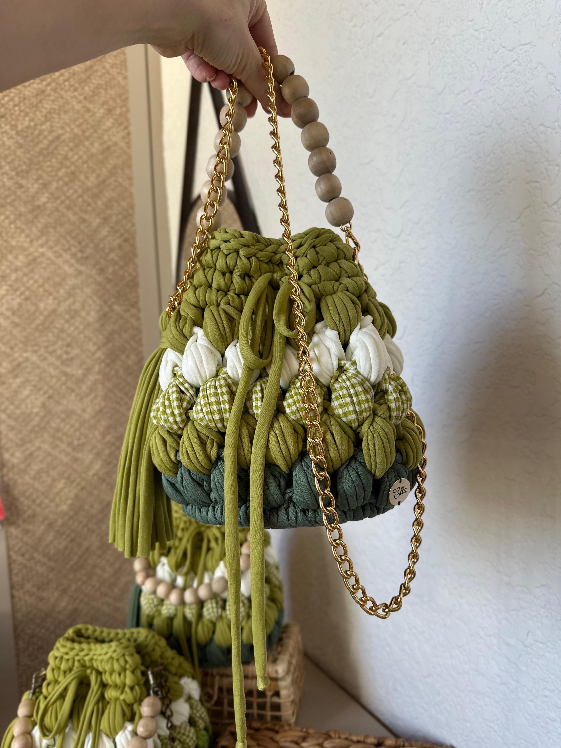 Add a touch of nature-inspired elegance to your wardrobe with this handcrafted green crochet bag. Featuring a unique mix of olive, moss, and forest greens, this boho crochet bucket bag is detailed with playful white accents and gingham textures for a chic, earthy look. The bag includes a sturdy gold chain strap paired with a wooden bead handle for versatile carrying, and a stylish tassel for a touch of whimsy.