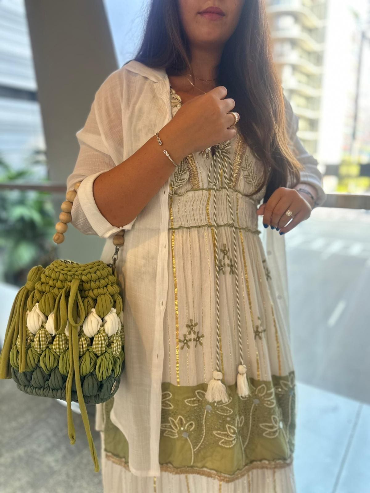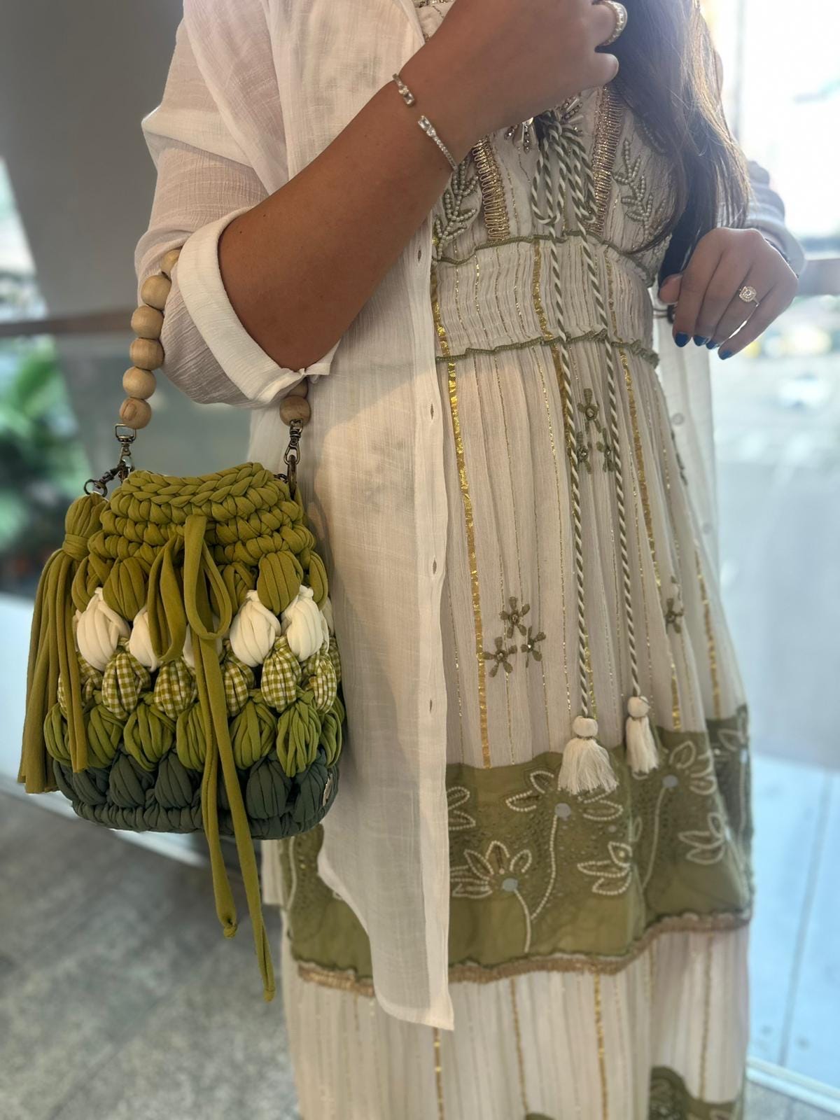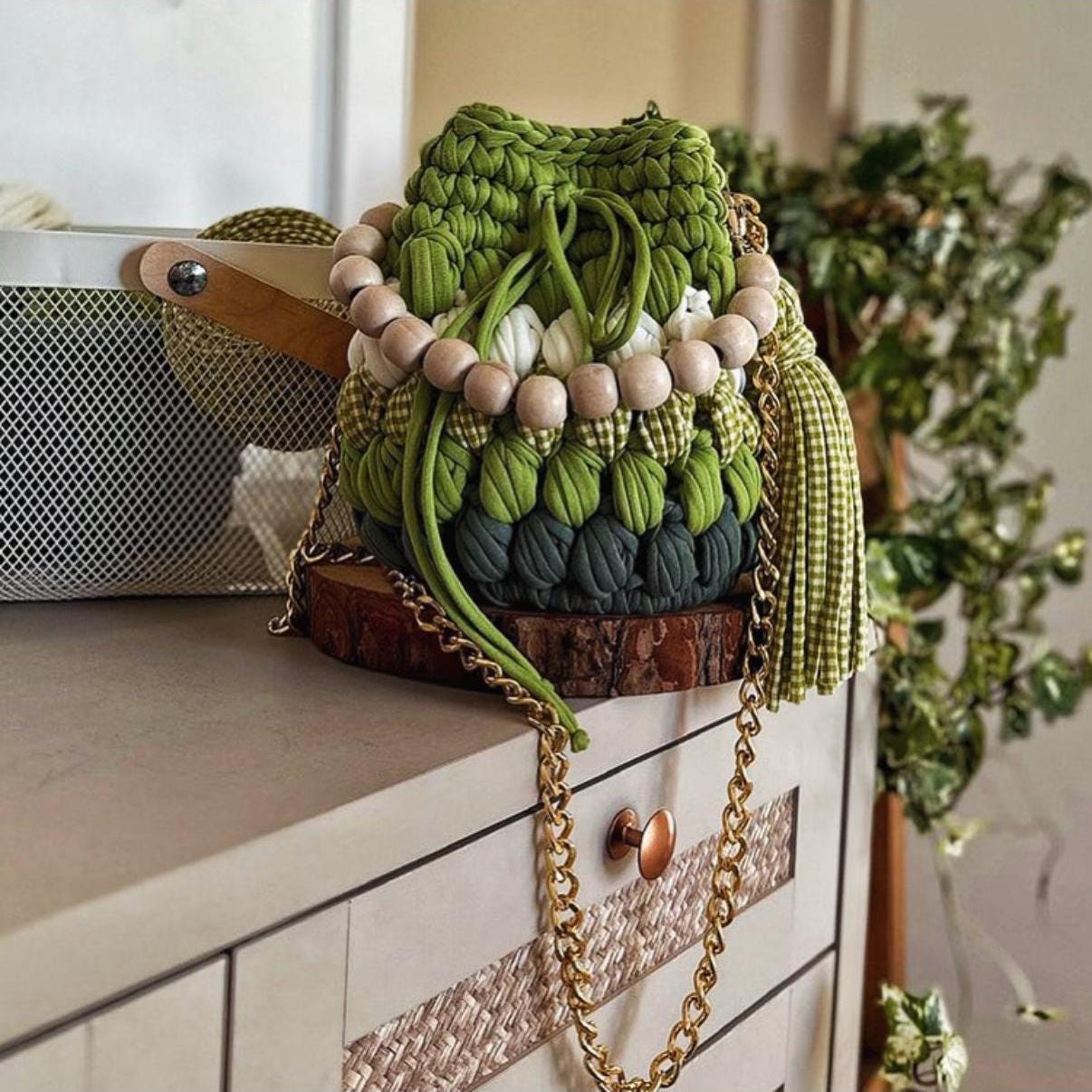 Add a touch of nature-inspired elegance to your wardrobe with this handcrafted green crochet bag. Featuring a unique mix of olive, moss, and forest greens, this boho crochet bucket bag is detailed with playful white accents and gingham textures for a chic, earthy look. The bag includes a sturdy gold chain strap paired with a wooden bead handle for versatile carrying, and a stylish tassel for a touch of whimsy.