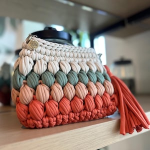 - Handcrafted ocean blue gradient crochet clutch - Sustainable sea blue evening bag with tassel - Organic cotton t-shirt yarn beach clutch - Eco-friendly blue ombré handbag - Natural dye ocean gradient crochet purse