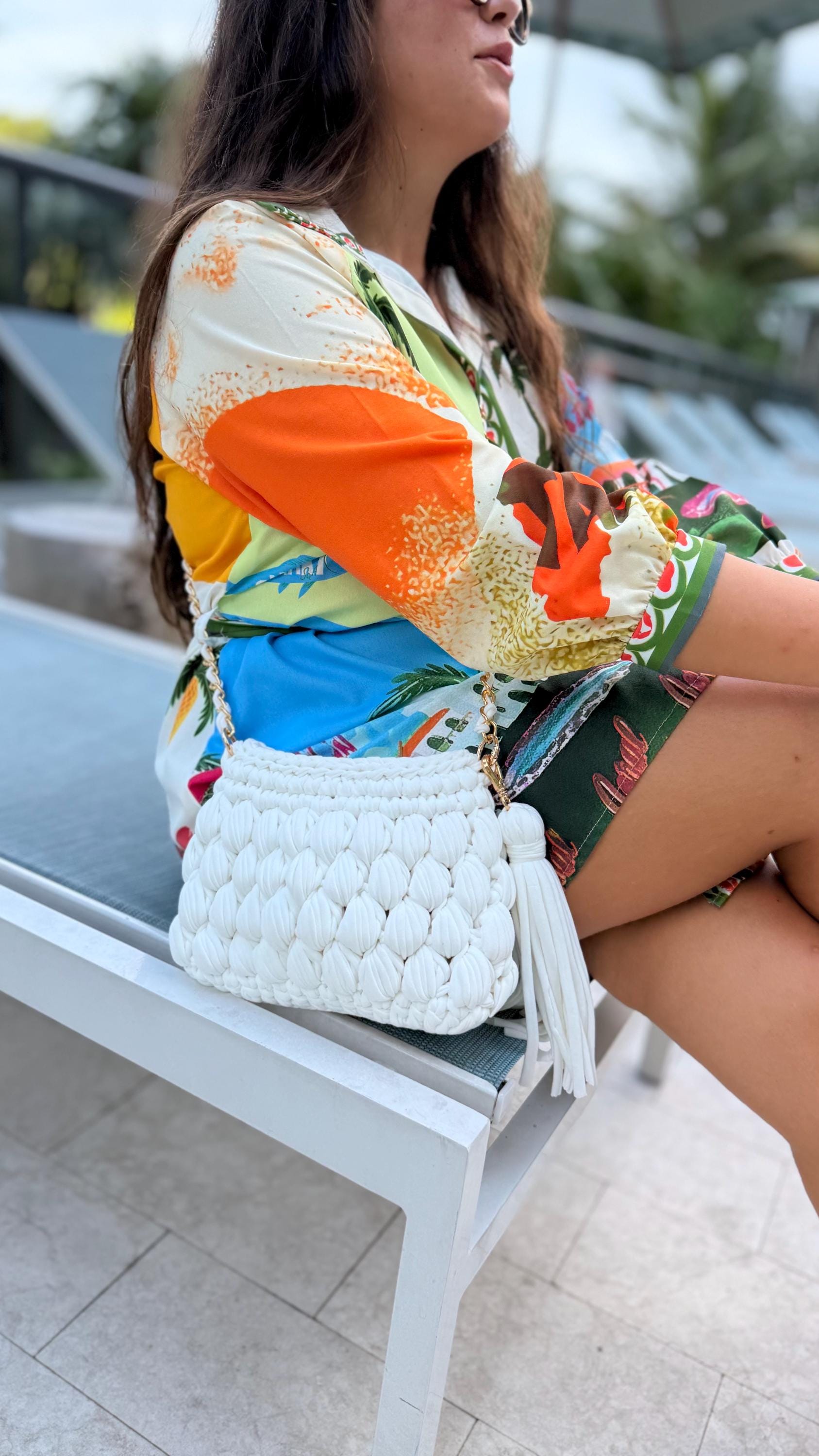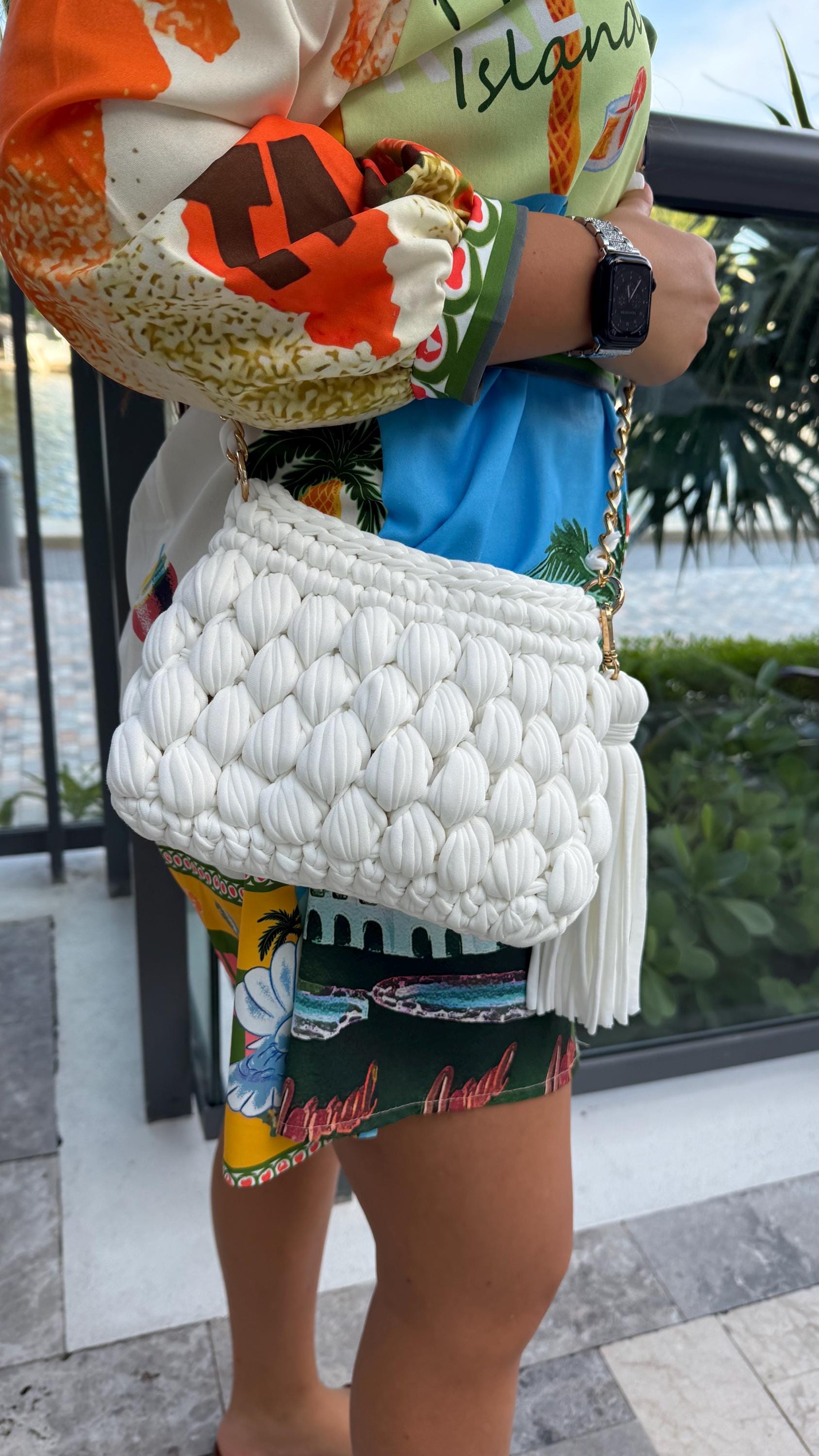 "Take Me For A Ride" Handcrafted Crochet Clutch - White T-Shirt Yarn Purse with Removable Tassel Note: This bag includes a golden handle inside for versatility.
