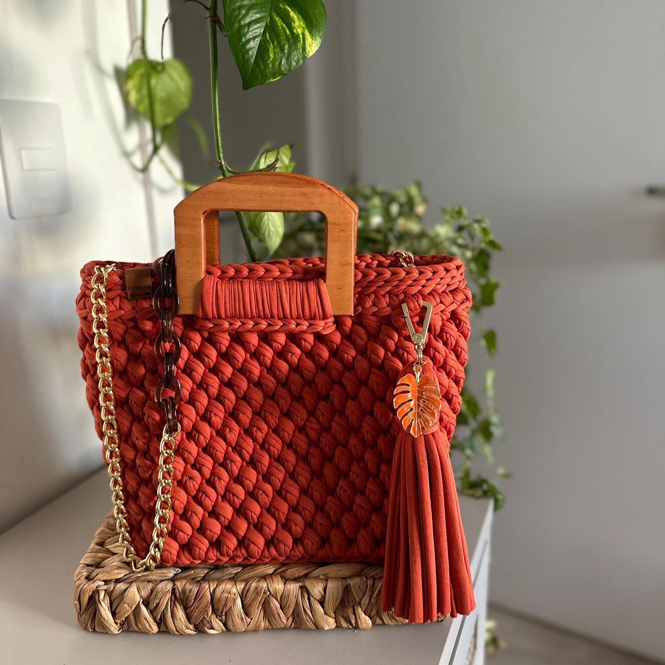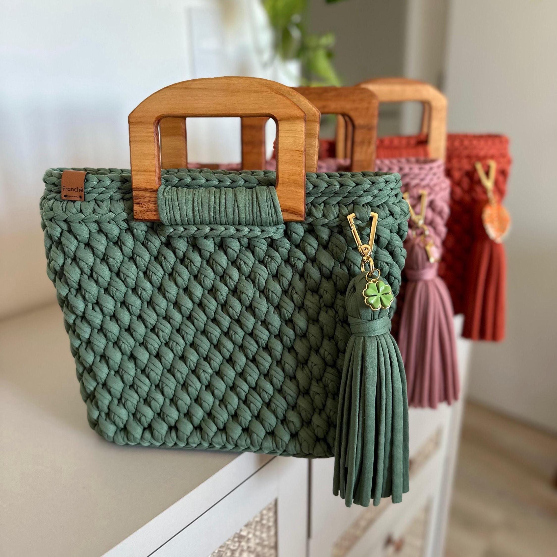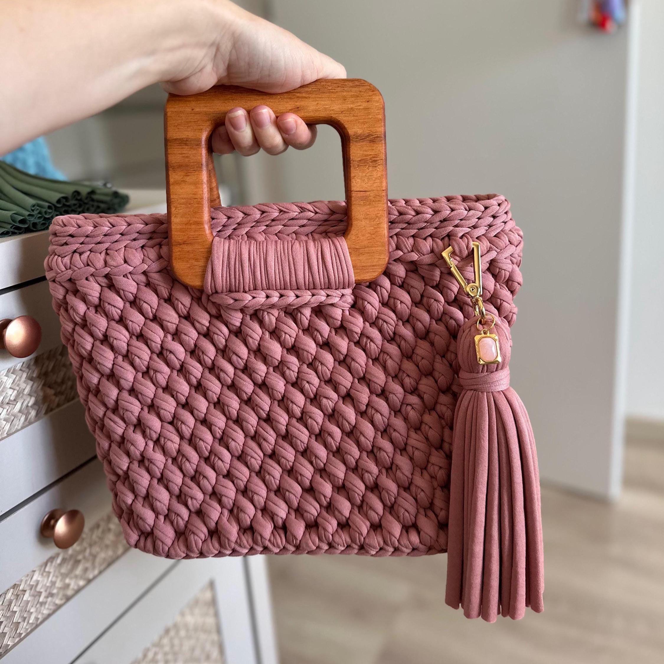"Meet me at the Beach" Handcrafted Crochet Bag - made with T-Shirt Yarn, Wood Handle & Removable Tassel Note: This bag includes a golden handle inside for versatility. Dimension: 10” X 10” X 5”