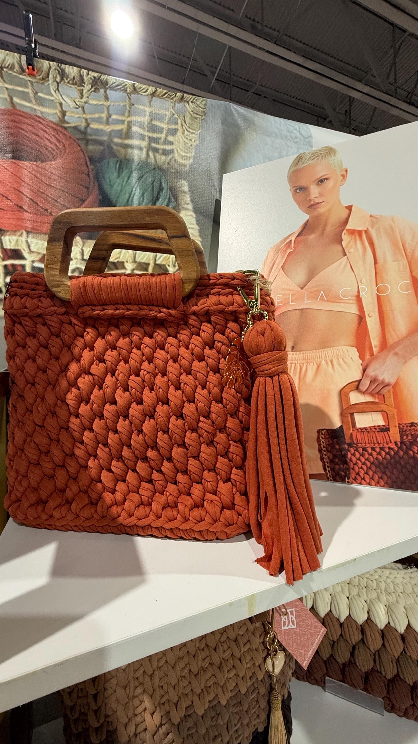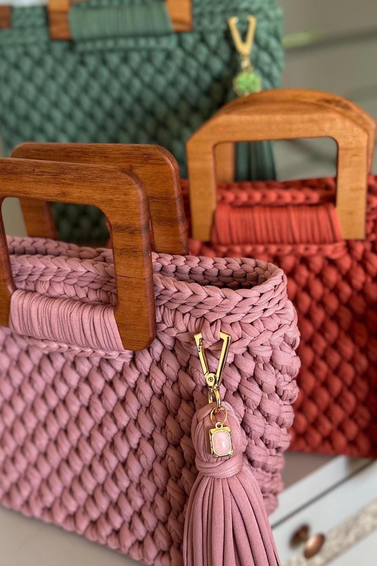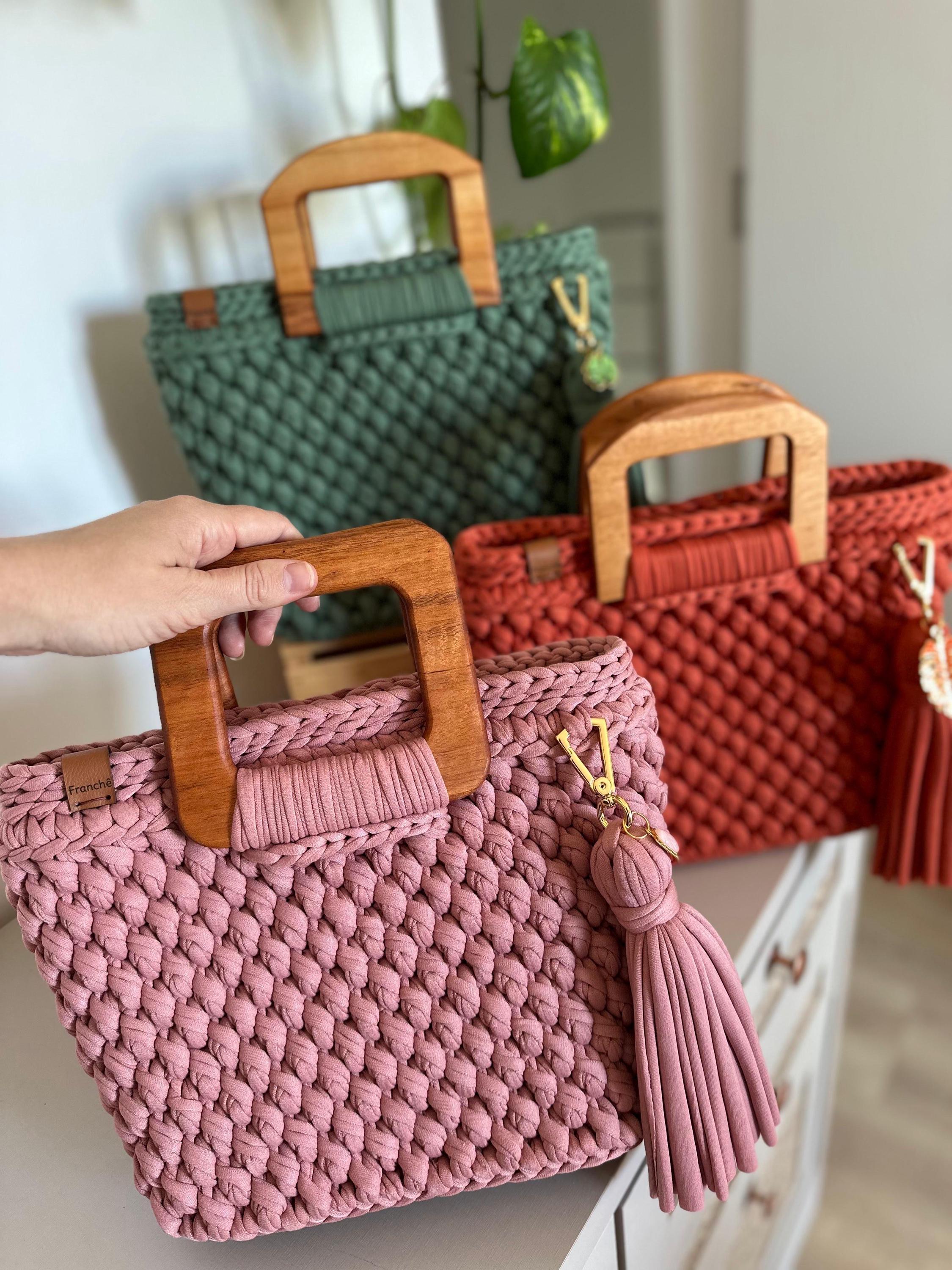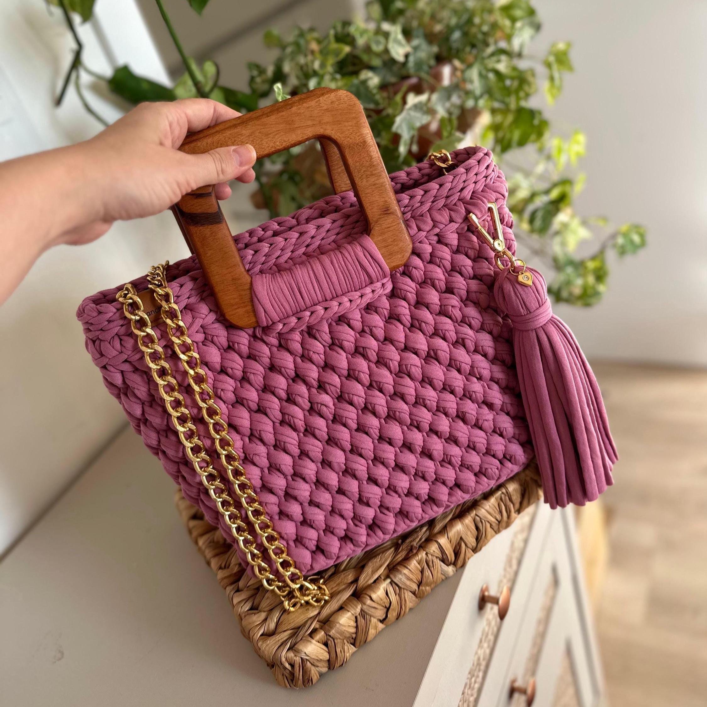 "Meet me at the Beach" Handcrafted Crochet Bag - made with T-Shirt Yarn, Wood Handle & Removable Tassel Note: This bag includes a golden handle inside for versatility. Dimension: 10” X 10” X 5”