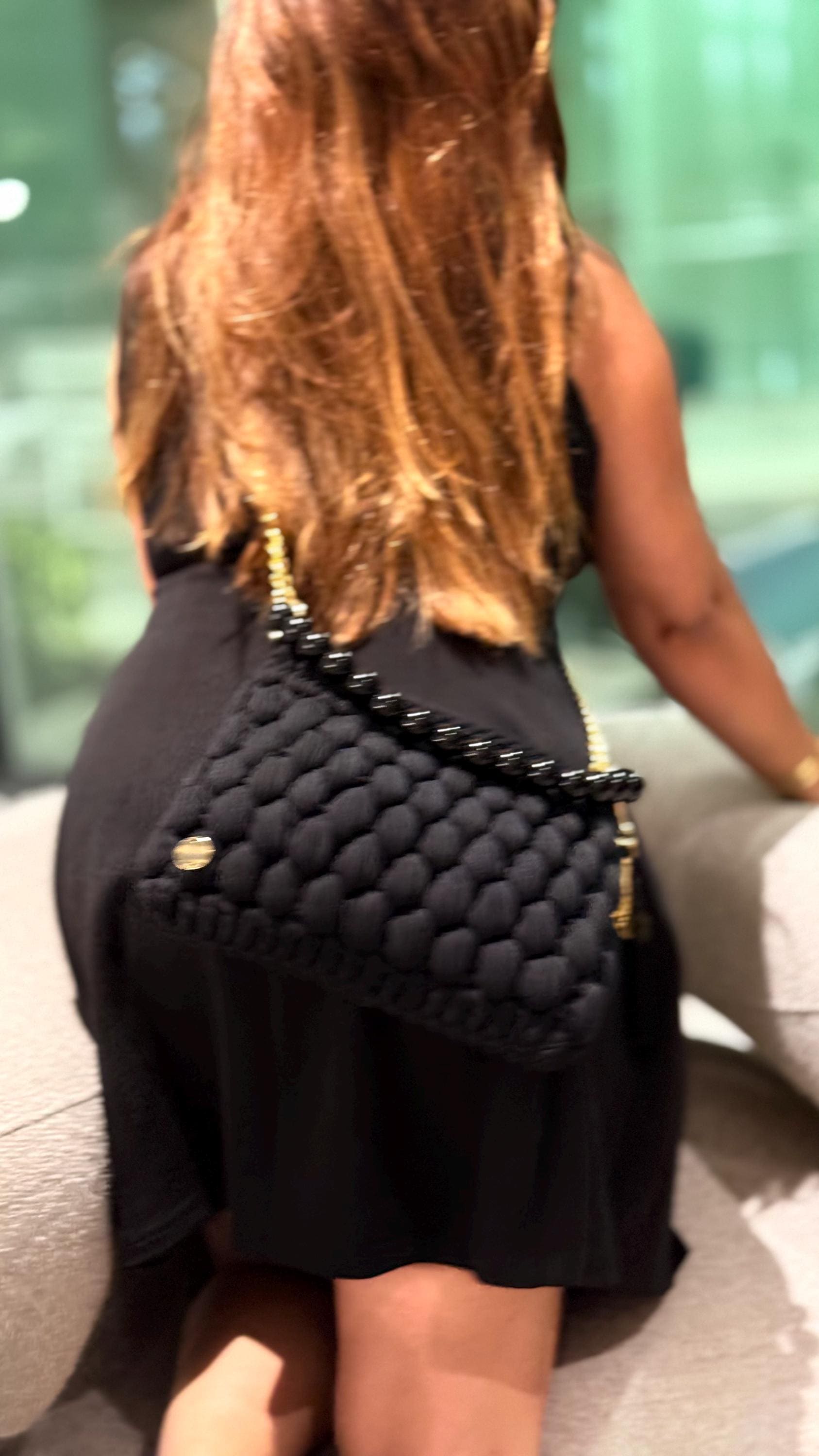Add a touch of nature-inspired elegance to your wardrobe with this handcrafted Savage Black crochet bag. Featuring a unique mix of olive, moss, and forest greens, this boho crochet bucket bag is detailed with playful white accents and gingham textures for a chic, earthy look. The bag includes a sturdy gold chain strap paired with a wooden bead handle for versatile carrying, and a stylish tassel for a touch of whimsy.