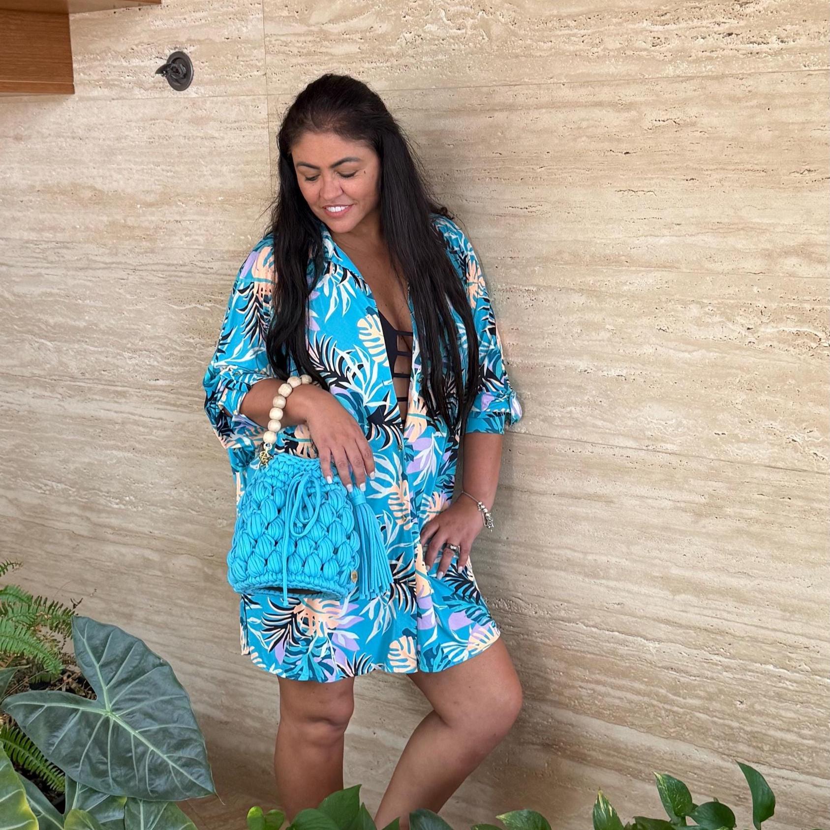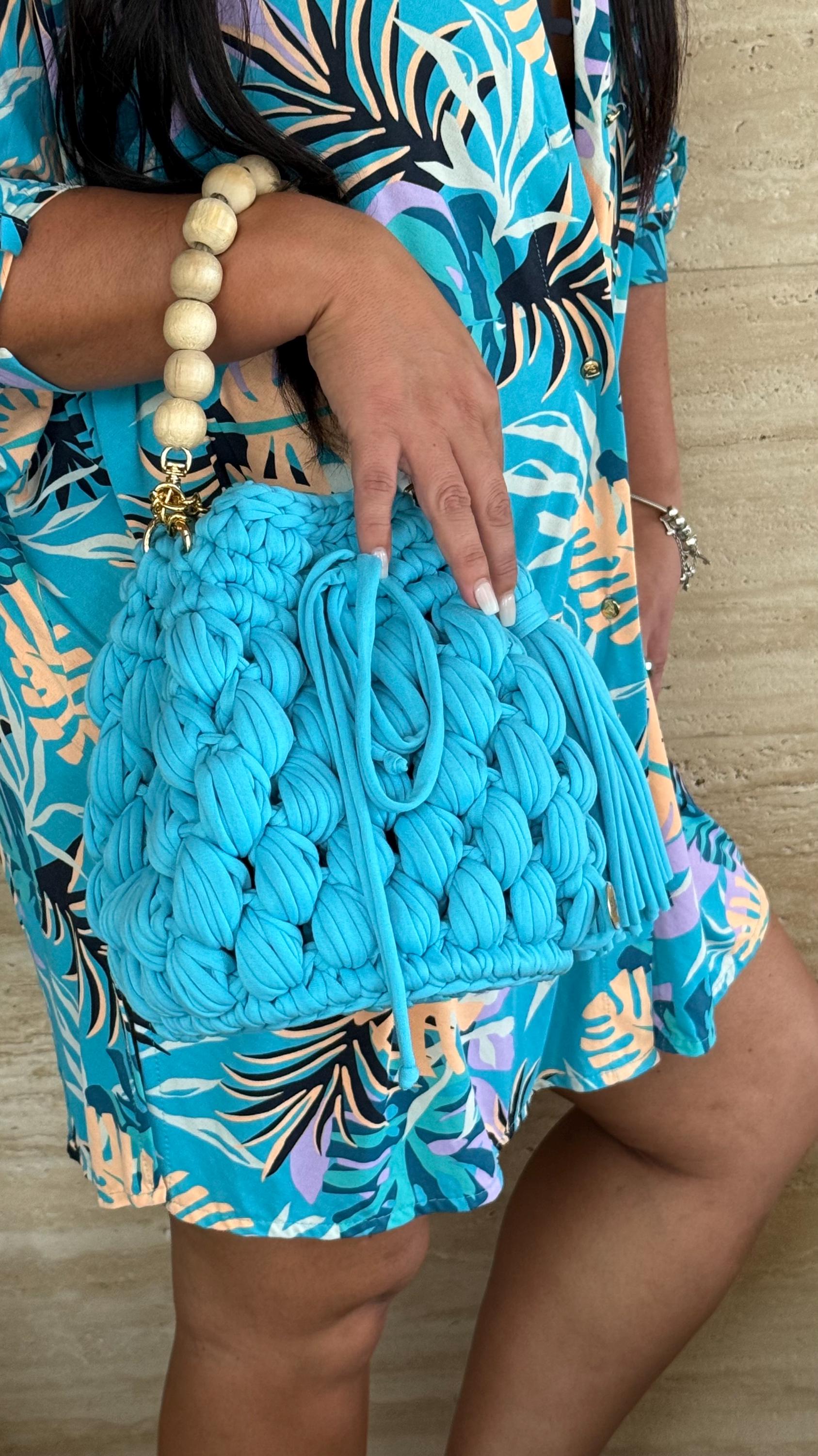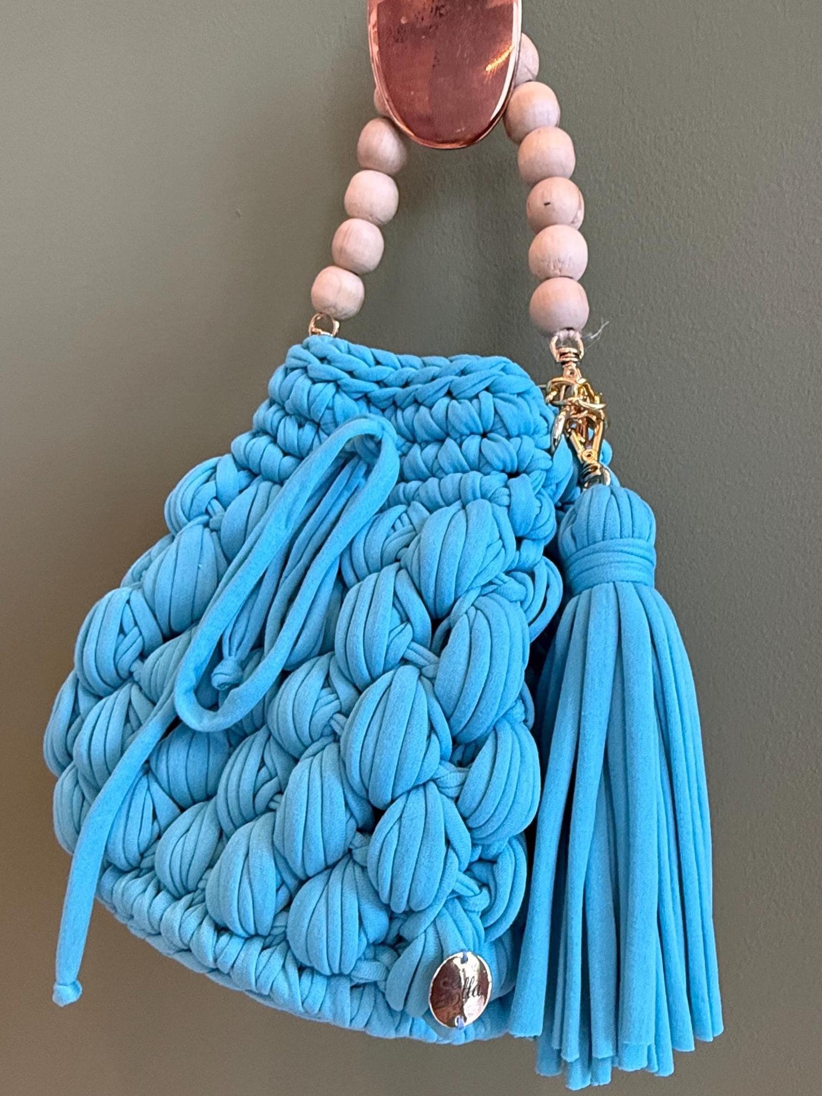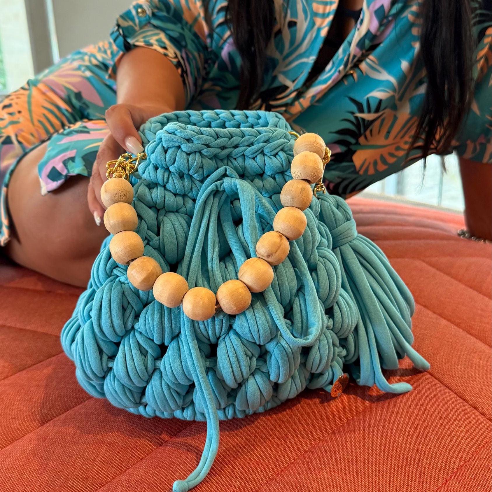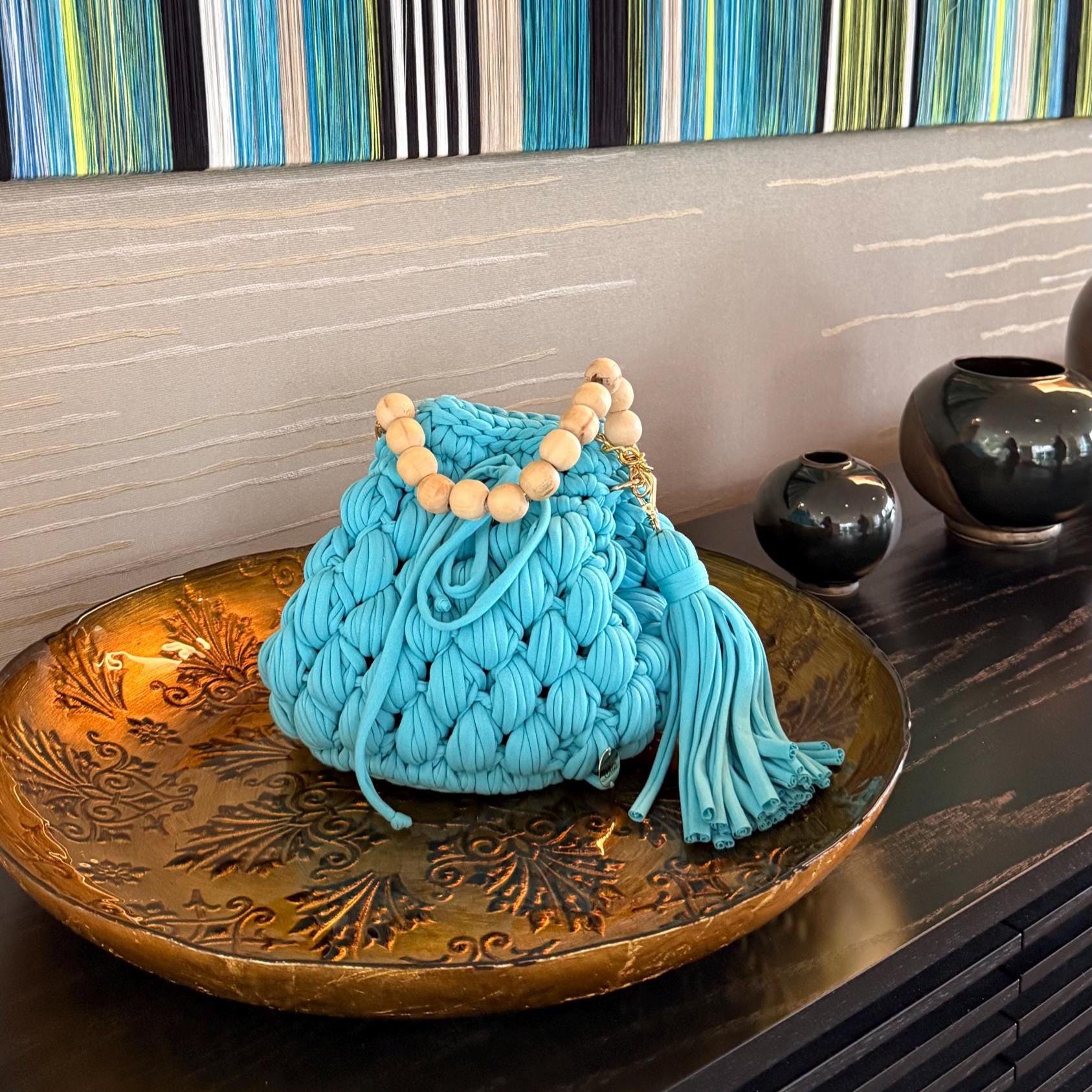 Add a touch of nature-inspired elegance to your wardrobe with this handcrafted Blue crochet bag. Featuring a unique Tiffany Blue Color, this boho crochet bucket bag is detailed with playful white accents and gingham textures for a chic, earthy look. The bag includes a sturdy gold chain strap paired with a wooden bead handle for versatile carrying, and a stylish tassel for a touch of whimsy.