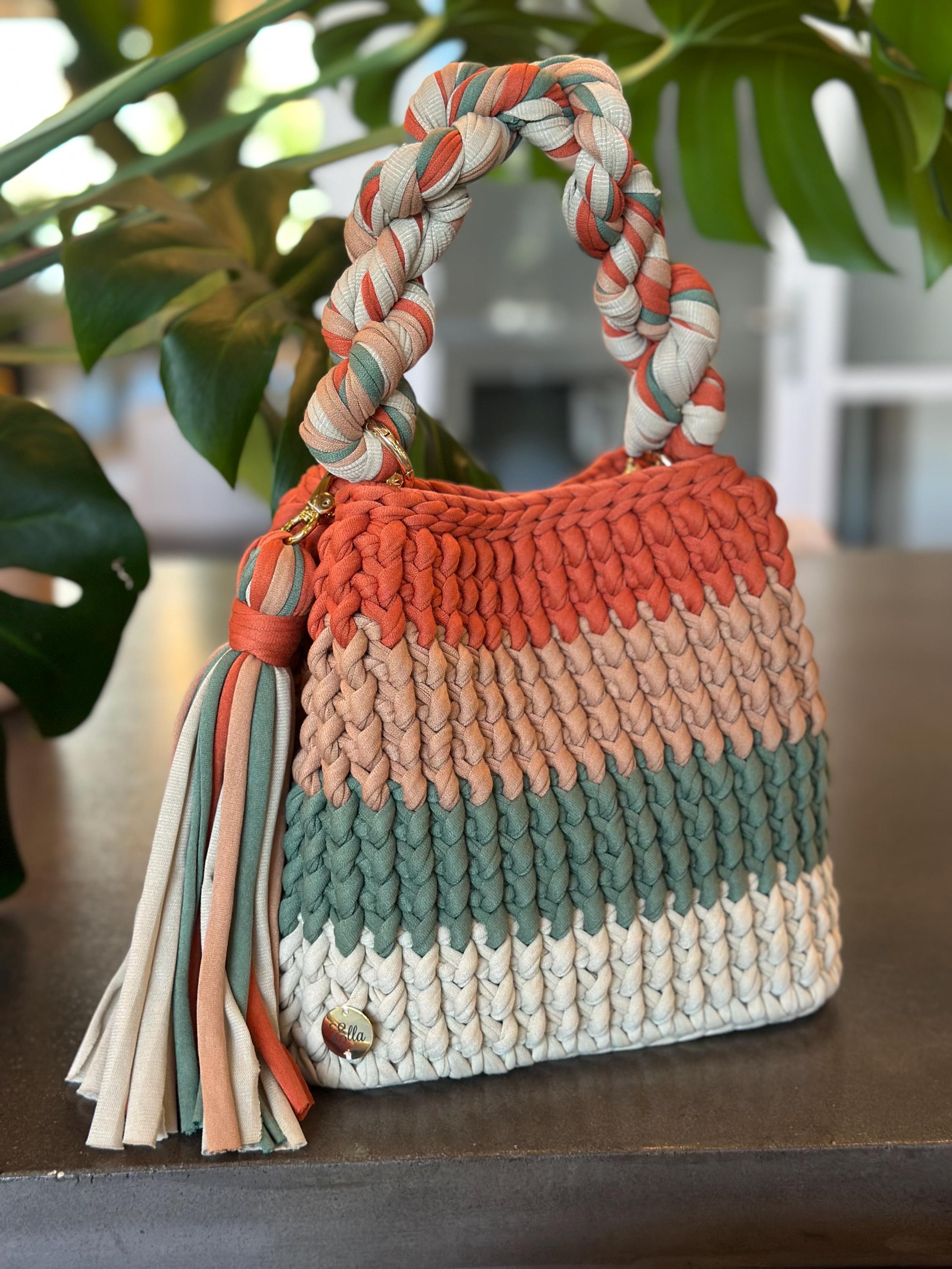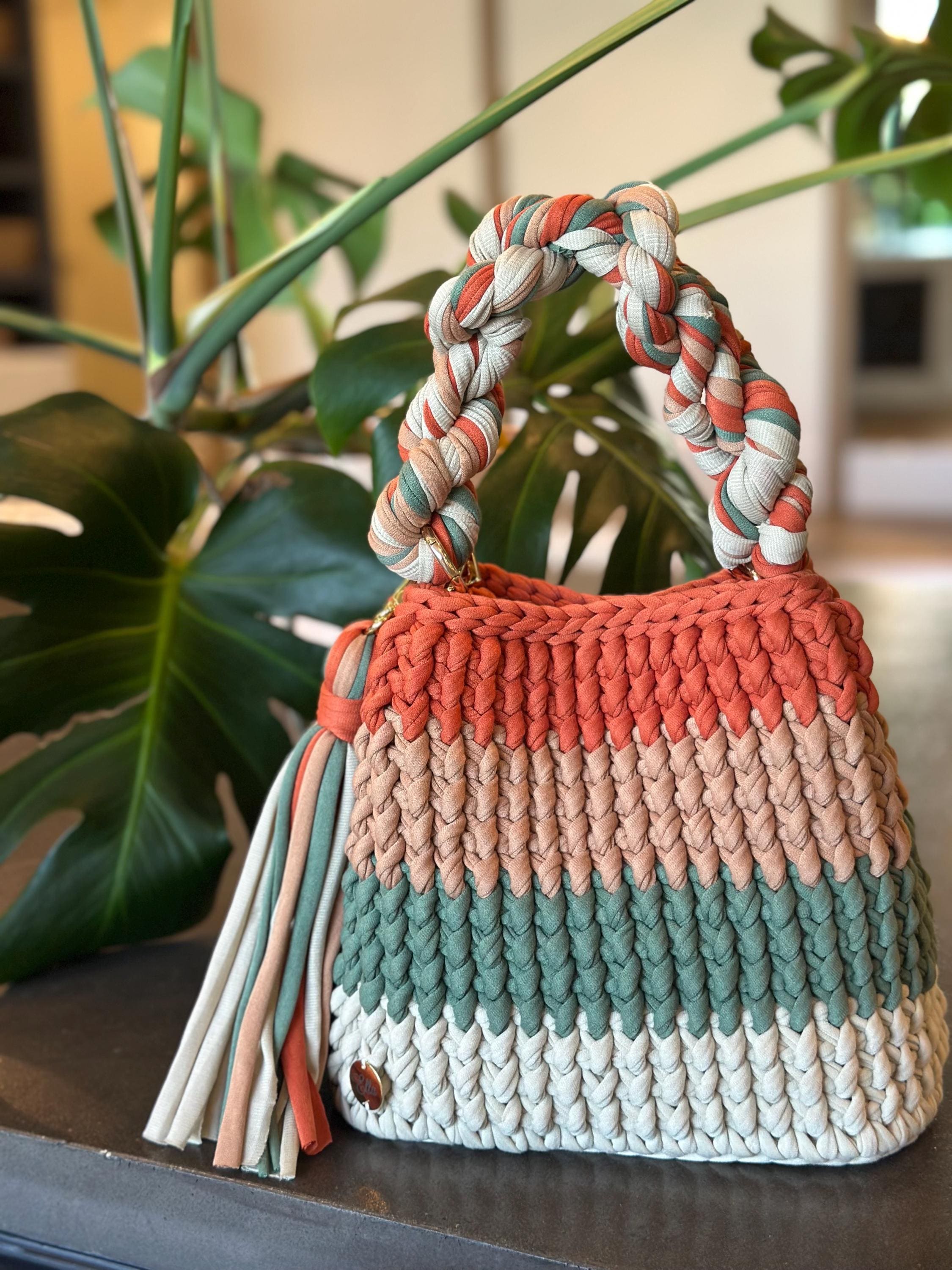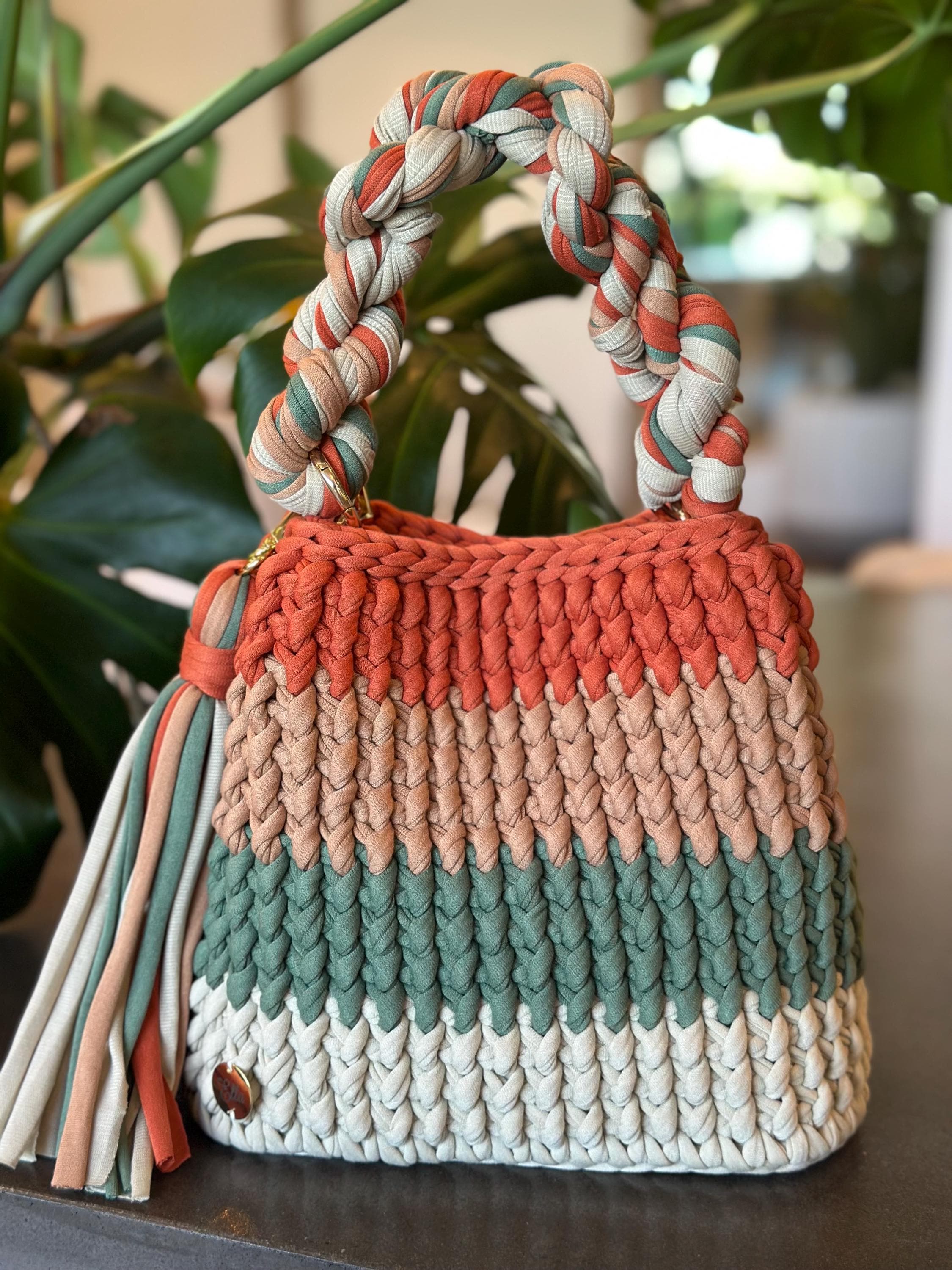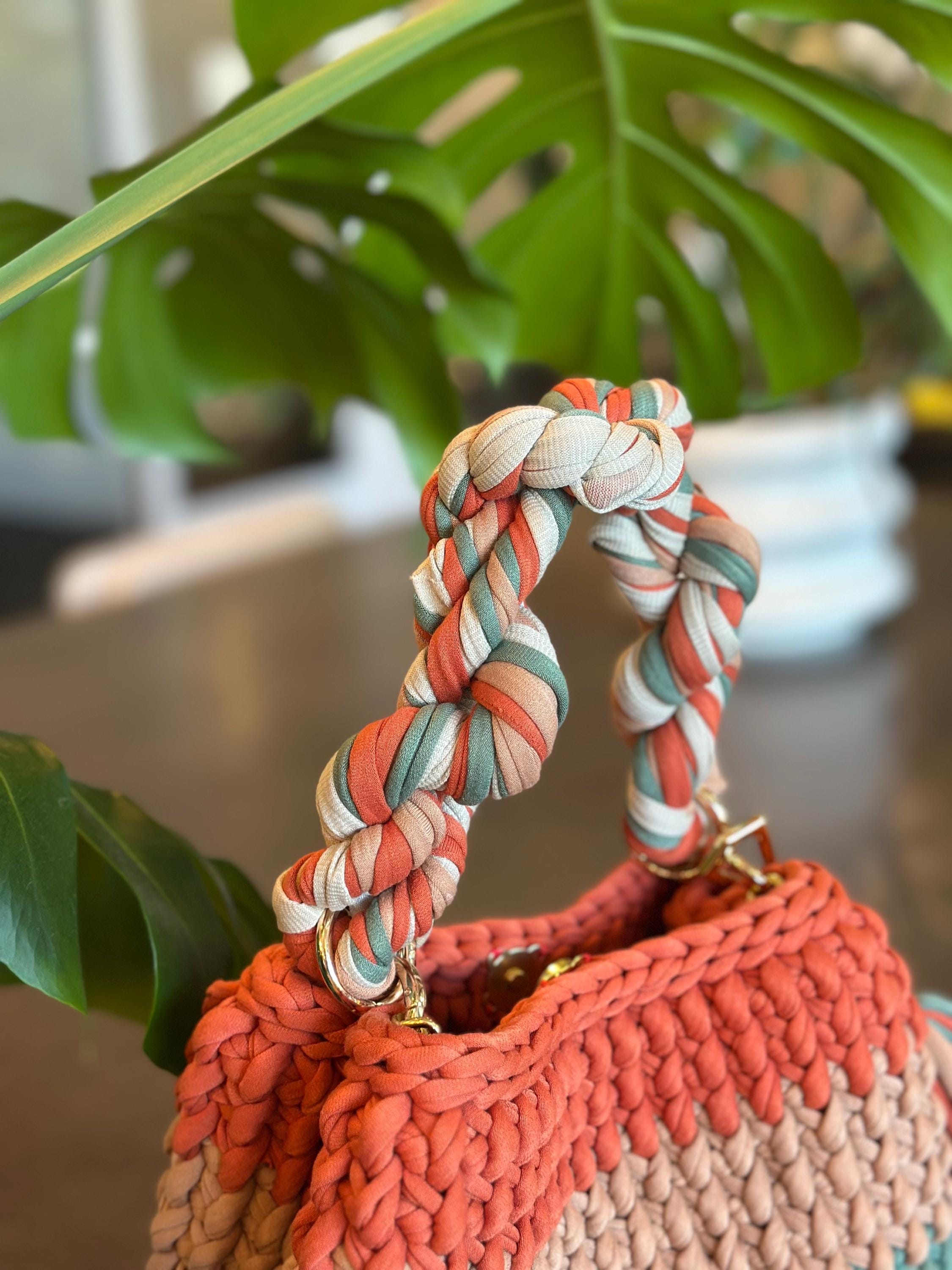 🪶handmade crochet bag, boho chic purse, earth tone handbag, eco-friendly fashion, crochet handbag for women, twisted handle bag, bohemian crochet bag, sustainable accessories, handmade gift for her, unique crochet purse