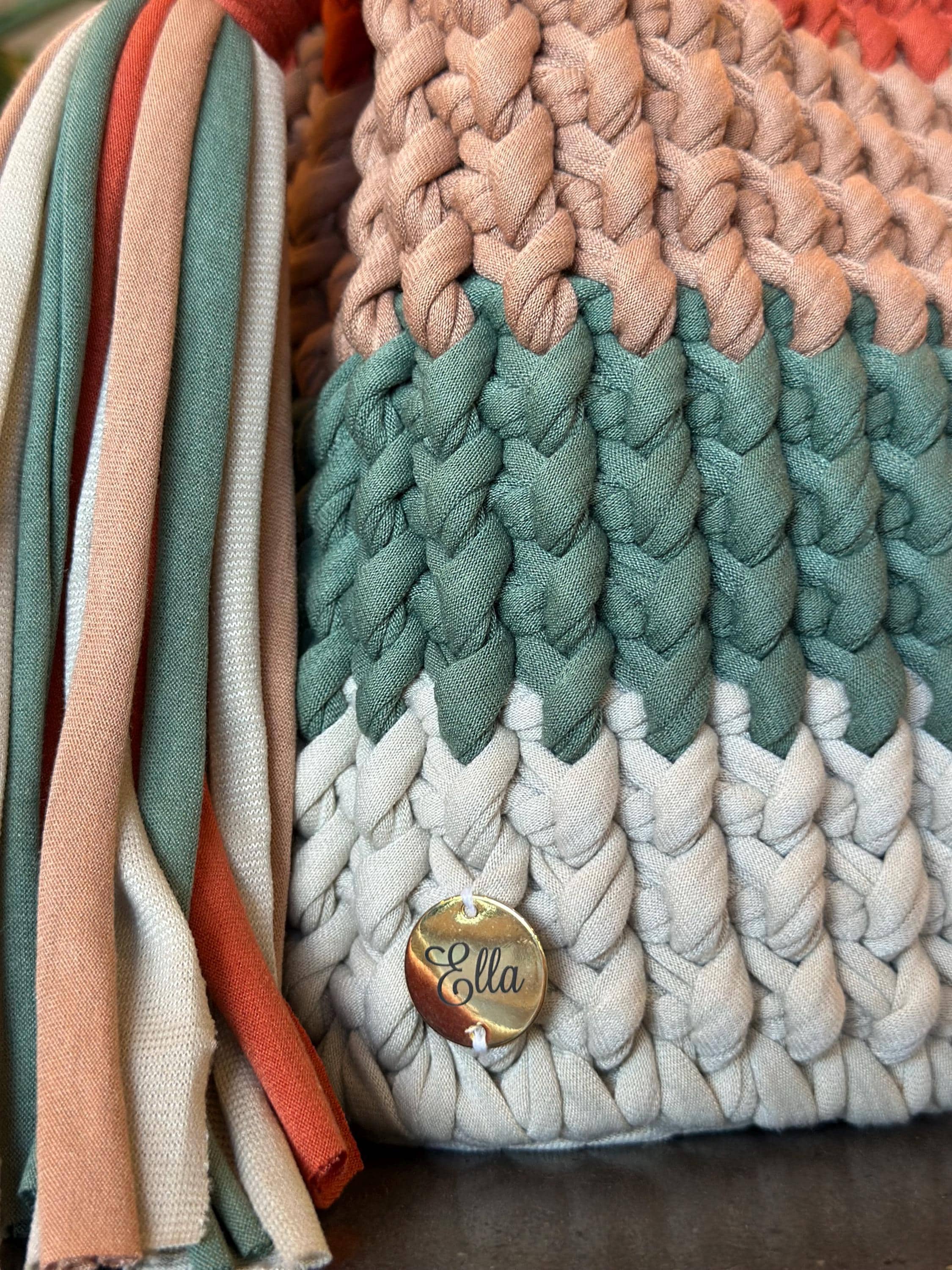 "Let’s go for a walk " Handcrafted Crochet Bag - made with T-Shirt Yarn, Wood Handle & Removable Tassel Note: This bag includes a golden handle inside for versatility. Dimension: 10” X 10” X 5”