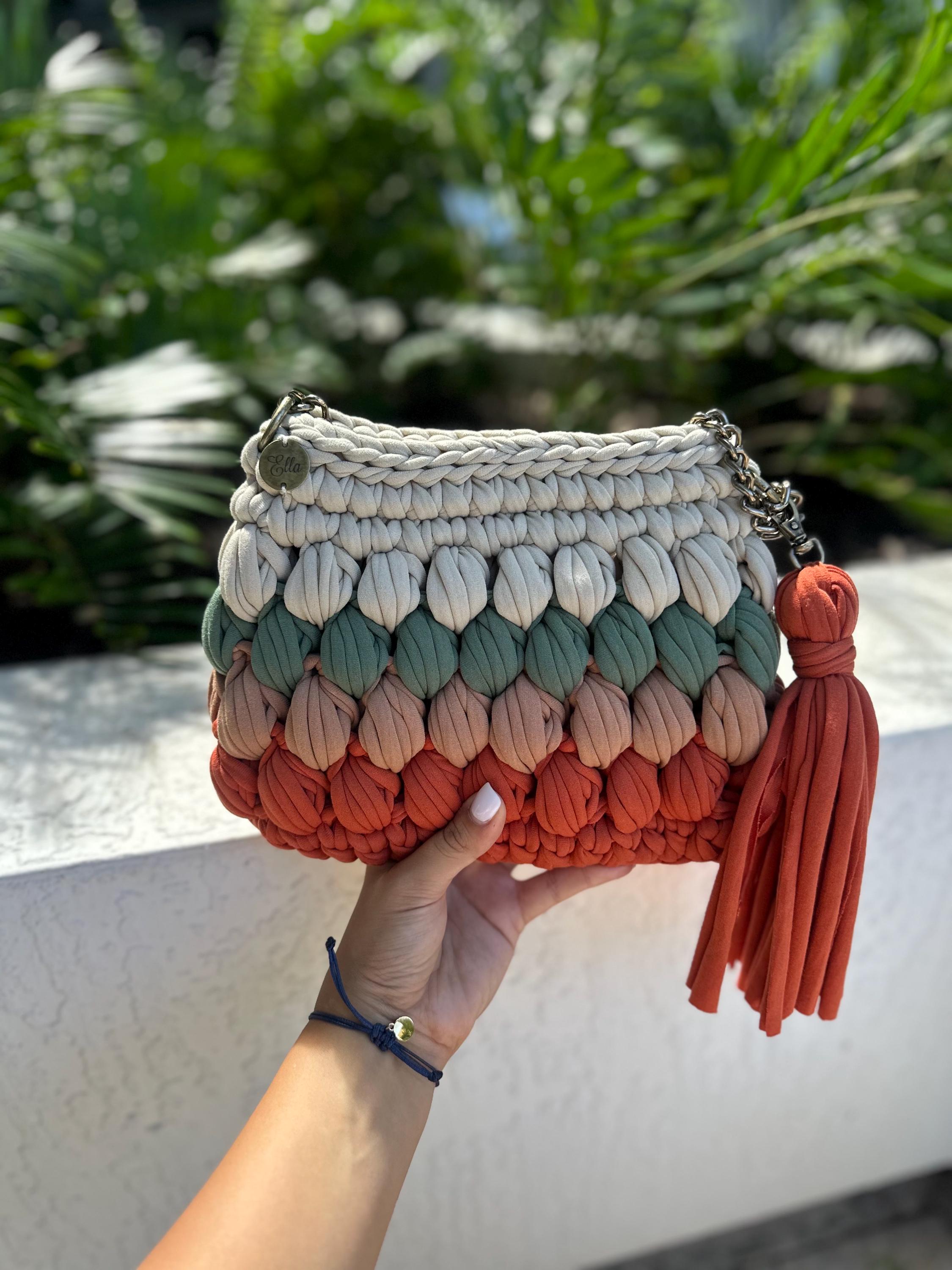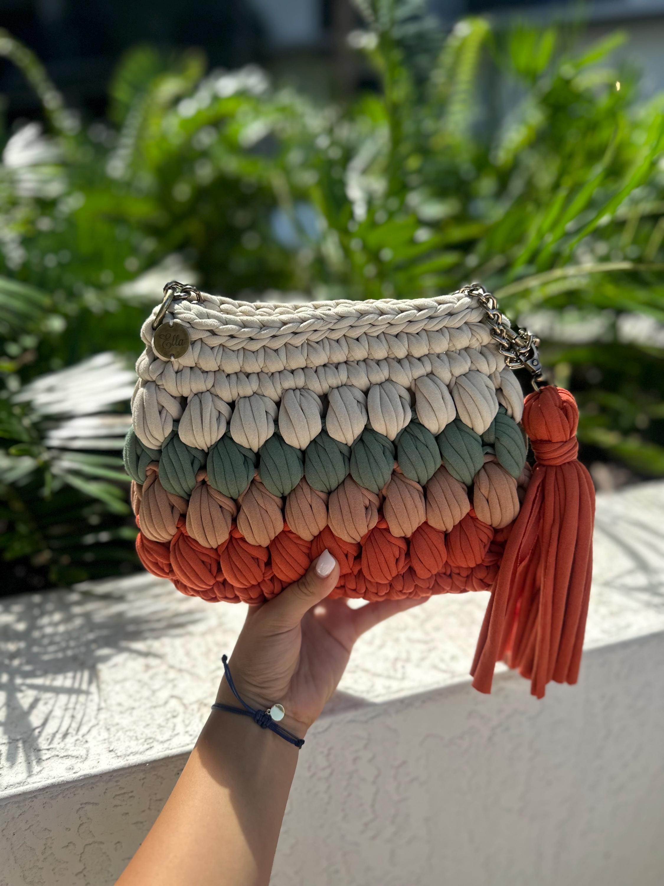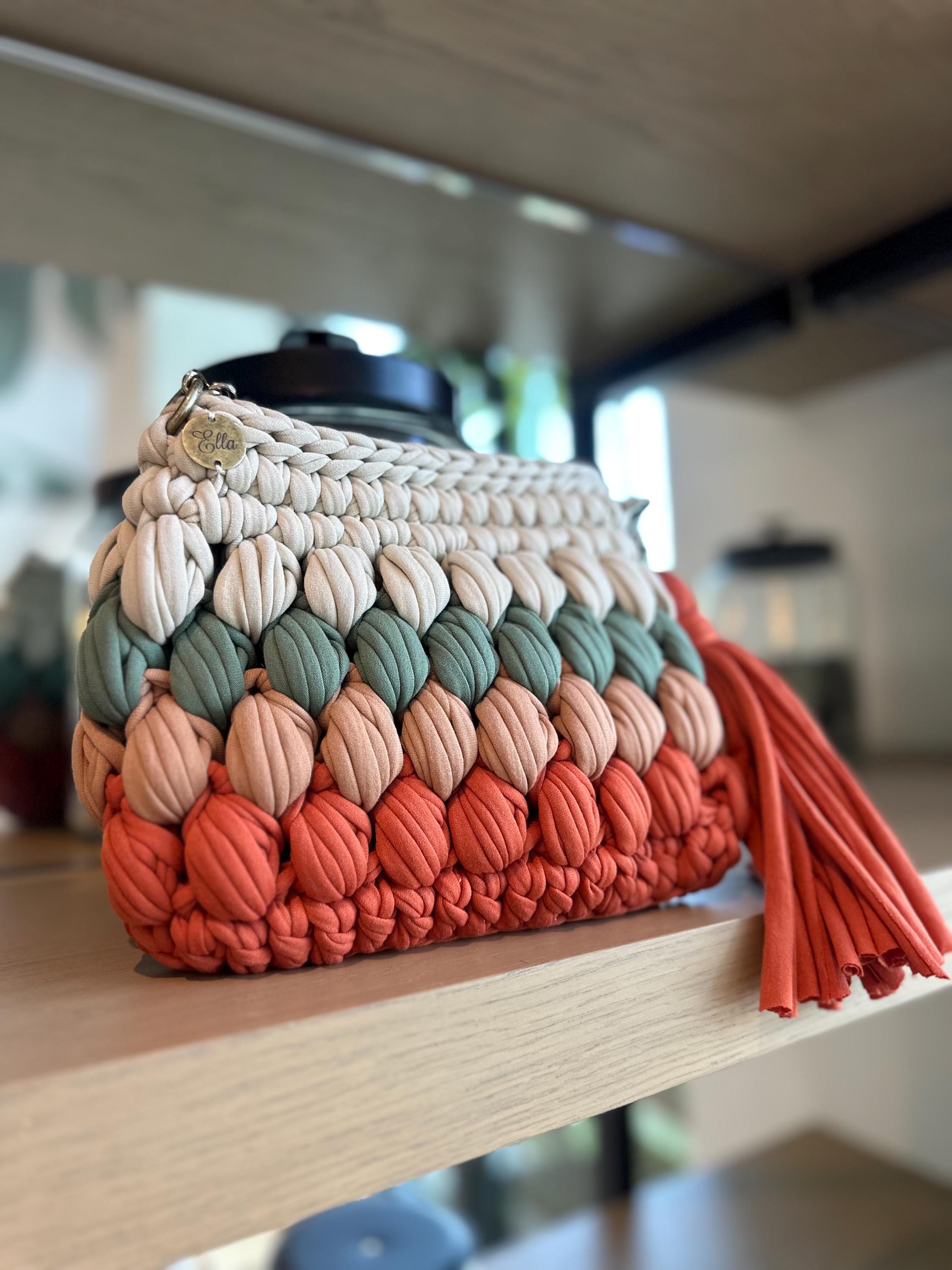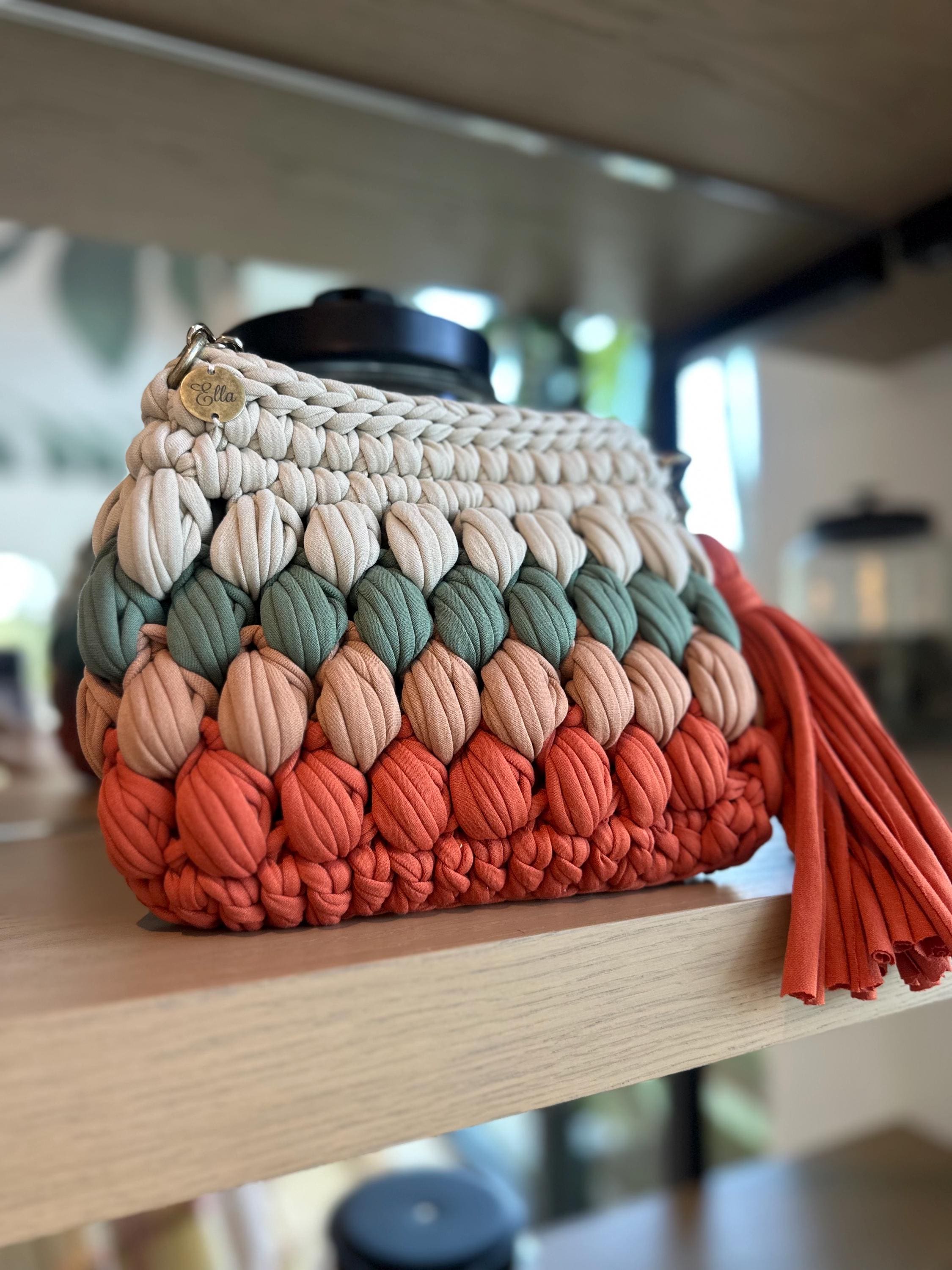 Tags: chunky knit bag, gradient handbag, handmade purse, crochet bag, ombré handbag, textured bag, boho purse, artisan bag, coral bag, terracotta purse, bubble stitch bag, handcrafted accessories