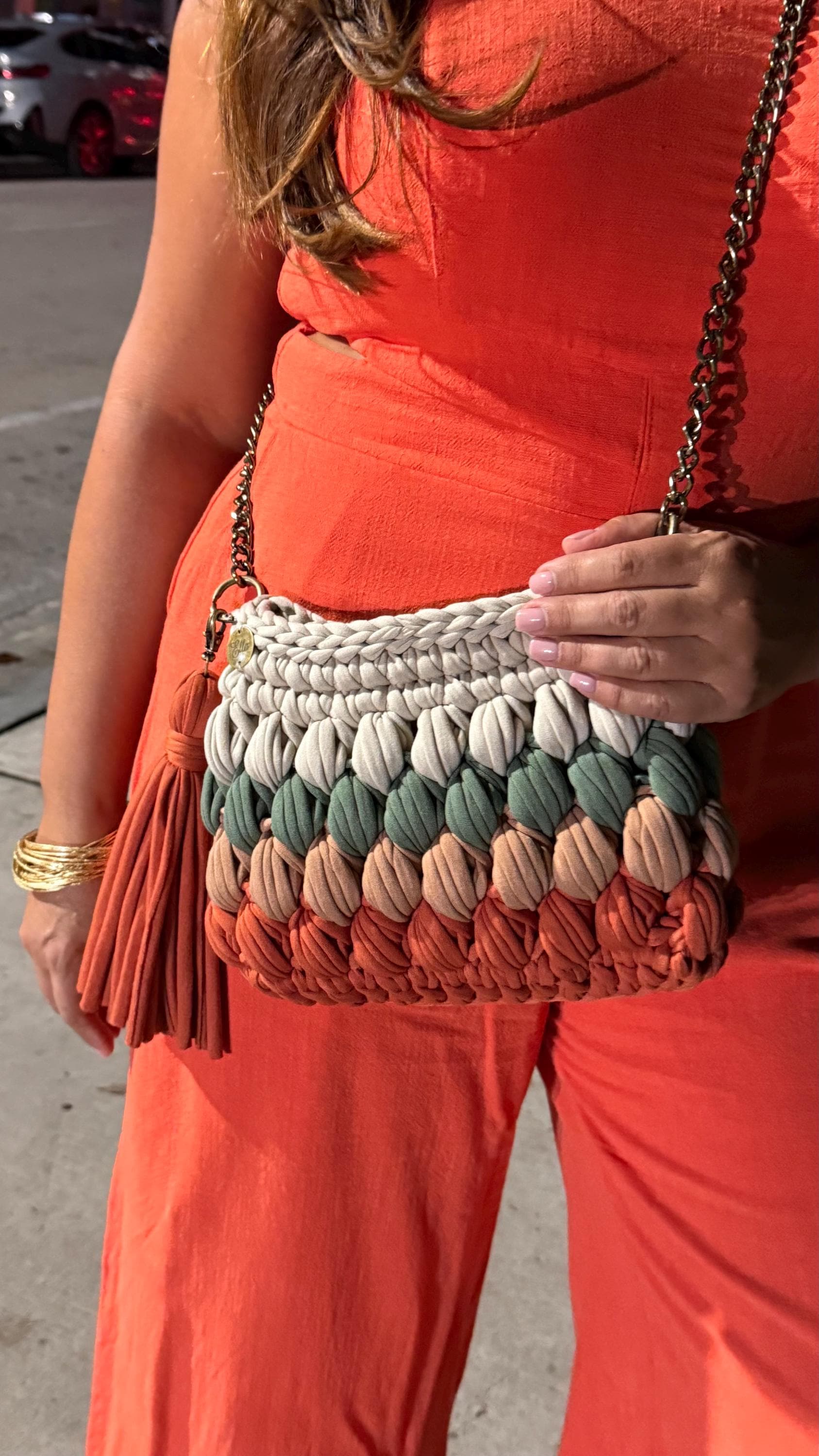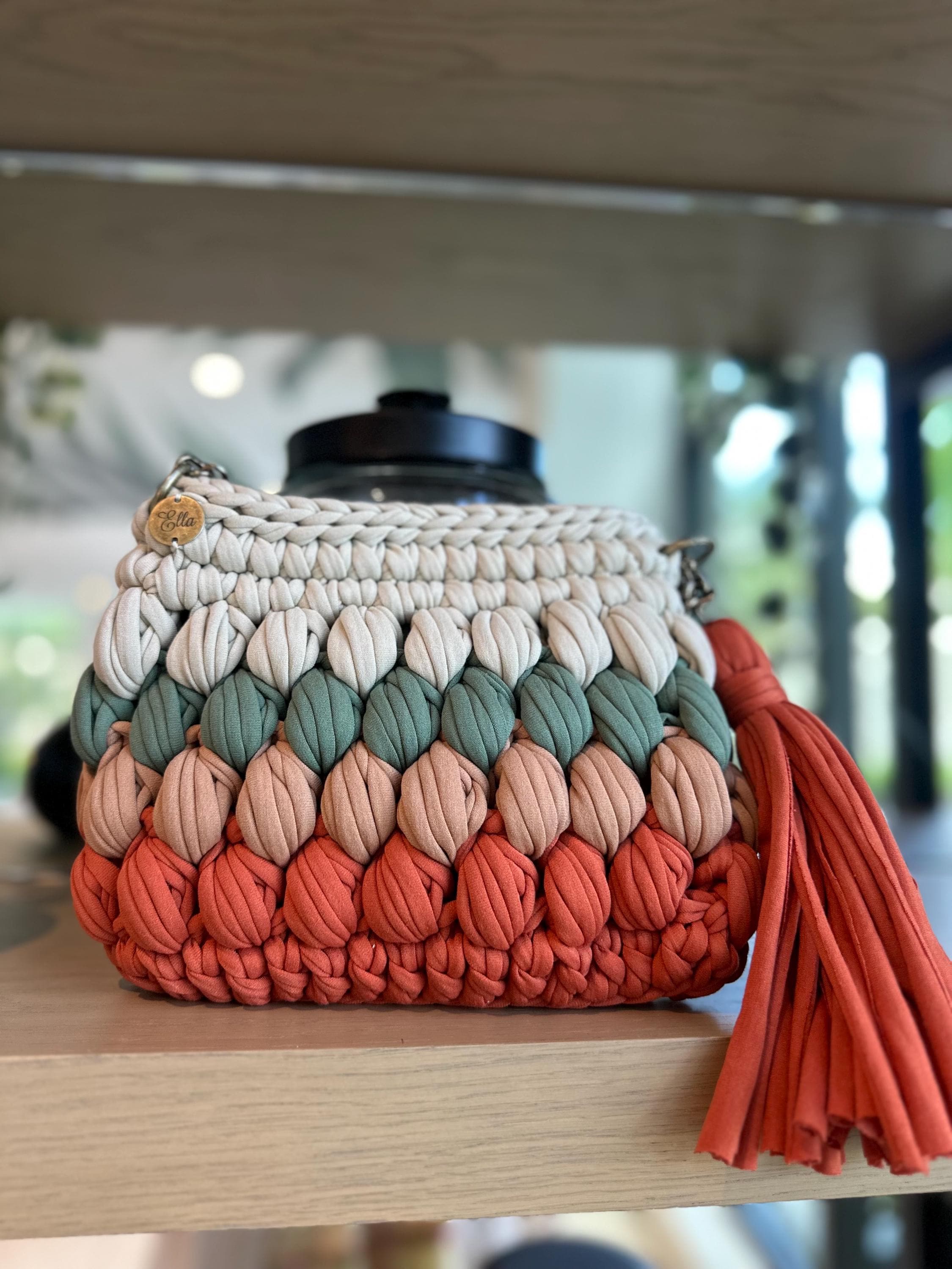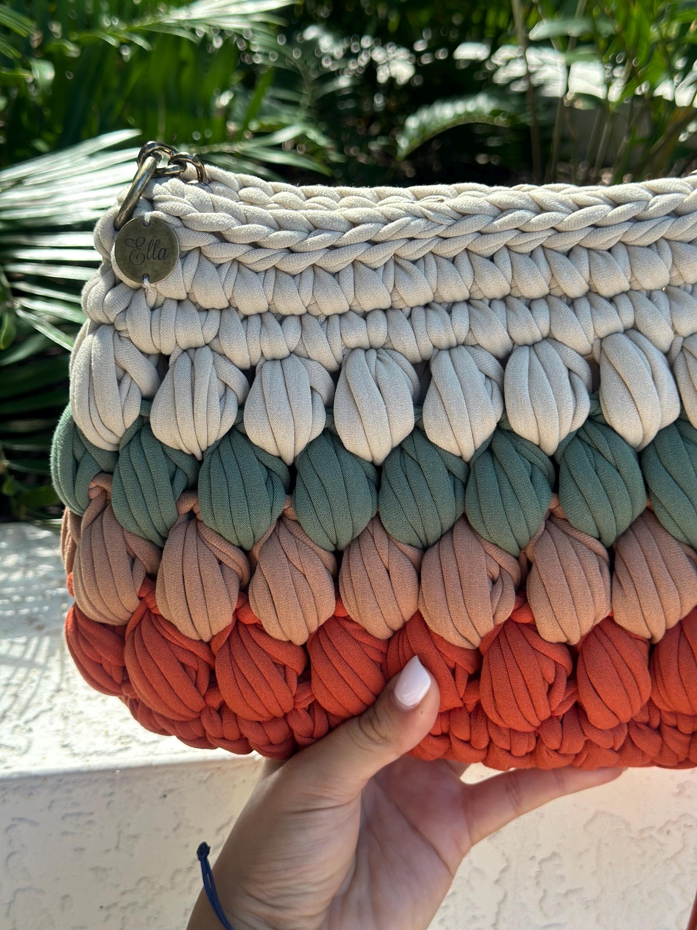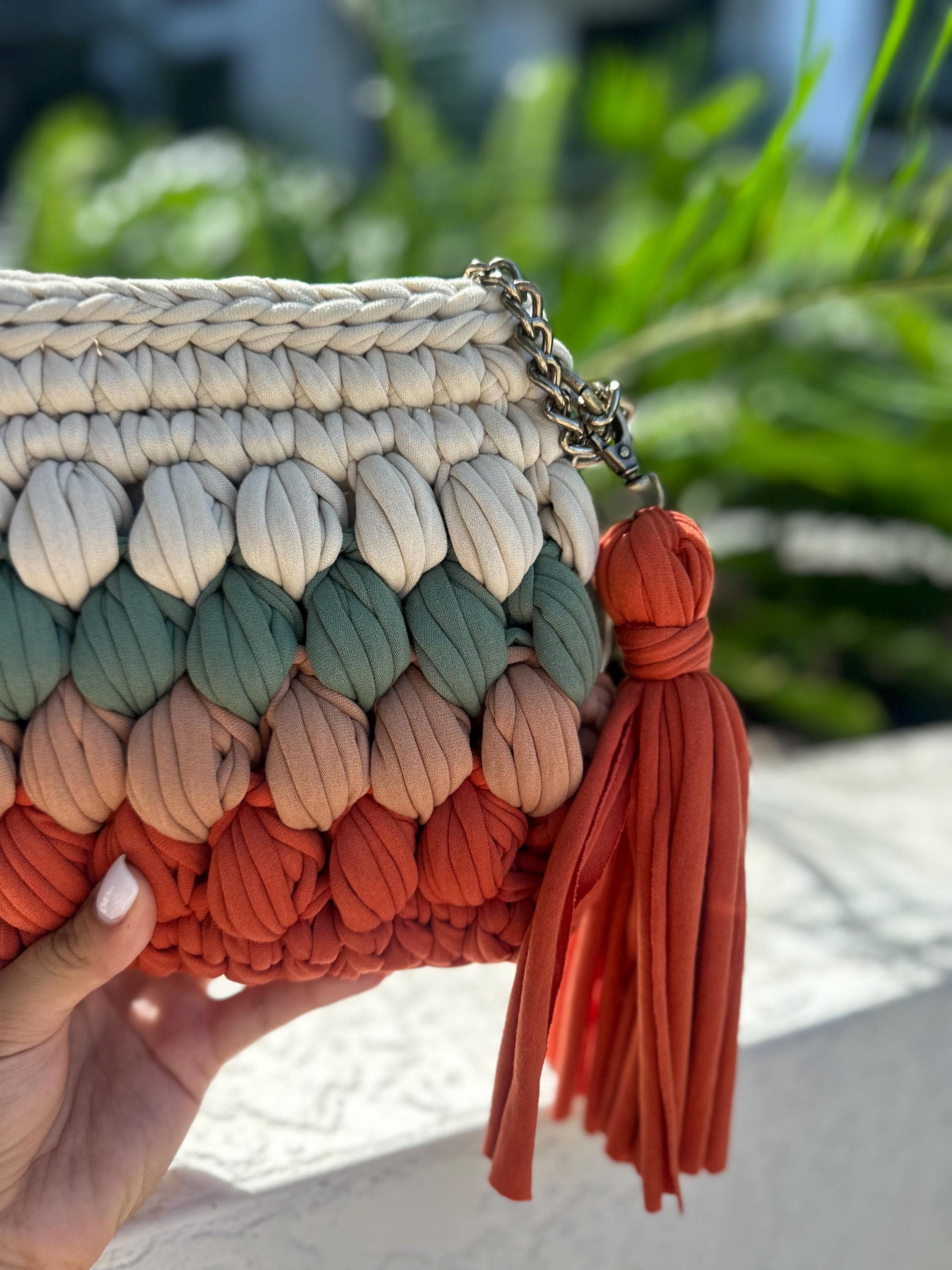 Tags: chunky knit bag, gradient handbag, handmade purse, crochet bag, ombré handbag, textured bag, boho purse, artisan bag, coral bag, terracotta purse, bubble stitch bag, handcrafted accessories