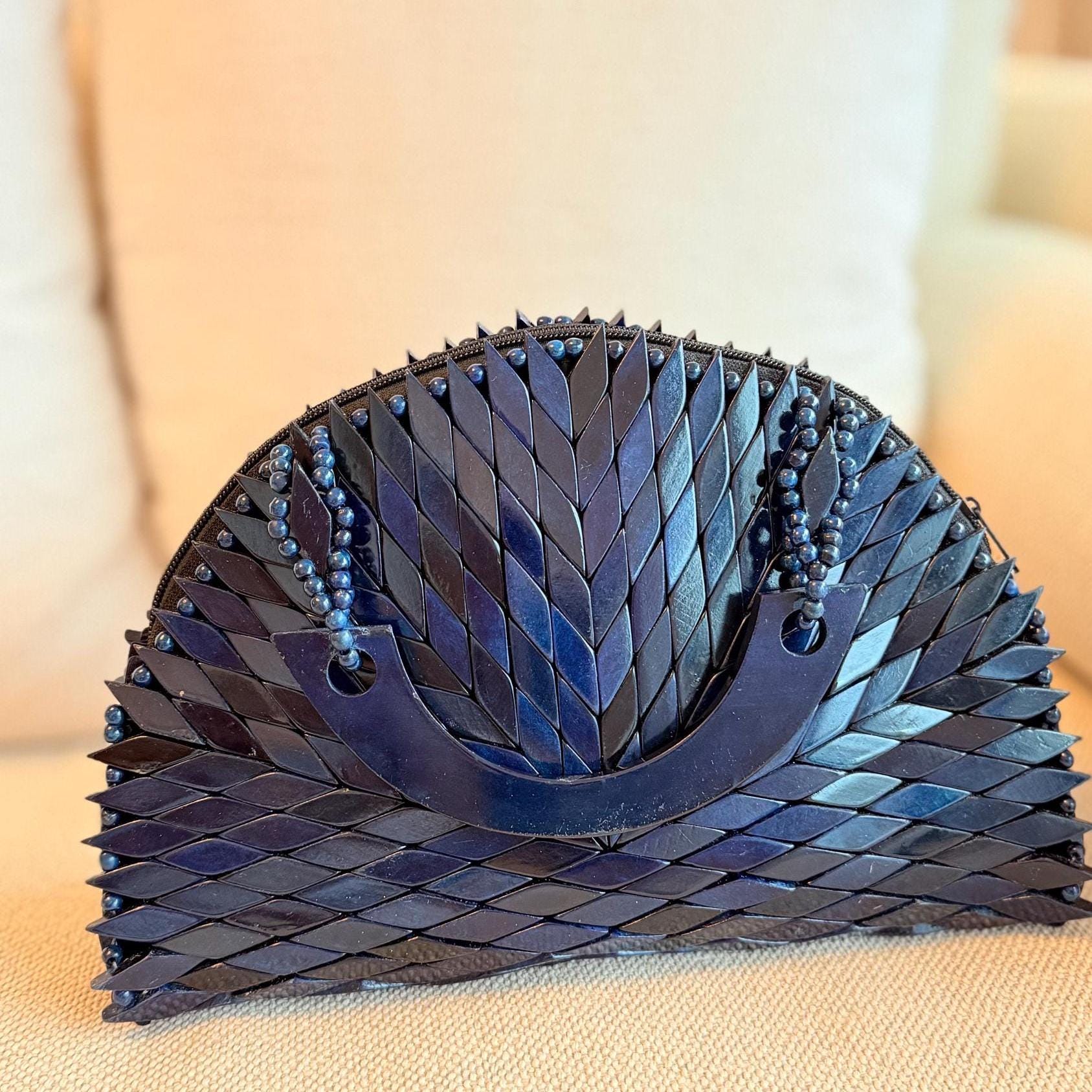 A sculptural wooden handbag crafted from hand-laid mosaic tiles in rich natural hues, finished with a curved wooden handle for a refined artisanal statement.