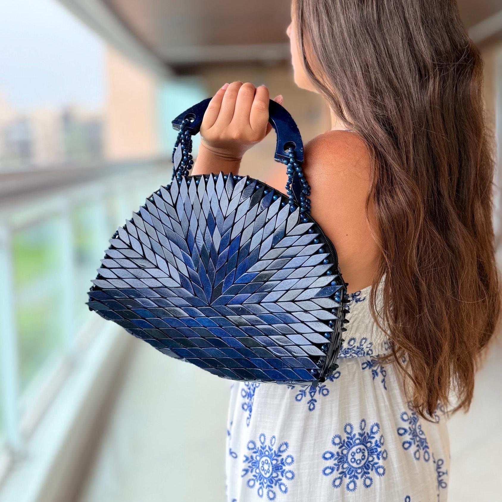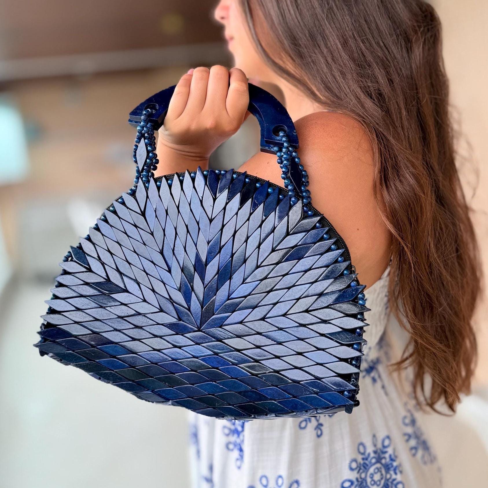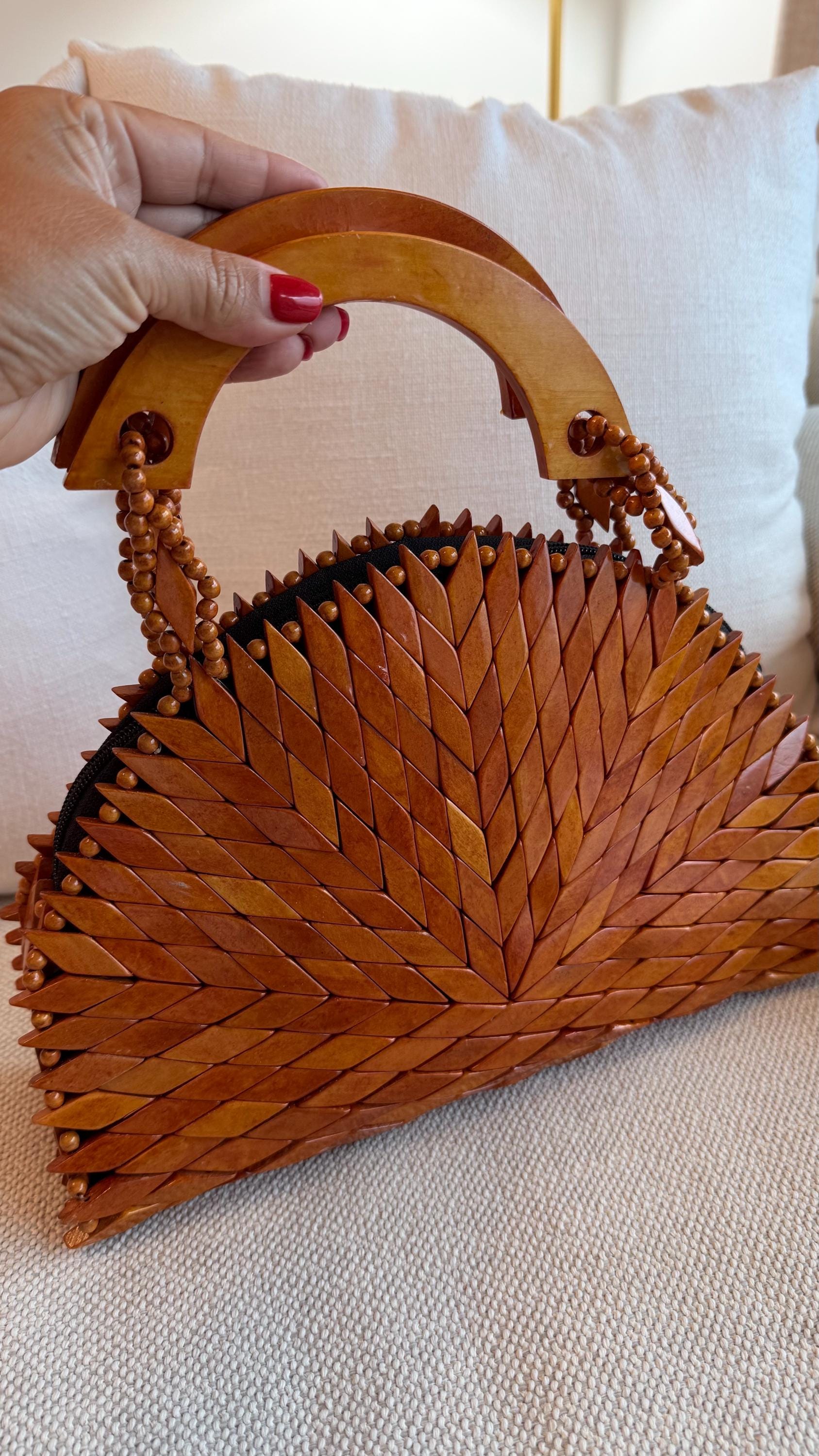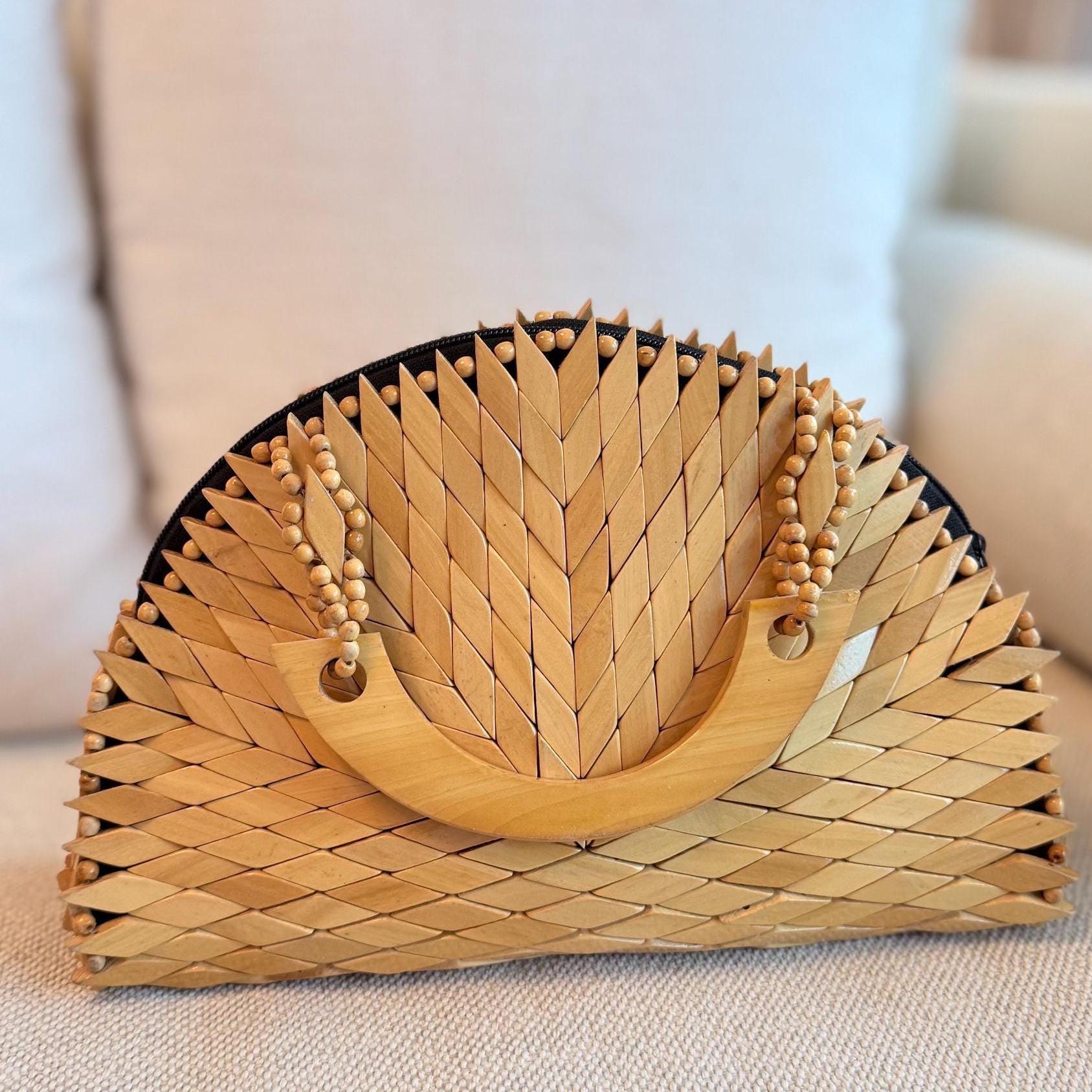 Handcrafted wooden mosaic bag with a bold chevron design and curved wooden handle—an artisanal statement piece with earthy boho charm.