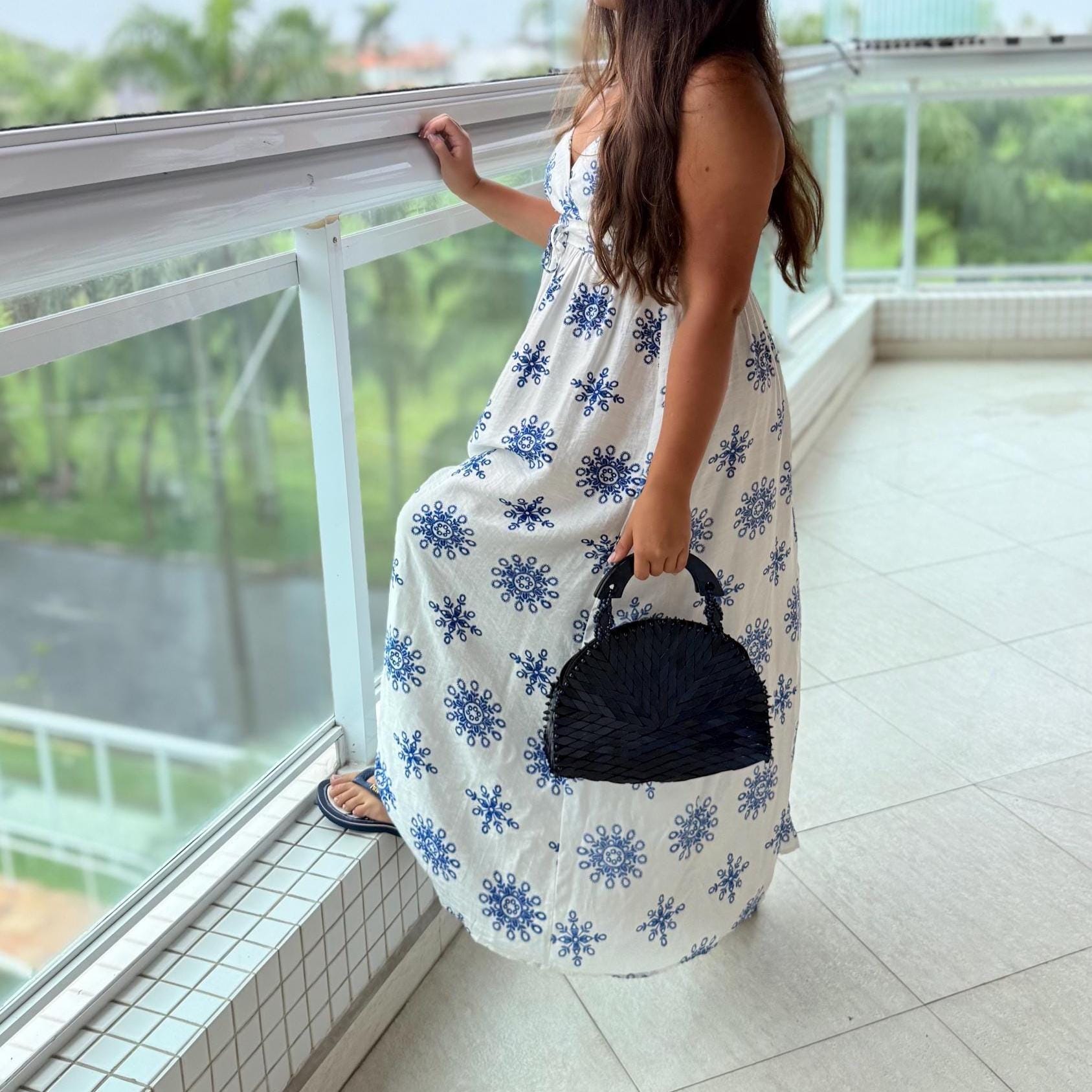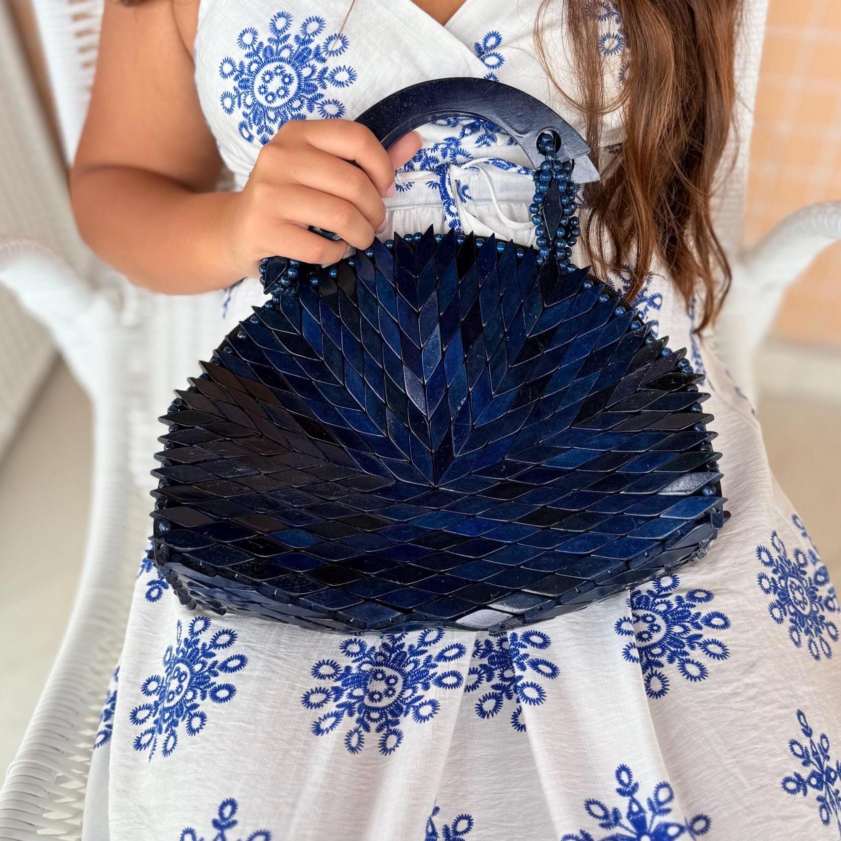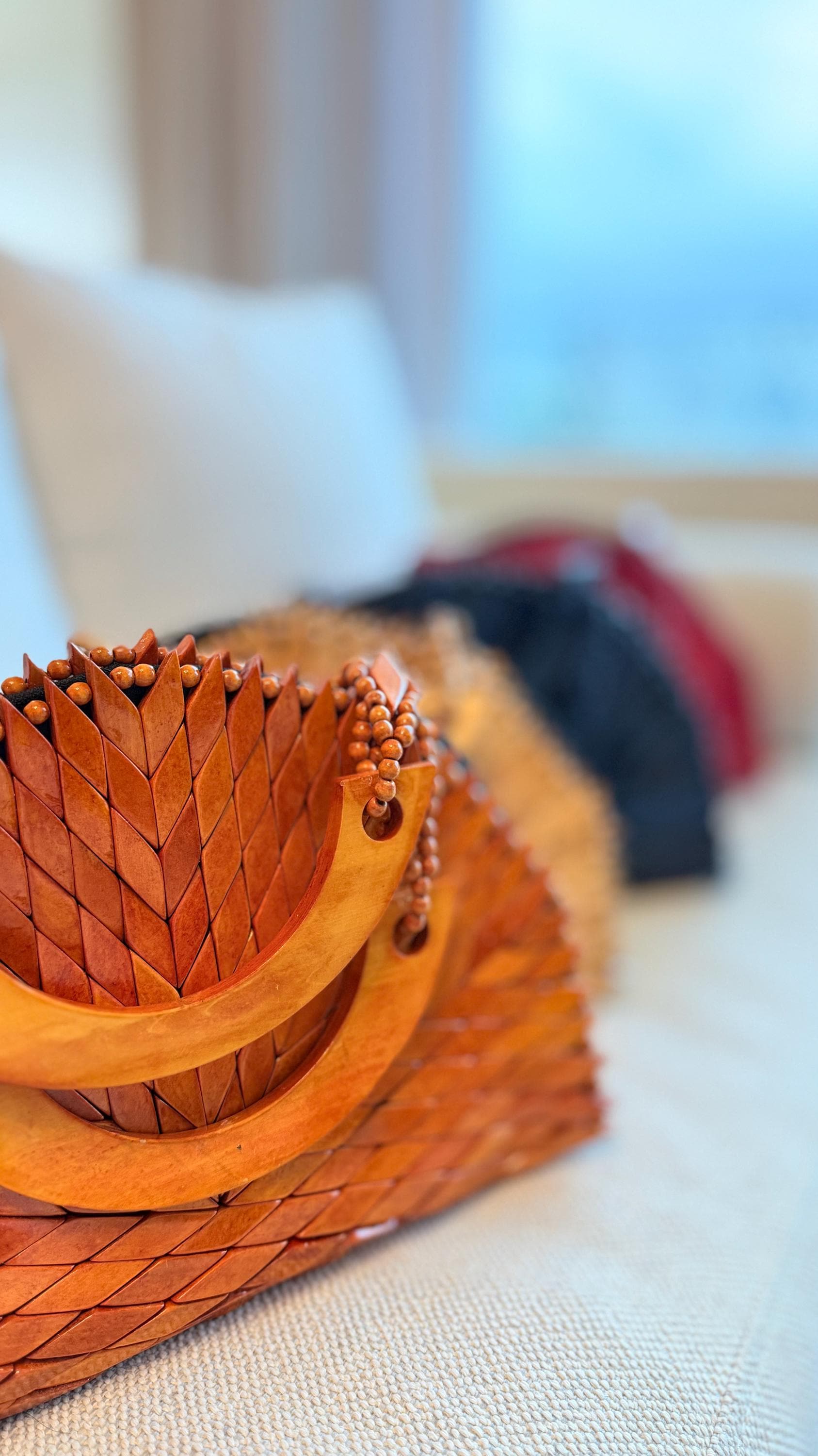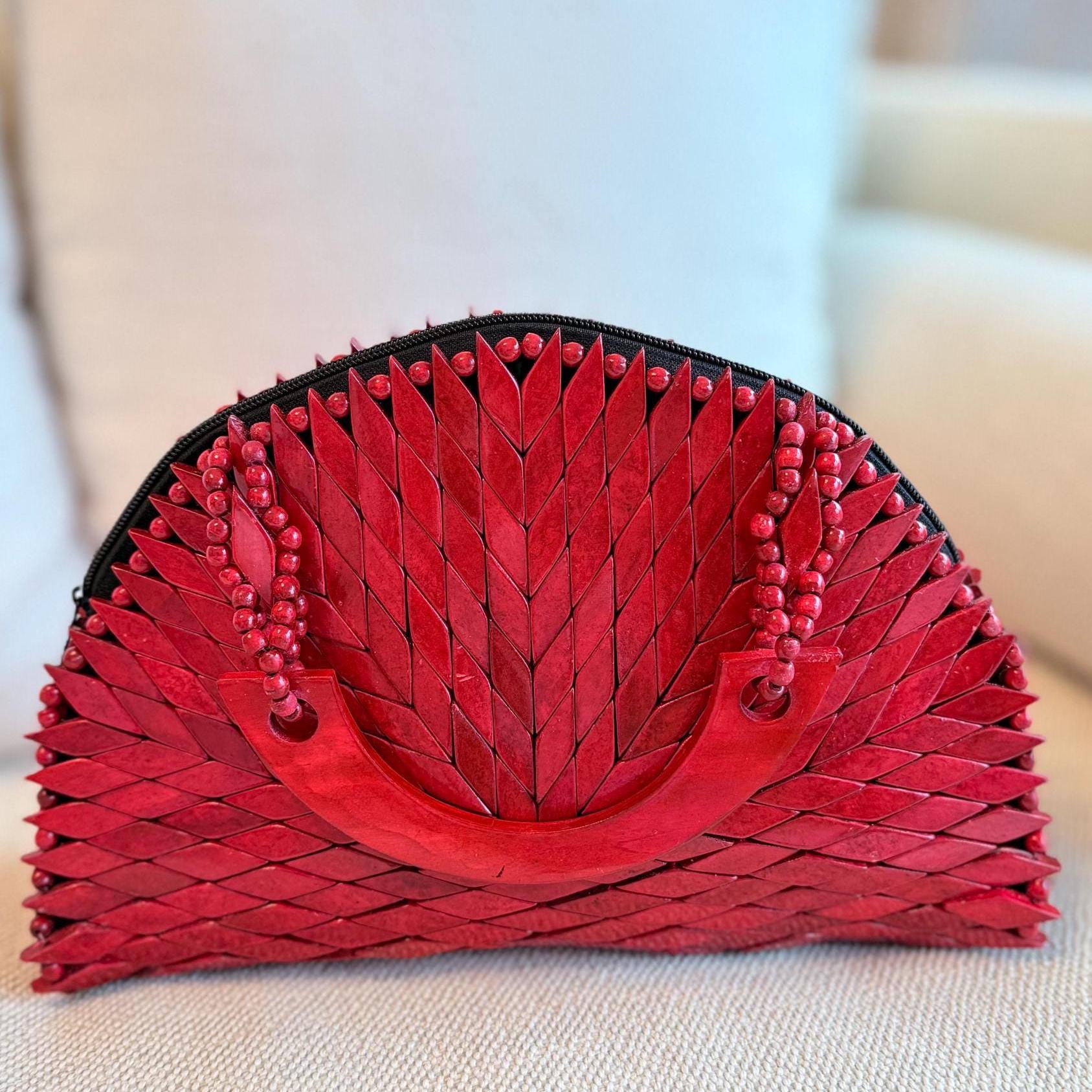 Handcrafted wooden mosaic bag with a bold chevron design and curved wooden handle—an artisanal statement piece with earthy boho charm.