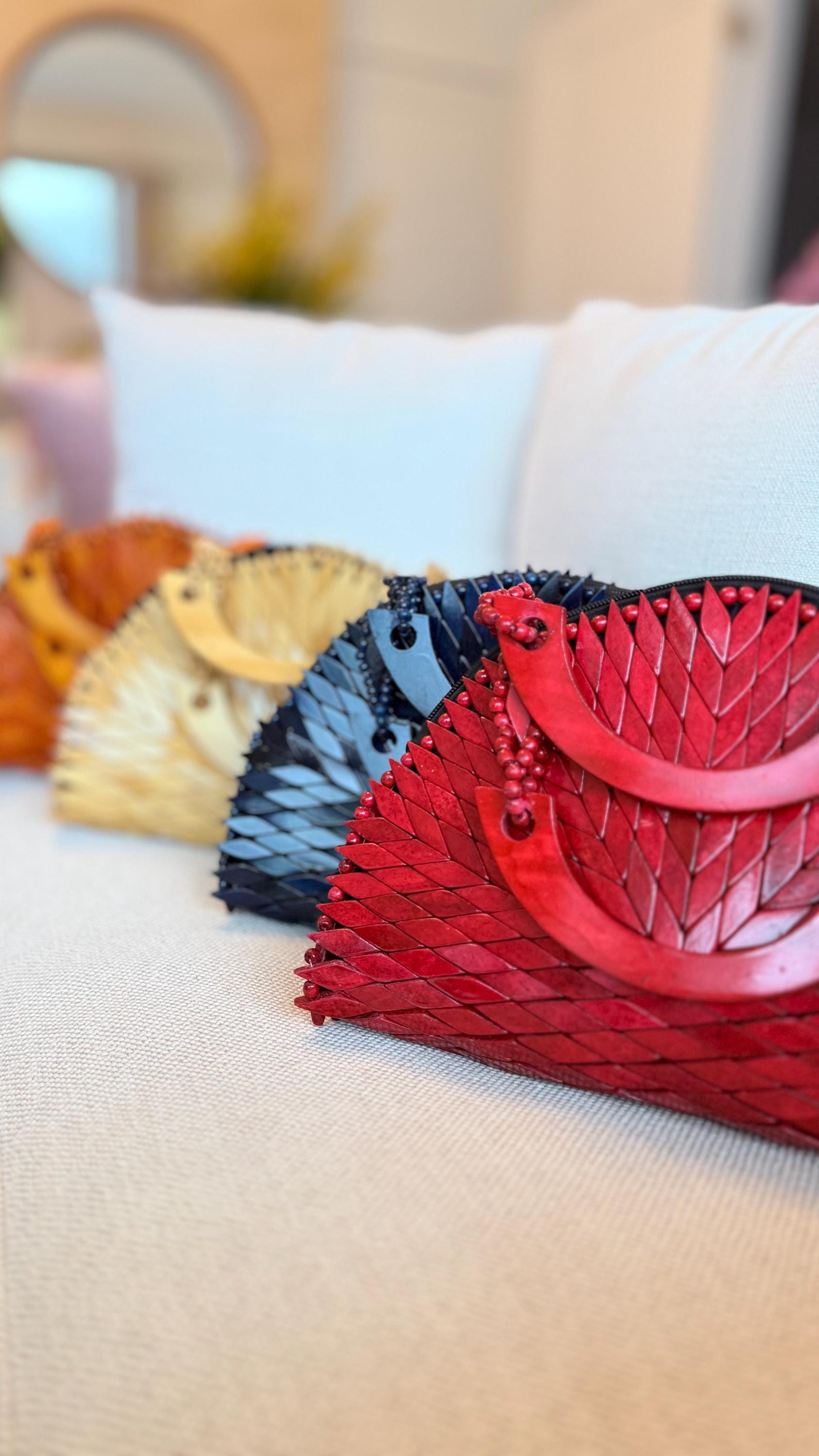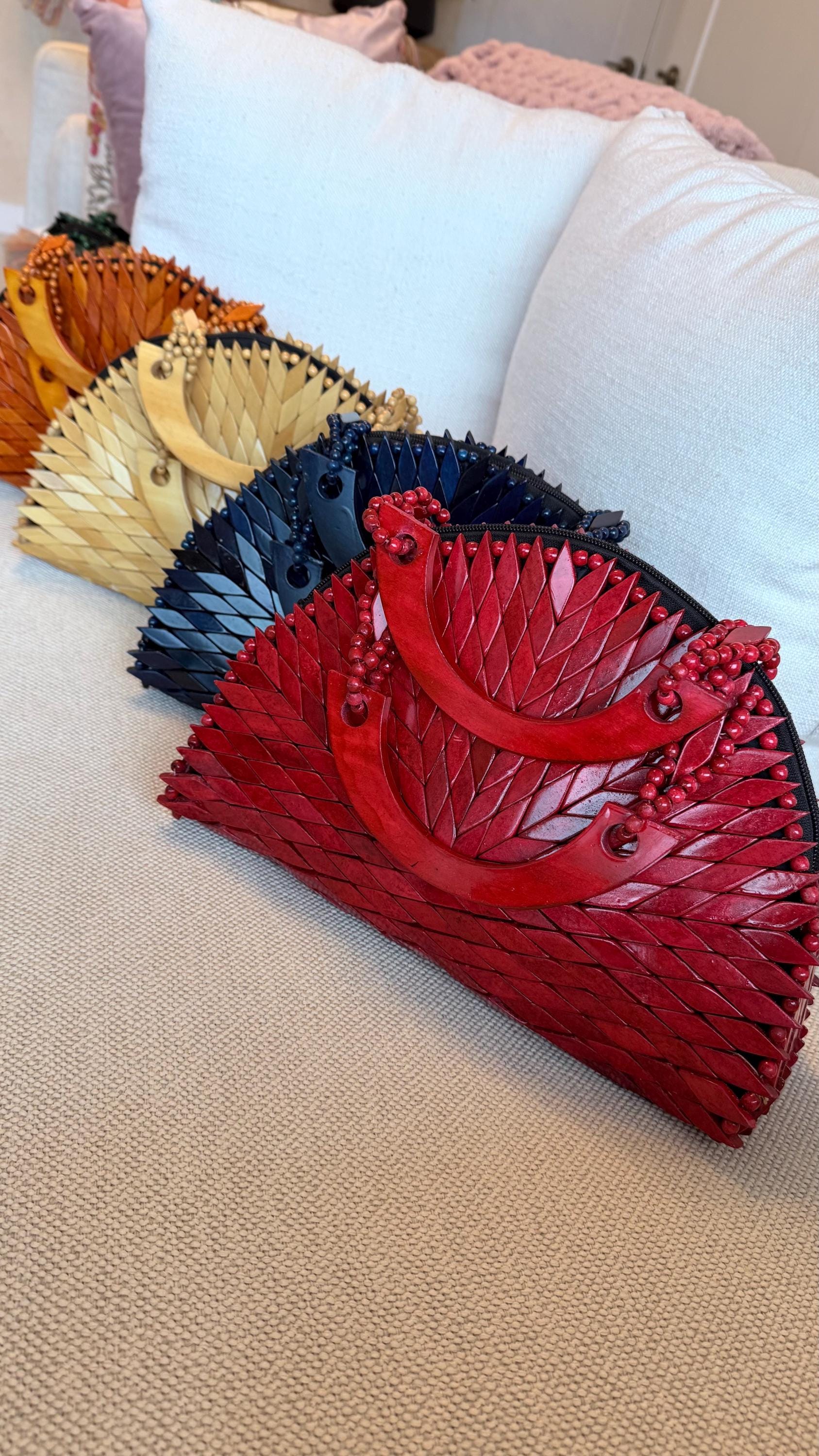 A handcrafted wooden mosaic bag featuring layered, leaf-shaped wooden tiles arranged in a striking chevron pattern. The bag showcases rich earthy tones—mustard, terracotta, forest green, and natural wood—finished with a smooth semi-circular wooden handle. Beaded accents near the handle add texture and artisanal detail, giving the piece a bold yet organic feel.