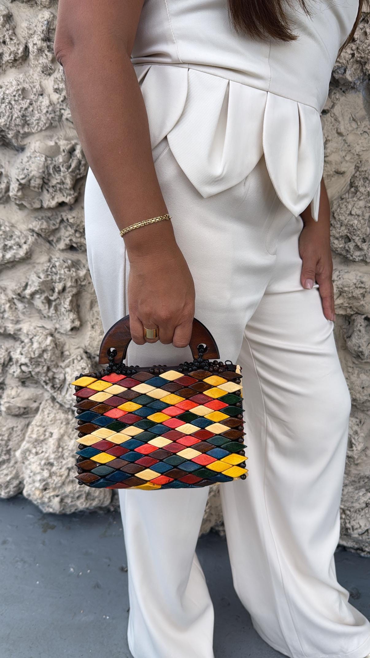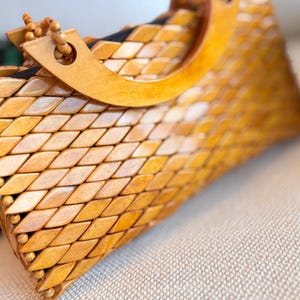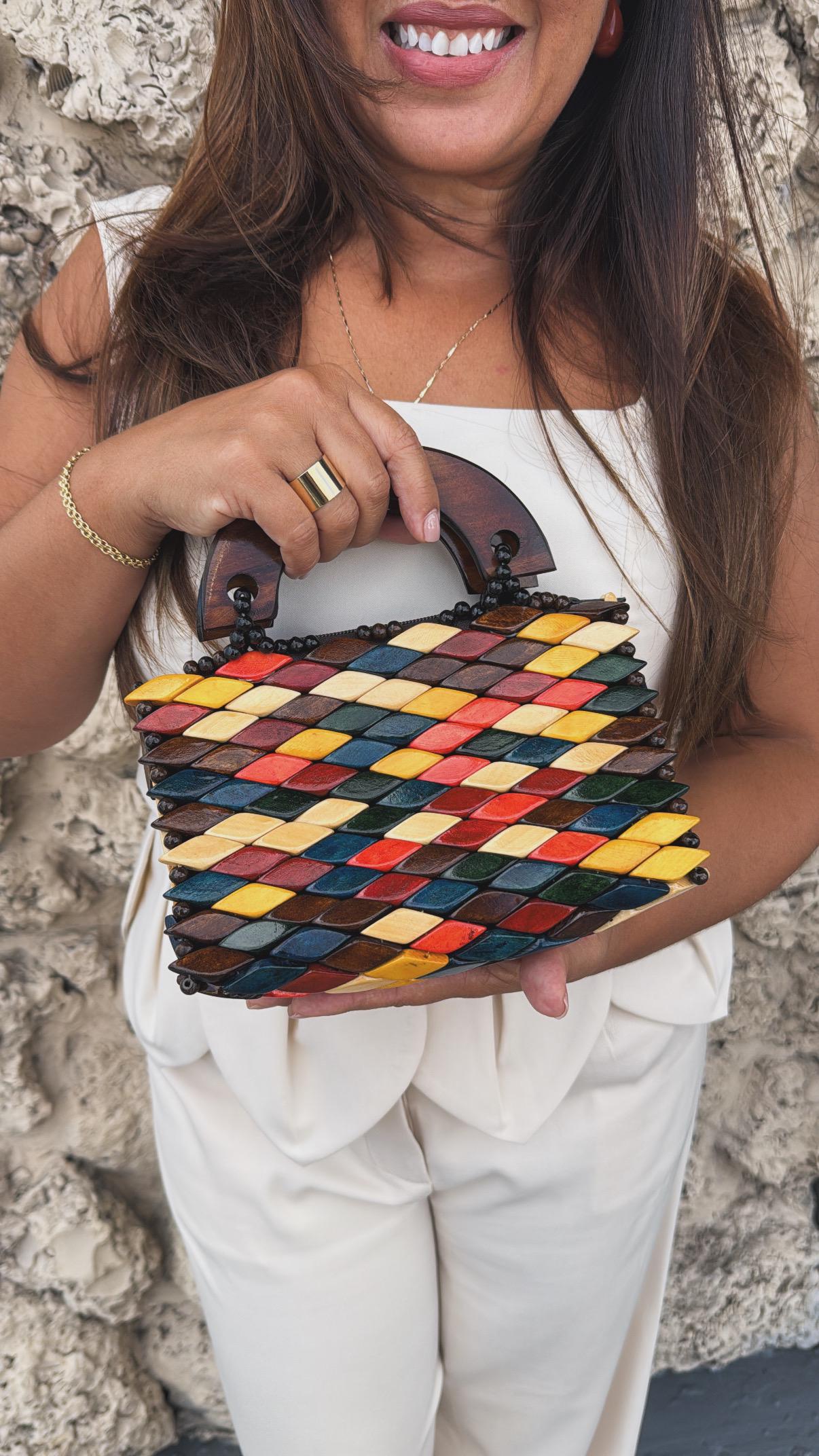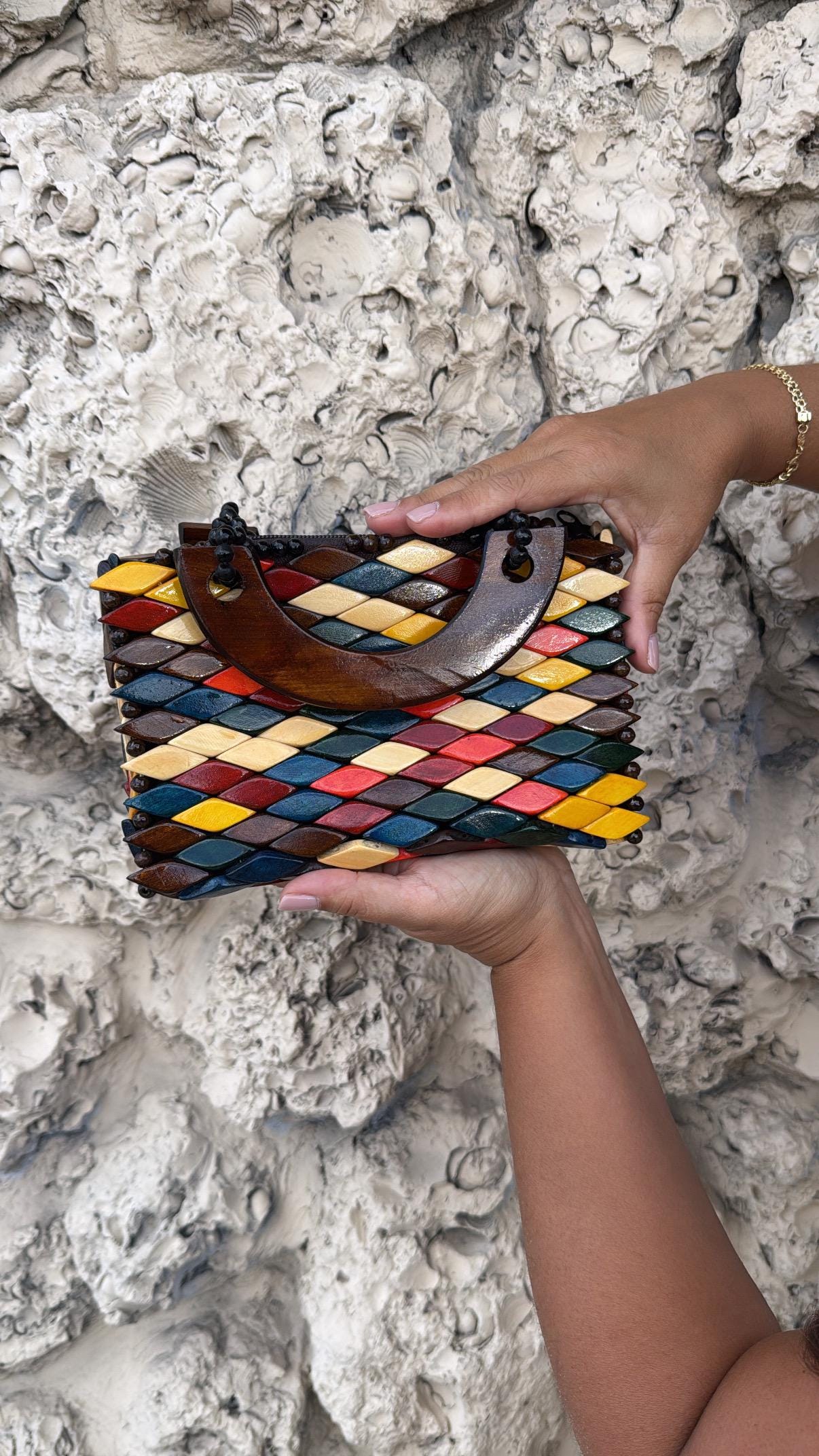 A handcrafted wooden mosaic bag featuring layered, leaf-shaped wooden tiles arranged in a striking chevron pattern. The bag showcases rich earthy tones—mustard, terracotta, forest green, and natural wood—finished with a smooth semi-circular wooden handle. Beaded accents near the handle add texture and artisanal detail, giving the piece a bold yet organic feel.