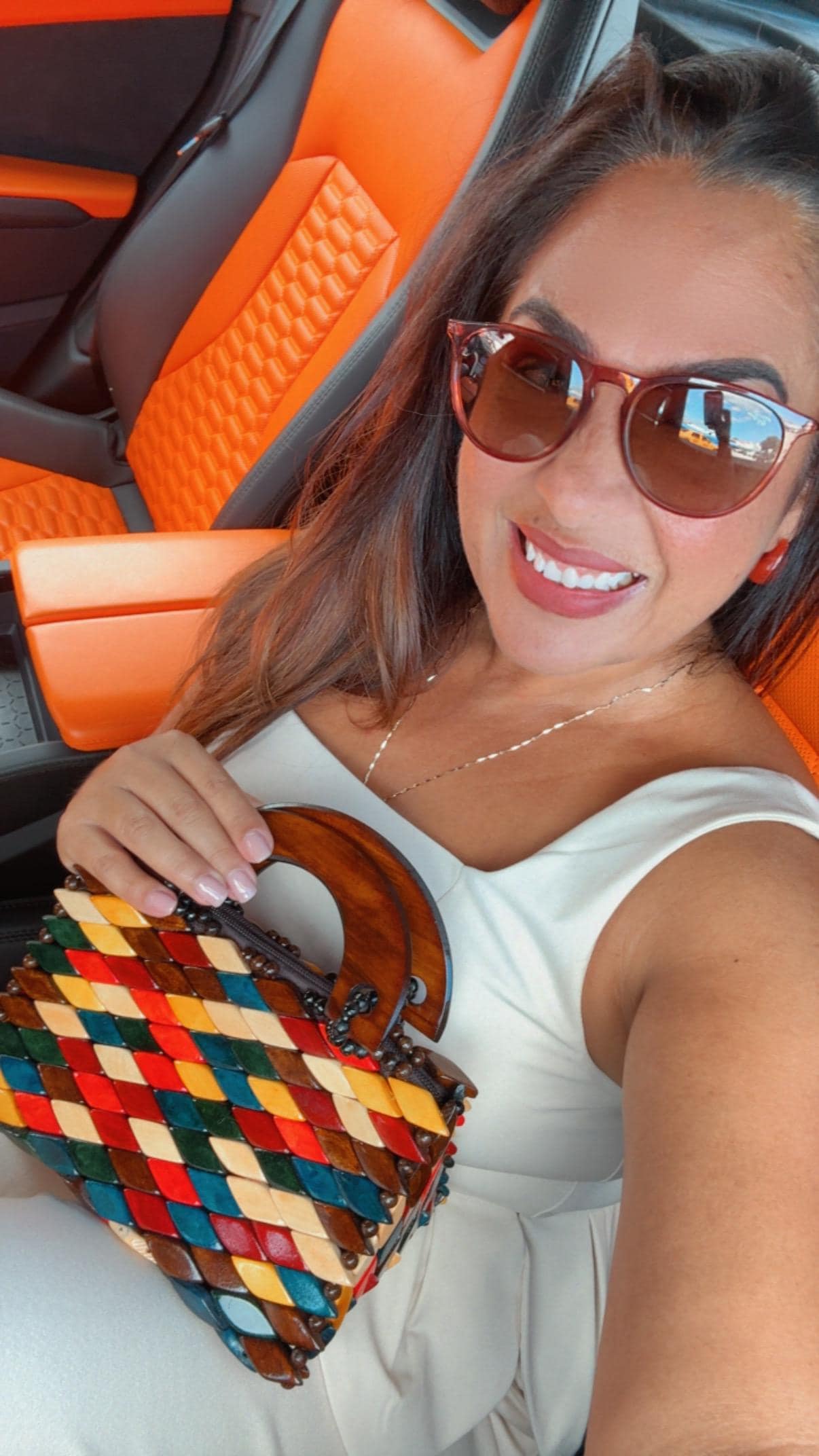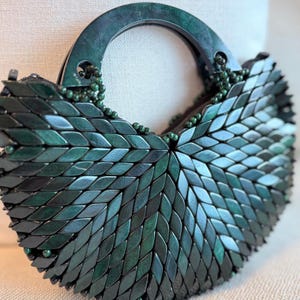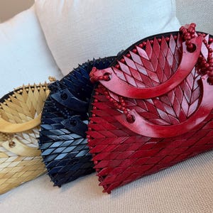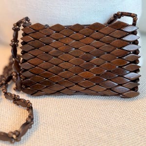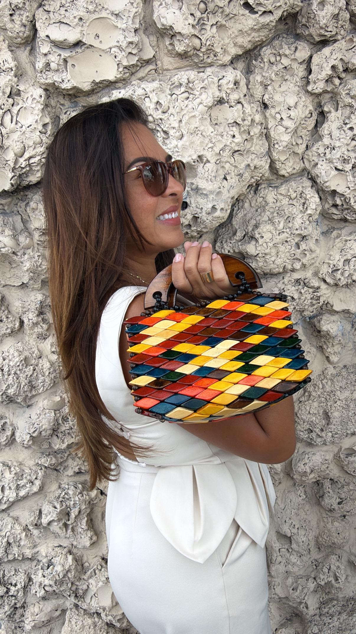 A handcrafted wooden mosaic bag featuring layered, leaf-shaped wooden tiles arranged in a striking chevron pattern. The bag showcases rich earthy tones—mustard, terracotta, forest green, and natural wood—finished with a smooth semi-circular wooden handle. Beaded accents near the handle add texture and artisanal detail, giving the piece a bold yet organic feel.