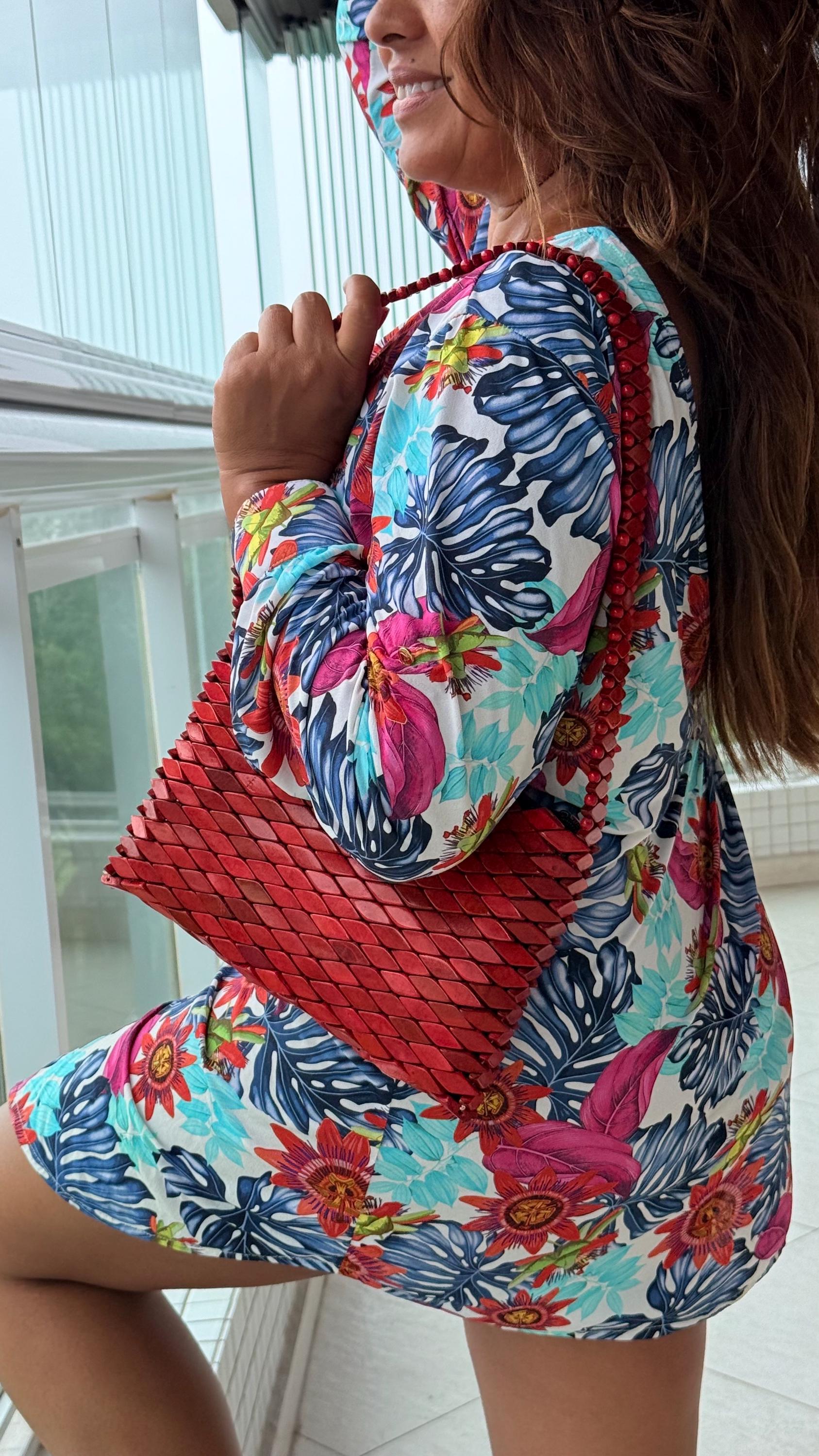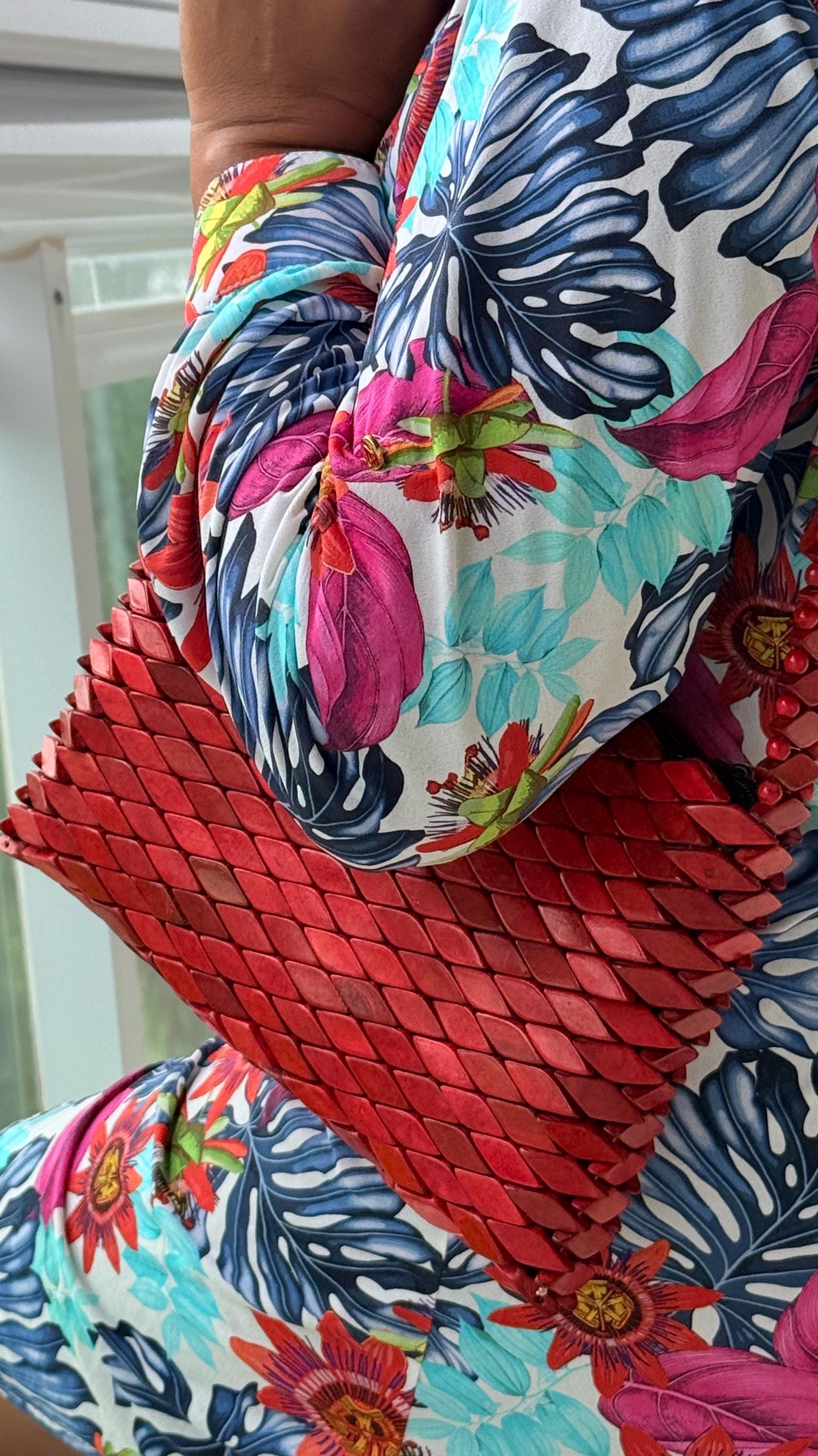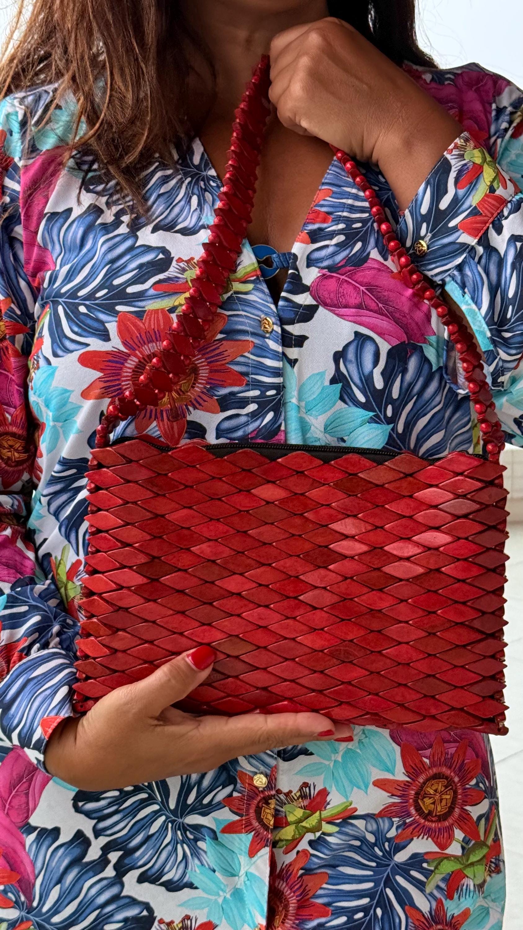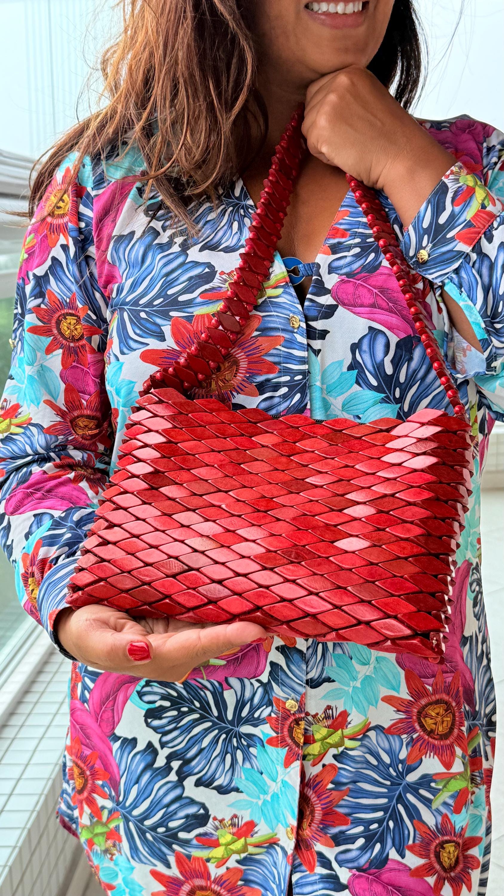 A handcrafted wooden mosaic bag featuring layered, leaf-shaped wooden tiles arranged in a striking chevron pattern. The bag showcases rich earthy tones—mustard, terracotta, forest green, and natural wood—finished with a smooth semi-circular wooden handle. Beaded accents near the handle add texture and artisanal detail, giving the piece a bold yet organic feel.