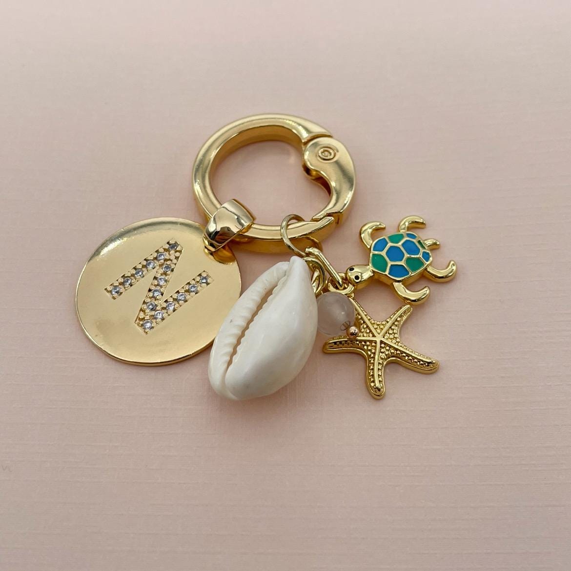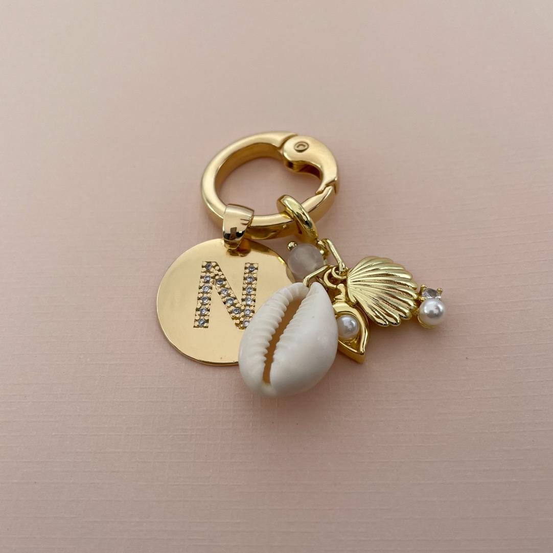 Add a touch of seaside elegance to your bag with this beautiful personalized bag charm. Crafted with gold-tone hardware, this charm features a pavé initial disc for a subtle sparkle, paired with a natural cowrie shell, delicate pearl accents, and ocean-inspired gold charms.